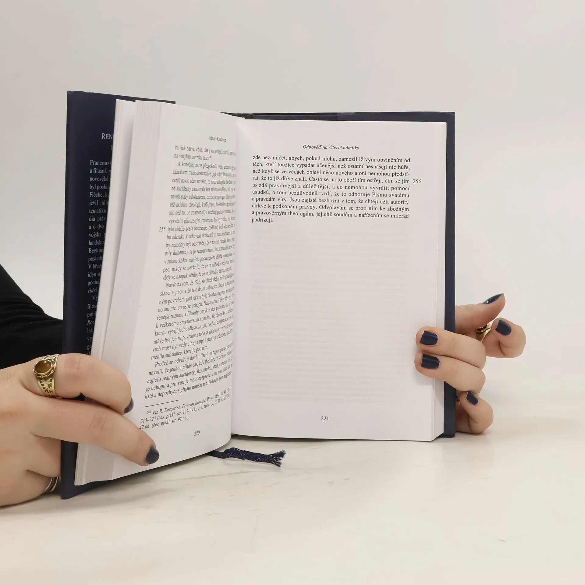 První české vydání slavné Descartovy diskuse s jeho současníky, kteří se kriticky vyjádřili k jeho spisu Meditace o první filosofii, je doplněno novým českým překladem Meditací. Tento svazek obsahuje šest souborů námitek, jež Descartovi k jeho knize sepsalo několik významných myslitelů (např. Th. Hobbes, P. Gassendi či A. Arnauld). Přeložili V. Glombíček, T. Marvan a P. Zavadil.