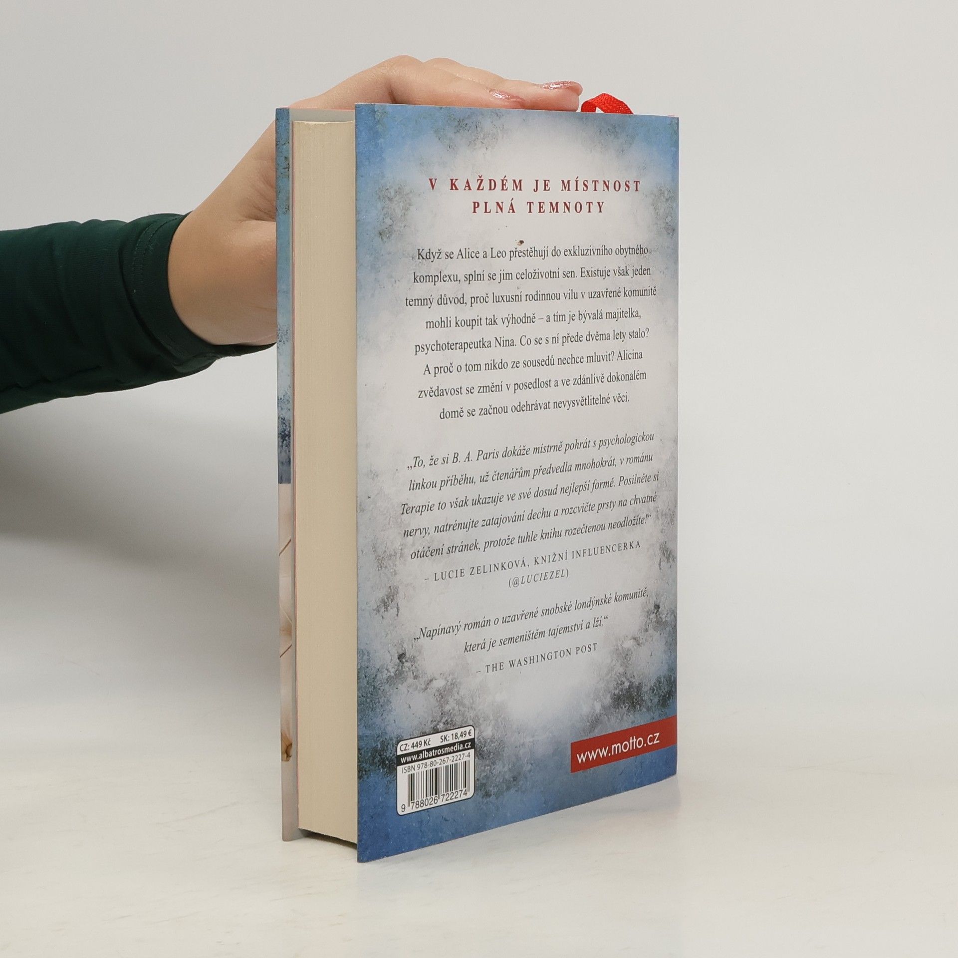 V každé duši je místnost, do které je nebezpečné vstoupit. Když se Alice a Leo přestěhují do exkluzivního obytného komplexu, splní se jim celoživotní sen. Existuje však jeden temný důvod, proč luxusní rodinnou vilu v uzavřené komunitě mohli koupit tak výhodně – a tím je bývalá majitelka, psychoterapeutka Nina. Co se s ní přede dvěma lety stalo? A proč o tom nikdo ze sousedů nechce mluvit? Alicina zvědavost se změní v posedlost a ve zdánlivě dokonalém domě se začnou odehrávat nevysvětlitelné věci. B. A. Paris, autorka bestsellerů Za zavřenými dveřmi a V pasti lží, se v Terapii vrací k tomu, v čem je nejlepší - k napínavému psychologickému thrilleru.
