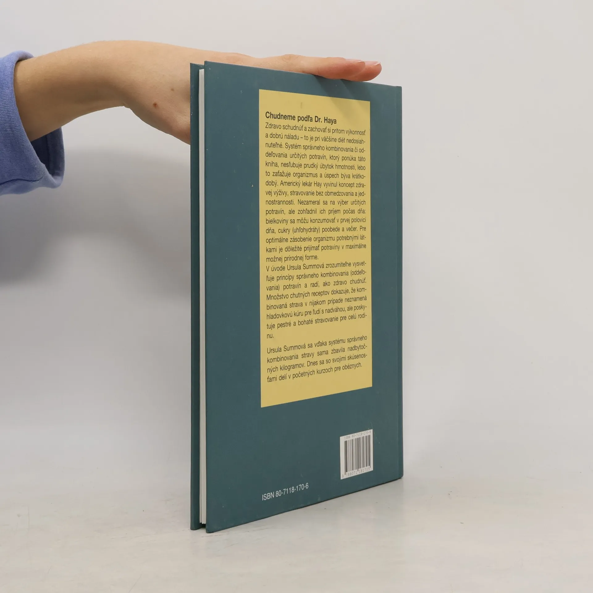 Zdravo schudnúť a zachovať si pritom výkonnosť a dobrú náladu - to je pri väčšine diét nedosiahnuteľné. Systém správneho kombinovania či oddeľovania určitých potravín, ktorý ponúka táto kniha, nesľubuje prudký úbytok hmotnosti, lebo to zaťažuje organizmus a úspech býva krátkodobý. Americký lekár Hay vyvinul koncept zdravej výživy, stravovanie bez obmedzovania a jednostrannosti. Nezameral sa na výber určitých potravín, ale zohľadnil ich príjem počas dňa: bielkoviny sa môžu konzumovať v prvej polovici dňa, cukry (uhľohydráty) poobede a večer. Pre optimálne zásobenie organizmu potrebnými látkami je dôležité prijímať potraviny v maximálne možnej prírodnej forme. V úvode Ursula Summová zrozumiteľne vysvetľuje princípy správneho kombinovania (oddeľovania) potravín a radí, ako zdravo chudnúť. Množstvo chutných receptov dokazuje, že kombinovaná strava v nijakom prípade neznamená hladovkovú kúru pre ľudí s nadváhou, ale poskytuje pestré a bohaté stravovanie pre celú rodinu. Obsah: Princíp kombinovania stravy podľa Dr. Haya, Plnohodnotné kombinovanie, Začíname chudnúť, Zásady stravovania v reštaurácii, v závodnej jedálni a na cestách, Pestré recepty, Správne kombinovanie potravín - ako na to, Pestré raňajky, Ľahké občerstvenie, Lahodné polievky, Hlavný chod z bielkovín, Hlavný chod z cukrov, Svieže šaláty, nálevy a omáčky. Druhé vydanie.