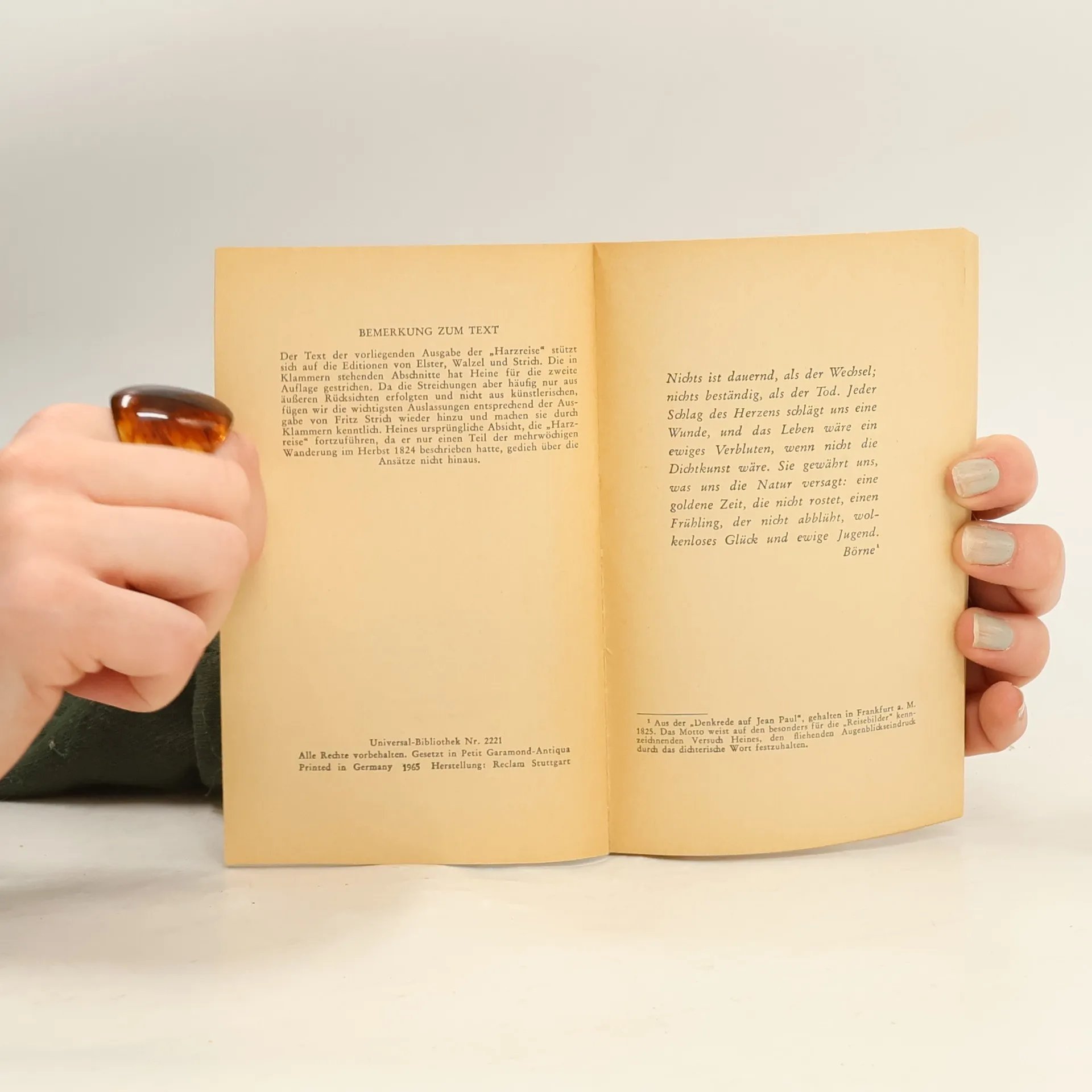 Ironisch und frech und gleichzeitig voller Gefühl – in der »Harzreise« war der typische Heine-Ton zum ersten Mal zu hören, und er hat die Leser sogleich begeistert. Naturschilderungen, komische Szenen, zeitkritische Bemerkungen, kleine Liebesabenteuer, Träume und nicht zuletzt die eingestreuten romantischen Gedichte – all das macht auch heute noch Lust, Heine auf seiner Wanderung von Göttingen über Osterode, Clausthal und Goslar bis auf den Brocken zu folgen.