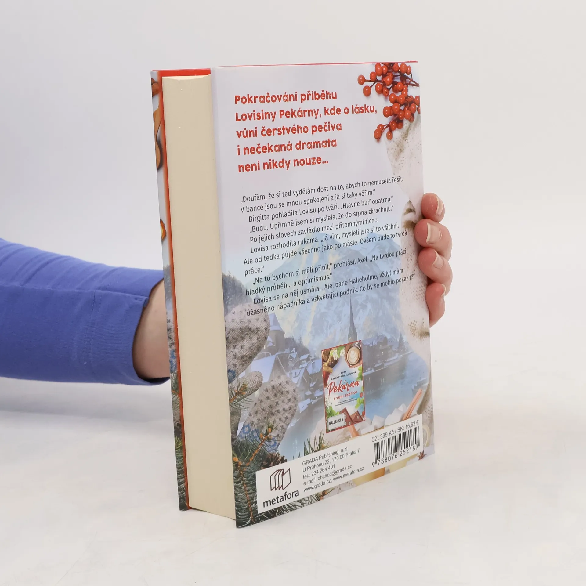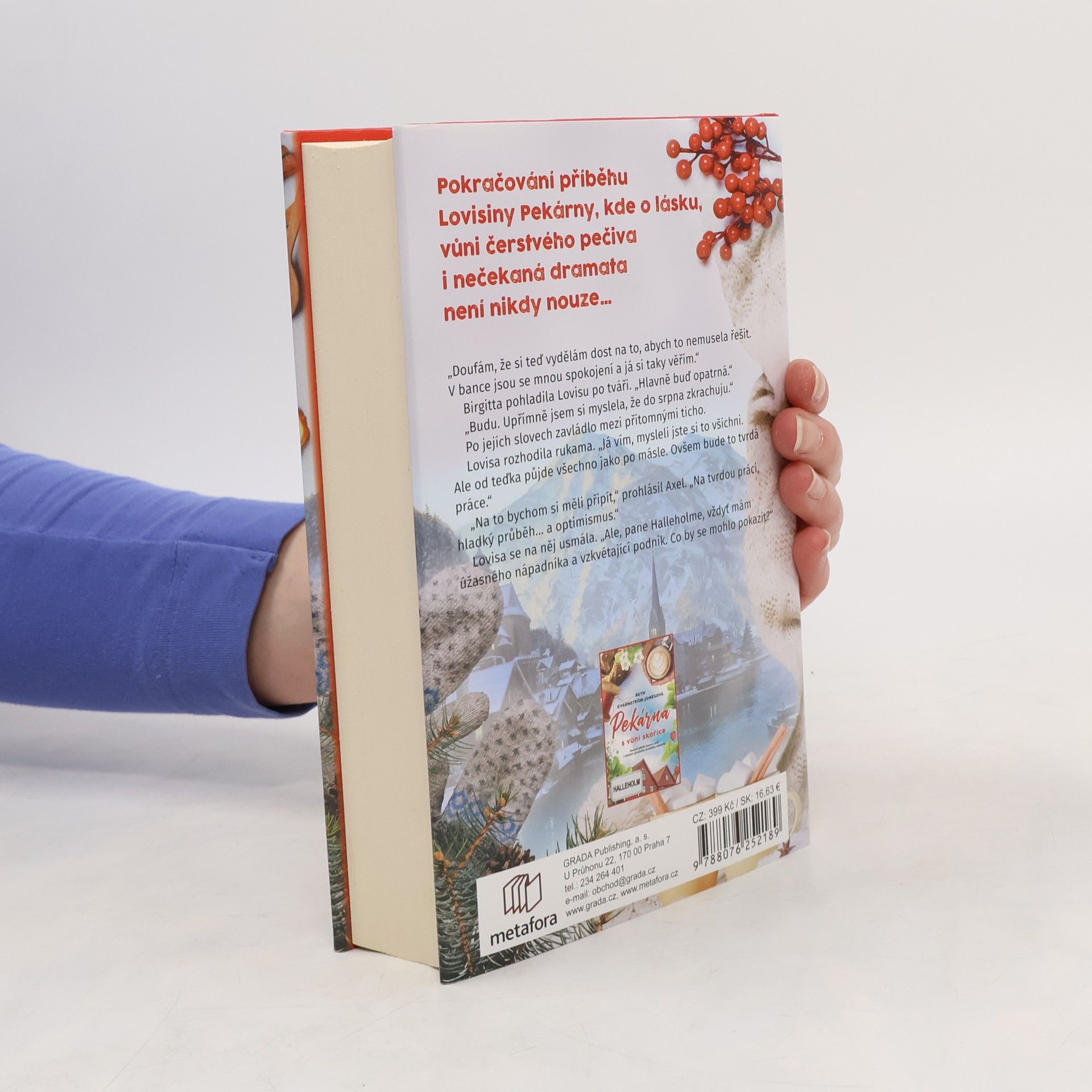 Do Halleholmu, idylického pobřežního maloměsta nedaleko Stockholmského souostroví, dorazil podzim. Život Lovisy Lindegrenové se po událostech knihy Pekárna s vůní skořice konečně ustálil. Se svou Pekárnou má velké plány a slibně se vyvíjí i její vztah s Axelem. Když však do jejich životů zasáhne nemoc, klid a pohoda jsou ty tam. Lovisu totiž přese všechno dobré, co v posledních měsících zažila, nepřestávají pronásledovat vzpomínky na sestru Cecílii, která podlehla rakovině. Jak se vypořádá s tím, že by další blízký člověk měl podobně trpět? Dokáže být svým milovaným oporou? Navíc se zdá, že nejde o jedinou krizi, která má město s blížícím se sněhem postihnout. Podaří se Algotovi, nejoblíbenějšímu halleholmskému důchodci, zdárně najít rodinu na druhé straně zeměkoule? Jak si má Lovisa vysvětlit záhadné chování své nejlepší přítelkyně Rebeccy? A dokáže se konečně vyrovnat se ztrátou Cecílie a napravit vztah s Axelem? Pekárna plná života je pokračováním vřelého rodinného příběhu, odvíjejícího se v kulisách malebného městečka Halleholm, v němž se tradice a staré křivdy setkávají s moderní romancí a intrikami – to vše nad čerstvými skořicovými šneky a šálkem horké čokolády.