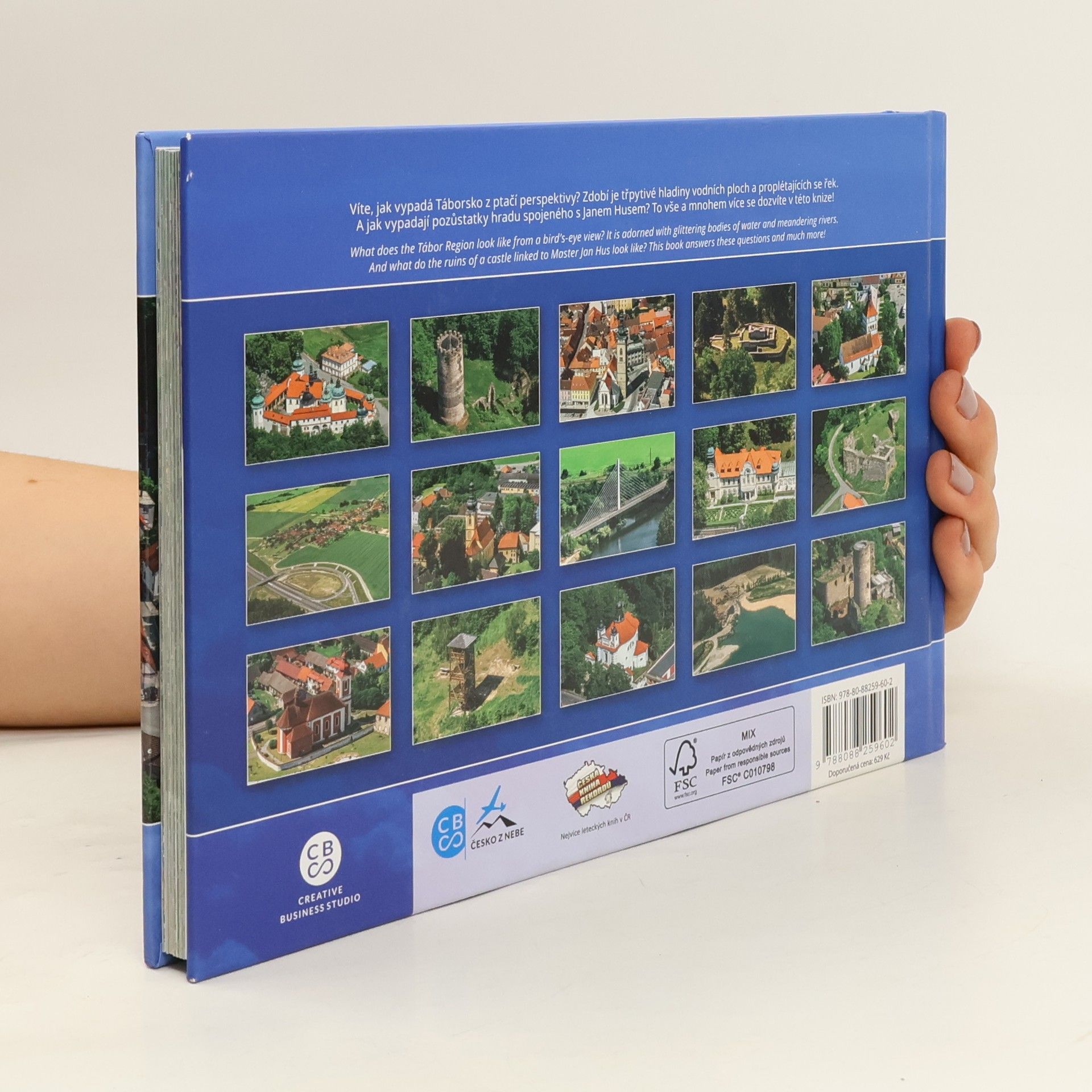 "Víte, jak vypadá Táborsko z ptačí perspektivy? Zdobí je třpytivé hladiny vodních ploch a proplétajících se řek. A jak vypadají pozůstatky hradu spojeného s Janem Husem? To vše a mnohem více se dozvíte v této knize! Prohlédněte si neobvyklým pohledem z nebe historické jádro Tábora, Bechyňskou bránu, poutní místo - kostel Nanebevzetí Panny Marie v Klokotech, Harfový most přes rybník Jordán, řeku Lužnici, pískovnu u Veselí nad Lužnicí, Vlkovský rybník, Soběslav s okrouhlou věží Hláska, obec Dírnou, Chrbolín, Šebířov, Hlasivo, Bečici, Řepeč, města Planá nad Lužnicí, Sezimovo Ústí, Chýnov, Jistebnice, Bechyně, vilu Edvarda Beneše v Sezimově Ústí, zříceninu Kozí hrádek nebo Borotín, zámek Jistebnice nebo Bechyně a spoustu dalších zajímavých míst v tomto regionu."