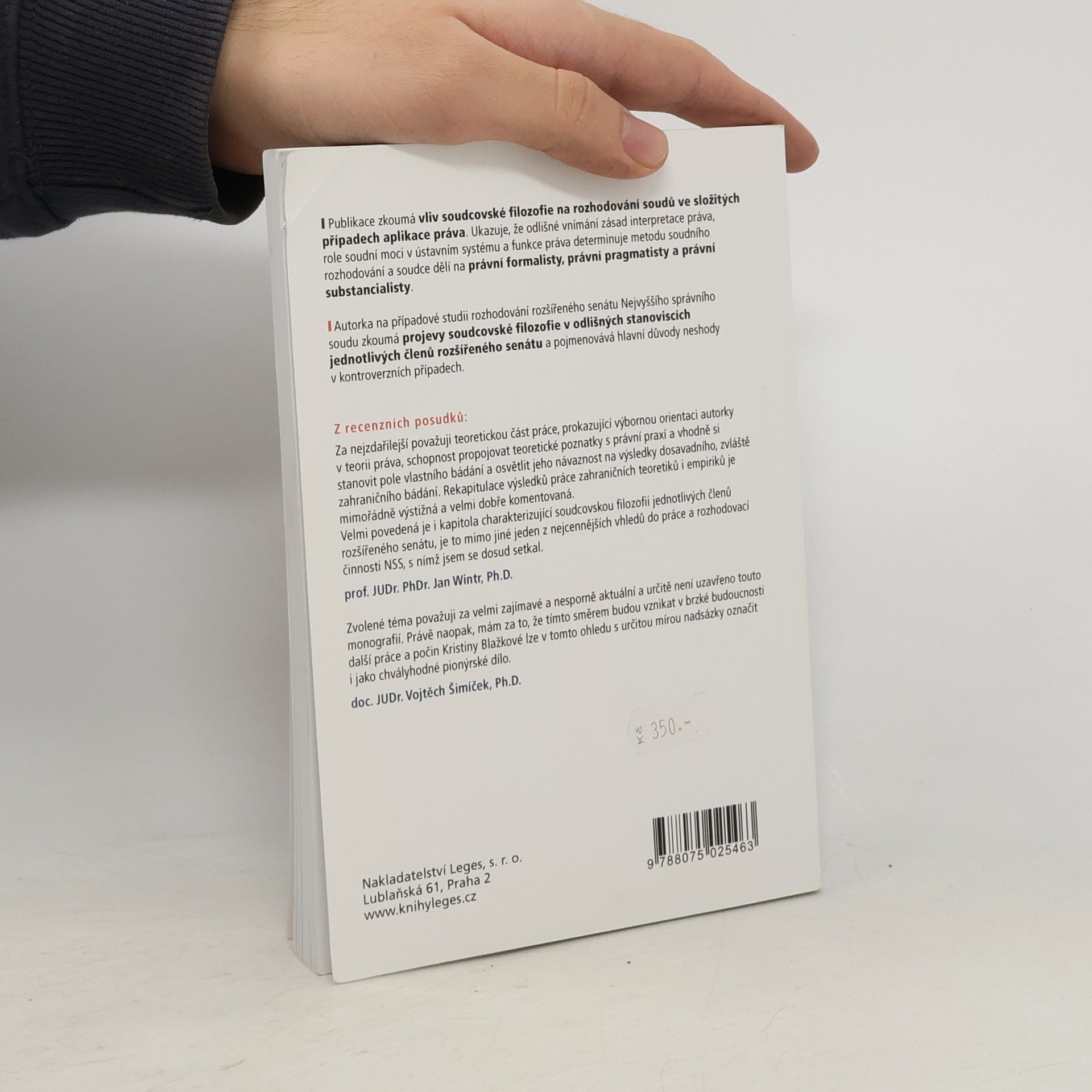 Publikace zkoumá vliv soudcovské filozofie na rozhodování soudů ve složitých případech aplikace práva. Ukazuje, že odlišné vnímání zásad interpretace práva, role soudní moci v ústavním systému a funkce práva determinuje metodu soudního rozhodování a soudce dělí na právní formalisty, právní pragmatisty a právní substancialisty. Autorka na případové studii rozhodování rozšířeného senátu Nejvyššího správního soudu zkoumá projevy soudcovské filozofie v odlišných stanoviscích jednotlivých členů rozšířeného senátu a pojmenovává hlavní důvody neshody v kontroverzních případech.