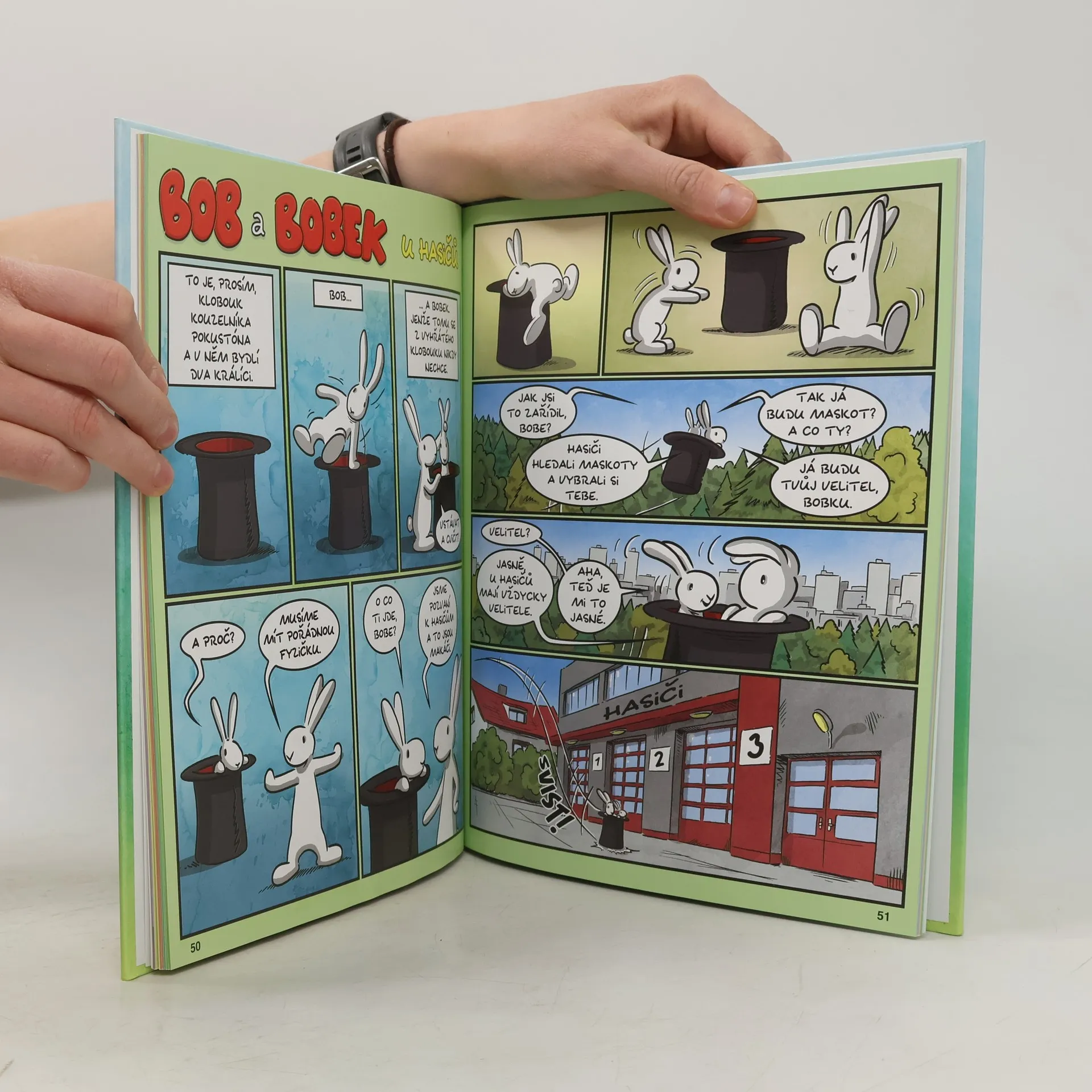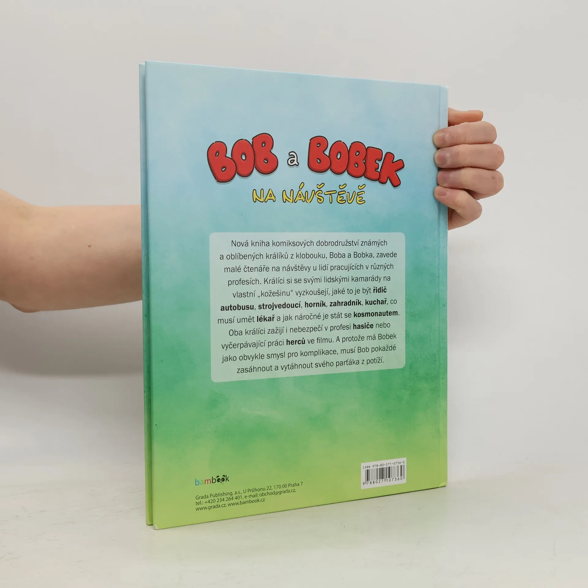 Nová kniha komiksových dobrodružství známých a oblíbených králíků z klobouku, Boba a Bobka, zavede malé čtenáře na návštěvy u lidí pracujících v různých profesích. Králíci si se svými lidskými kamarády na vlastní „kožešinu“ vyzkoušejí, jaké to je být řidič autobusu, strojvedoucí, zahradník, kuchař, co musí umět lékař a jak náročné je stát se kosmonautem. Oba králíci zažijí i nebezpečí v profesi hasiče nebo vyčerpávající práci herců ve filmu. Každé ráno se Bobkovi nechce vstávat, a tak ho Bob musí motivovat stále novými a novými zážitky. A protože má Bobek jako obvykle smysl pro komplikace, musí Bob pokaždé zasáhnout a vytáhnout svého parťáka z potíží.