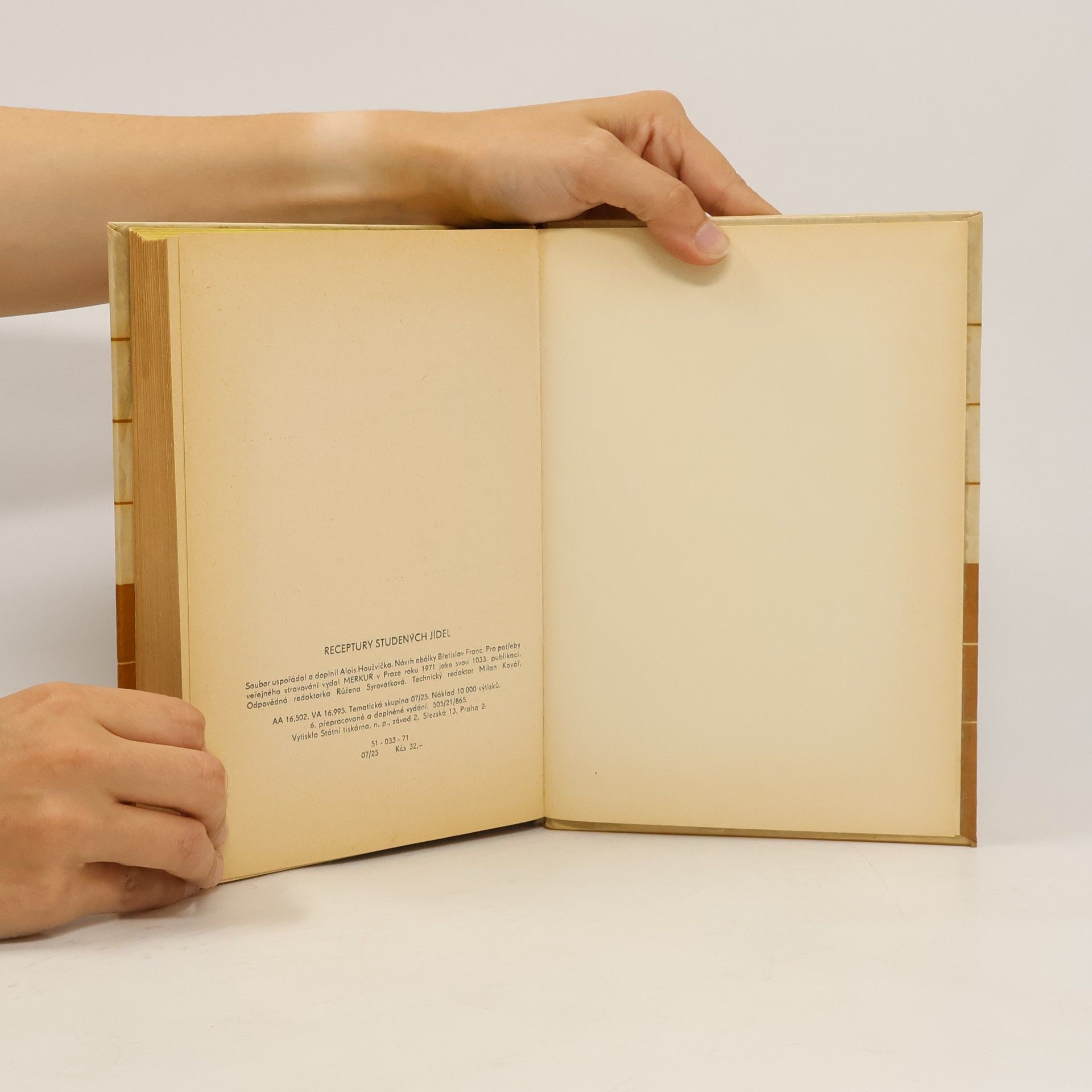 Pro potřeby veřejného stravování. 6. přepracované a doplněné vydání Příručka v novém vydání je podstatně přepracována. Proti předešlému vydání spotřebních norem vypouští receptury jídel, pro které nejsou k dosažení vhodné suroviny, a zahrnuje nové druhy žádaných výrobků. Předpisy jsou přečíslovány a nově jsou uspořádány skupiny výrobků. Současnosti lépe odpovídají i změny výtěžnosti rybích a dalších výrobků. Úvodní část přináší seznam receptur, tabulky ztrát i odpadů při zpracování a vhodných záměn surovin. Následují předpisy, z nichž každý obsahuje přesný rozpočet na 100 jídel, váhu 1 porce a výrobní postup.