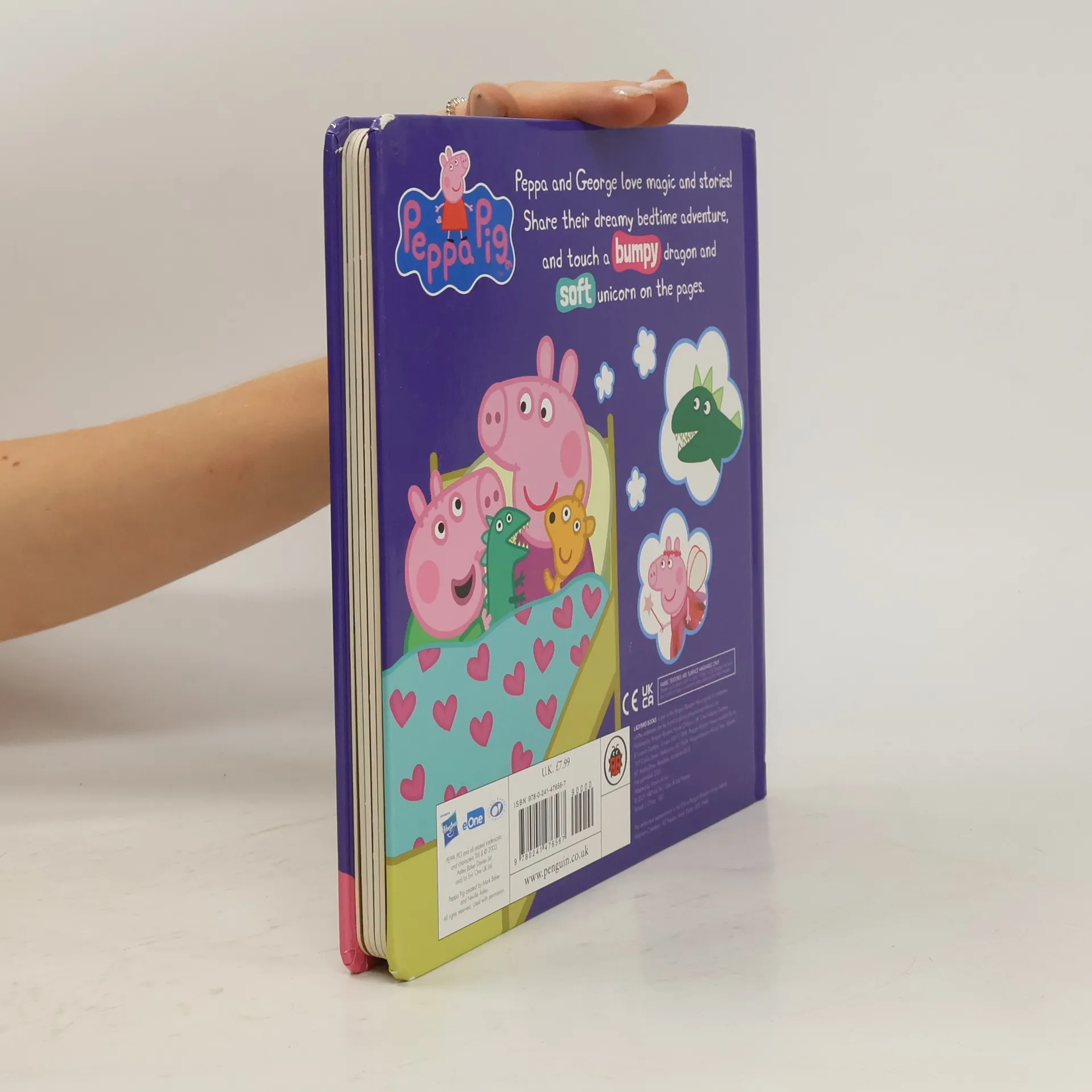 Peppa and George love magical creatures! Peppa and George are having a sleepover at Granny and Grandpa Pig's house. Granny Pig is reading a bedtime story. Share their dreamy bedtime adventure, and touch a shimmery mermaid, bumpy dragon, squishy narwhal, shiny fairy wings and soft unicorn in this fun touch-and-feel book.