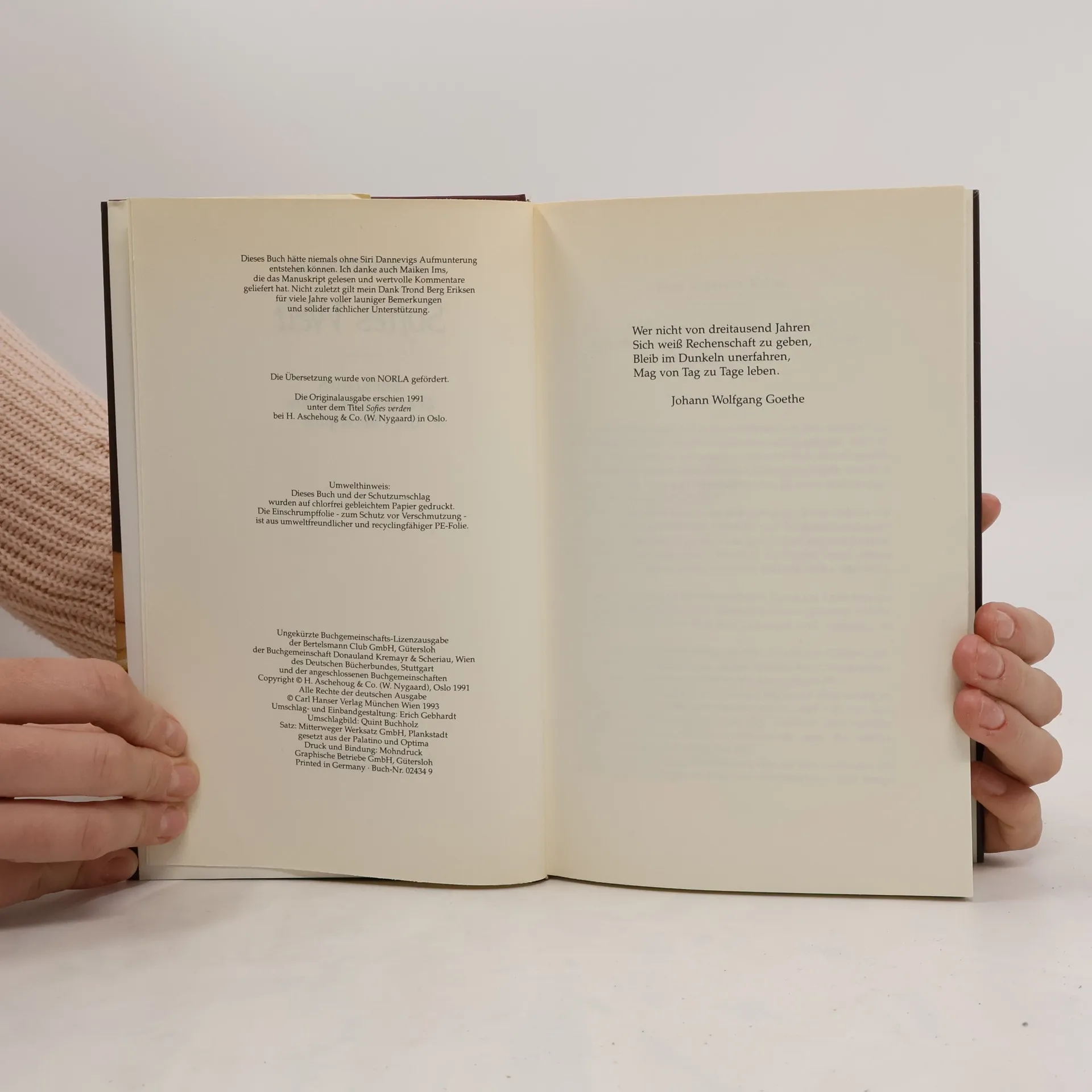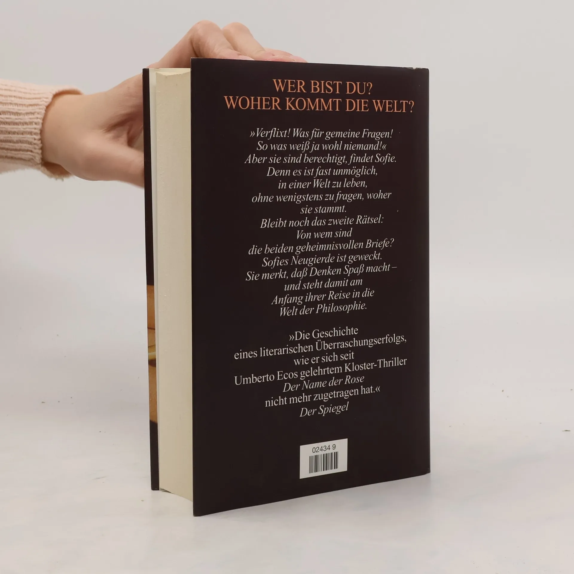»Ein dickes Buch, mit spitzen Fingern angefaßt und mit Begeisterung zugeklappt: ein großer Wurf im wörtlichen wie übertragenen Sinn.« Die Zeit Mysteriöse Briefe landen im Briefkasten der 15jährigen Sofie Amundsen in Oslo. Was sollen diese Fragen: »Wer bist du?«, »Was ist ein Mensch?« und »Woher kommt die Welt?«. Sofie ist irritiert. Die Briefe werden ausführlicher und entführen sie in die abenteuerliche und geheimnisvolle Gedankenwelt der großen Philosophen. Ihr unbekannter Briefeschreiber erzählt Sofie die Geschichte Europas, der Antike, des Mittelalters und der Renaissance und dann nimmt die Geschichte eine unglaubliche Wendung.