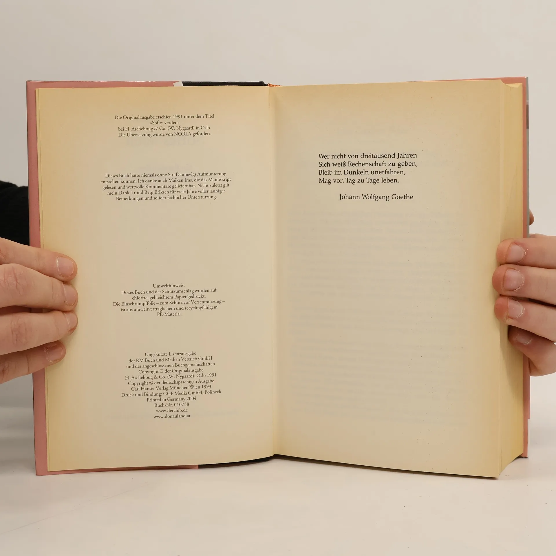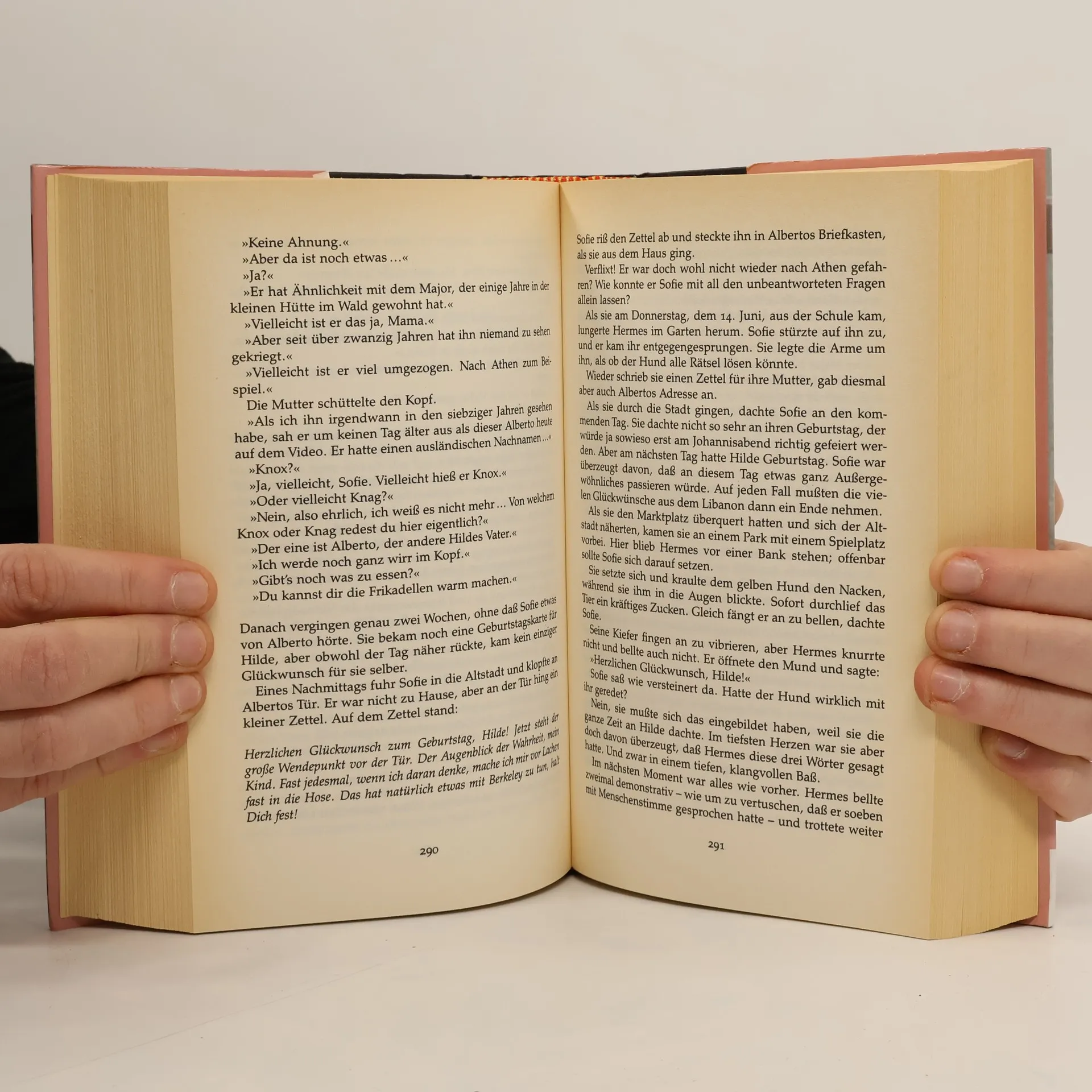 »Ein dickes Buch, mit spitzen Fingern angefaßt und mit Begeisterung zugeklappt: ein großer Wurf im wörtlichen wie übertragenen Sinn.« Die Zeit Mysteriöse Briefe landen im Briefkasten der 15jährigen Sofie Amundsen in Oslo. Was sollen diese Fragen: »Wer bist du?«, »Was ist ein Mensch?« und »Woher kommt die Welt?«. Sofie ist irritiert. Die Briefe werden ausführlicher und entführen sie in die abenteuerliche und geheimnisvolle Gedankenwelt der großen Philosophen. Ihr unbekannter Briefeschreiber erzählt Sofie die Geschichte Europas, der Antike, des Mittelalters und der Renaissance und dann nimmt die Geschichte eine unglaubliche Wendung.
