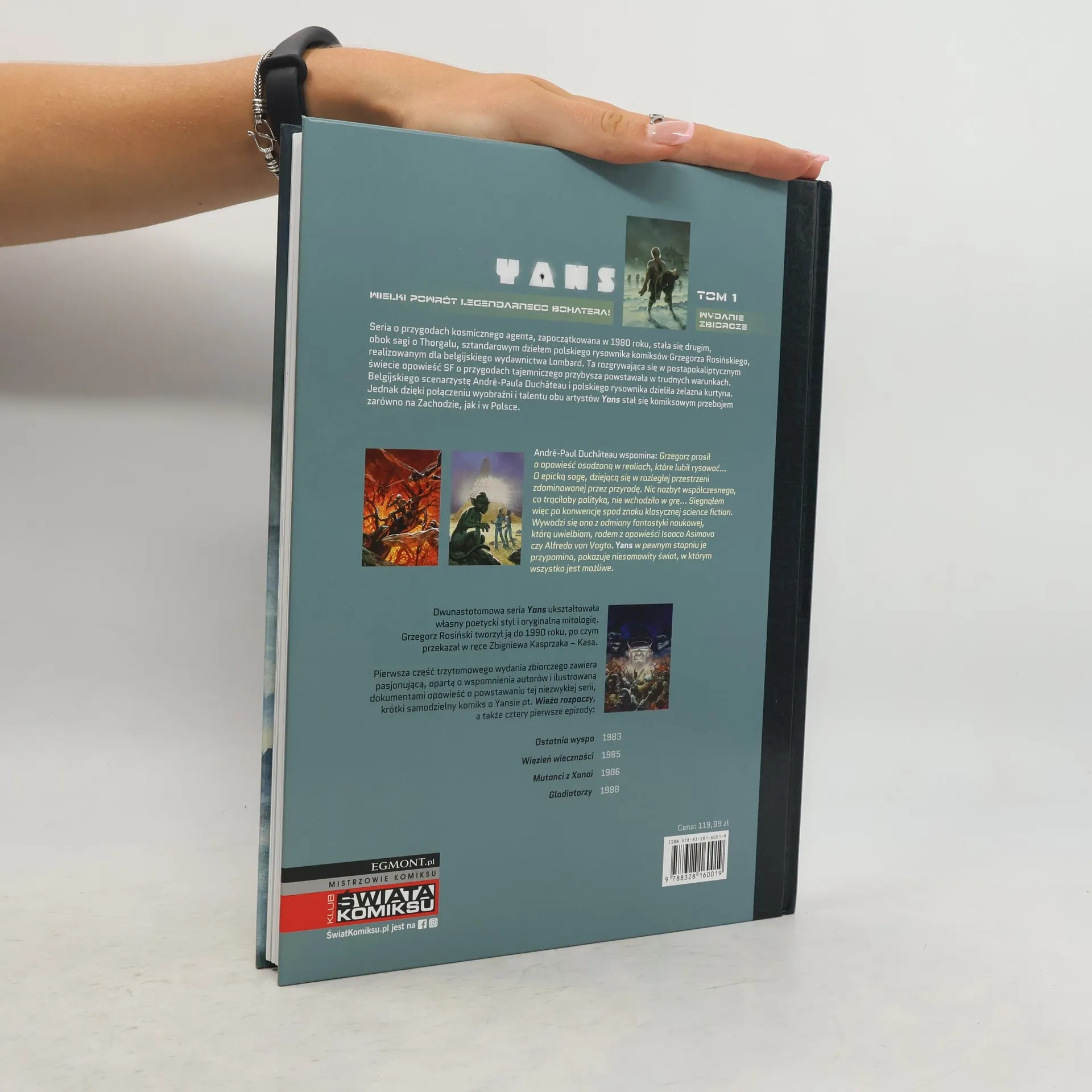 Seria o przygodach kosmicznego agenta, zapoczątkowana w 1980 roku, stała się drugim, obok sagi o Thorgalu, sztandarowym dziełem polskiego rysownika komiksów Grzegorza Rosińskiego, realizowanym dla belgijskiego wydawnictwa Lombard. Ta rozgrywająca się w postapokaliptycznym świecie opowieść SF o przygodach tajemniczego przybysza powstawała w trudnych warunkach. Belgijskiego scenarzystę Andr-Paula Duchteau i polskiego rysownika dzieliła żelazna kurtyna. Jednak dzięki połączeniu wyobraźni i talentu obu artystów Yans stał się komiksowym przebojem na Zachodzie, a także w Polsce. Dwunastotomowa seria ukształtowała własny poetycki styl i oryginalną mitologię. Grzegorz Rosiński tworzył ją do 1990 roku, po czym przekazał w ręce Zbigniewa Kasprzaka Kasa. Pierwsza część trzytomowego wydania zbiorczego zawiera pasjonującą, opartą o wspomnienia autorów i ilustrowaną dokumentami opowieść o okolicznościach powstania tej niezwykłej serii, krótki samodzielny komiks o Yansie pt. Wieża Rozpaczy, a także cztery pierwsze pełnometrażowe epizody: Ostatnia wyspa, Więzień wieczności, Mutanci z Xanai i Gladiatorzy.