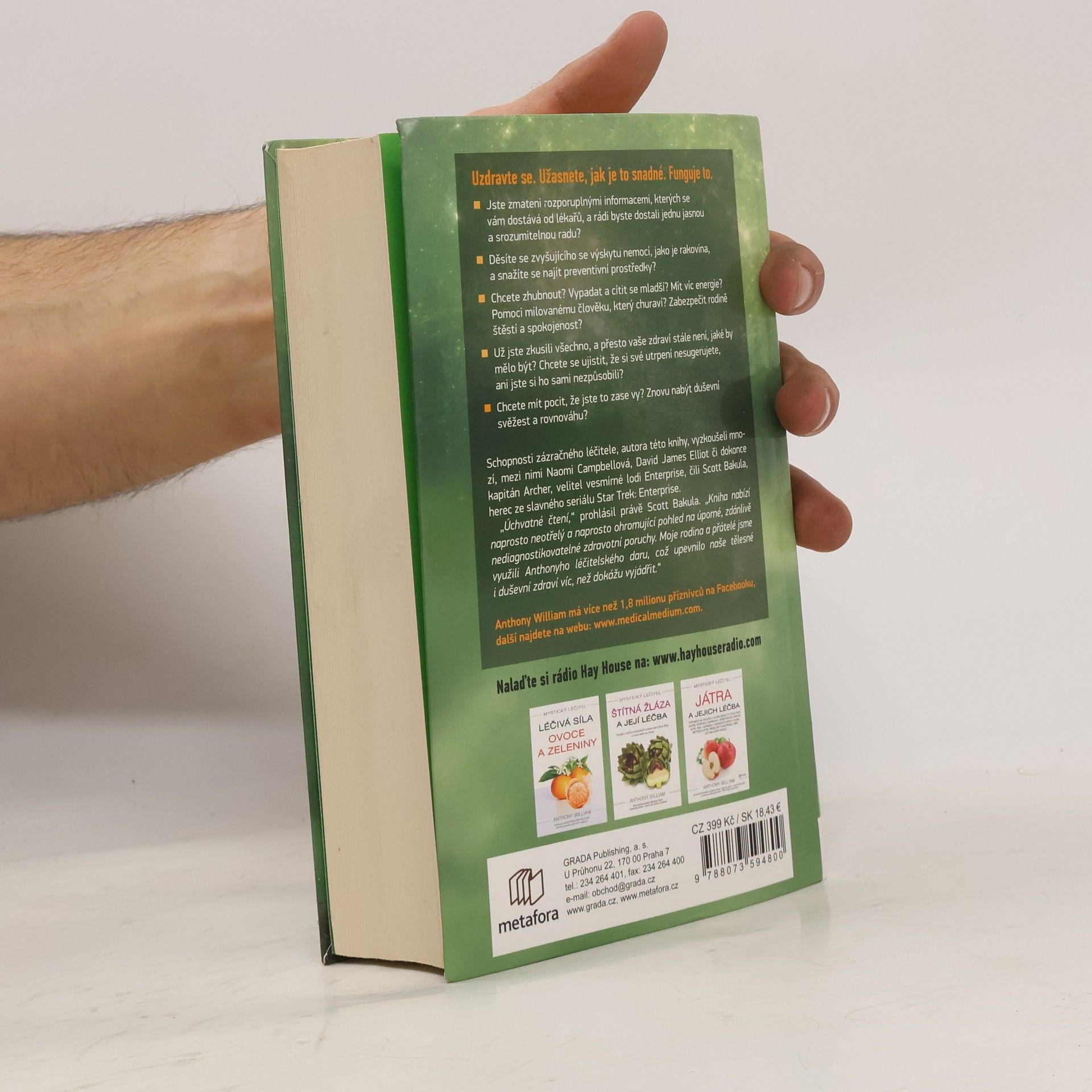 Novodobé médium odhaluje tajemství záhadných nemocí. Uzdravte se. Užasnete, jak je to snadné. Funguje to. Jste zmateni rozporuplnými informacemi, kterých se vám dostává od lékařů, a rádi byste dostali jednu jasnou, srozumitelnou radu? Děsíte se rakoviny? Chcete zhubnout? Vypadat a cítit se mladší? Mít víc energie? Nebo jste prostě nemocní a nikdo neví, co s vámi? Dokonce vám naznačují, že jste blázni a že si své potíže sugerujete. Už jste všechno zkusili, všude zašli, a přesto vám žádný doktor nepomohl. Pak jste na té správné adrese. Léčitel Anthony William zná cestu z toho začarovaného kruhu. Tam někde ve vyšších sférách jsou uložené veškeré informace. Řešení všeho. Léčebné metody, které lékařská věda objeví až pár let či dokonce desetiletí. A Anthony je zná.