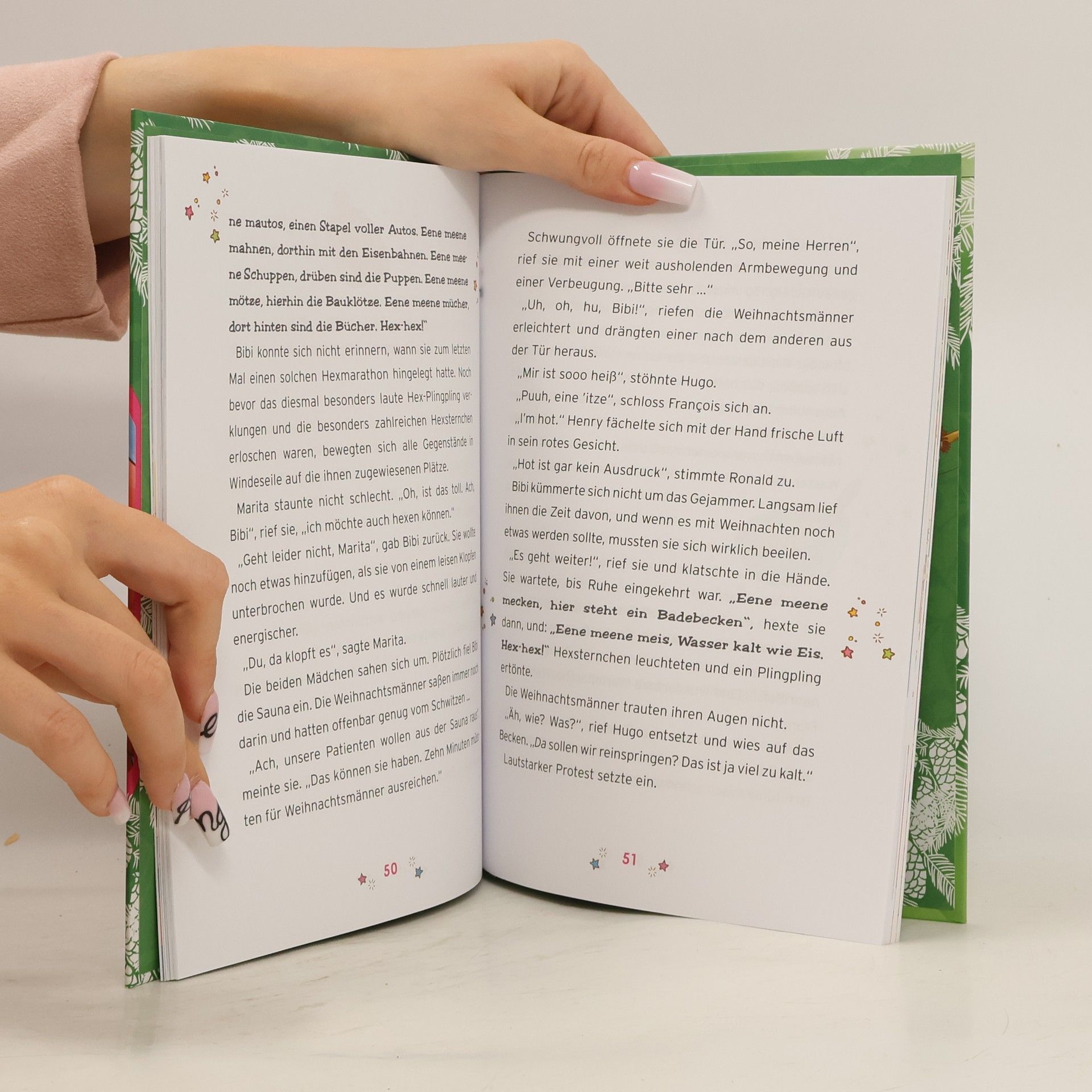 Weihnachten mit Bibi Blocksberg An Heiligabend entdecken Bibi und Marita beim Stöbern in Barbara Blocksbergs Hexenlabor die neue Kristallkugel von Bibis Mutter. Bibi ist neugierig und probiert sie gleich aus. Nach ein paar Versuchen kommt sie auf die Idee, ins Haus des Weihnachtsmanns zu schauen. Was sie dort sehen, können sie kaum glauben, vor allem Marita, die doch eigentlich gar nicht an den Weihnachtsmann glaubt. Aber da sind gleich drei Weihnachtsmänner: Willi, Henry und Pierre. Nur leider sind die drei offenbar schrecklich erkältet und müssen ständig niesen. Das Spielzeug liegt halb fertig in der Werkstatt. Weihnachten muss gerettet werden, beschließt Bibi und fliegt mit Marita zum Haus der Weihnachtsmänner. Aber einer ihrer Hexsprüche geht schief. Das Spielzeug setzt sich falsch zusammen und die Medizin erweist sich als Lachelixier. Nun kann nur noch Mutter Barbara Blocksberg helfen. Durchgehend vierfarbig illustriert für einen einfachen Leseeinstieg