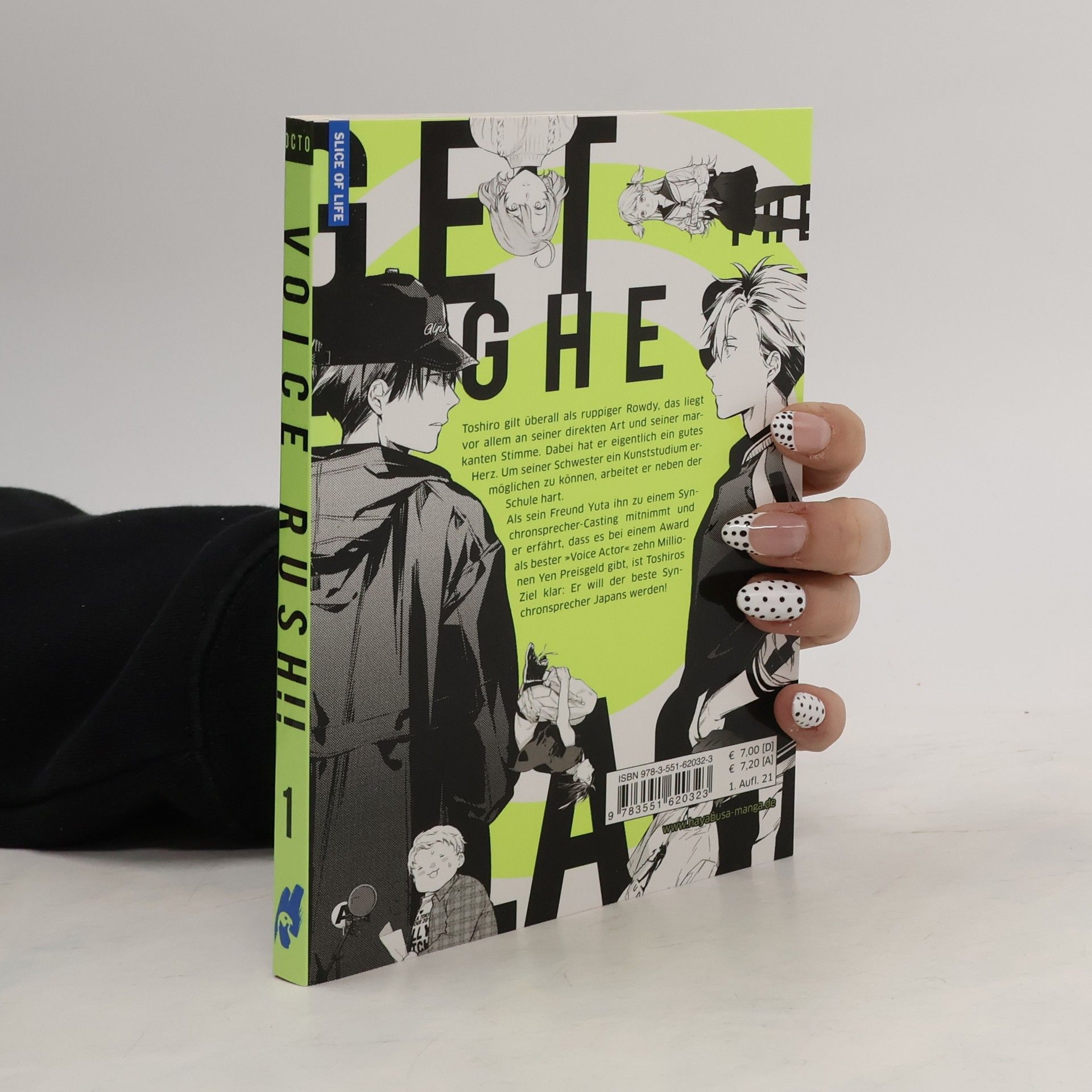 Toshiro gilt überall als ruppiger Rowdy, das liegt vor allem an seiner direkten Art und seiner markanten Stimme. Dabei hat er eigentlich ein gutes Herz. Um seiner Schwester ein Kunststudium ermöglichen zu können, arbeitet er neben der Schule hart. Als sein Freund Yuta ihn zu einem Synchronsprecher-Casting mitnimmt und er erfährt, dass es bei einem Award als bester »Voice Actor« zehn Millionen Yen Preisgeld gibt, ist Toshiros Ziel klar: Er will der beste Synchronsprecher Japans werden! Mit schicker Postkarte in der ersten Auflage!