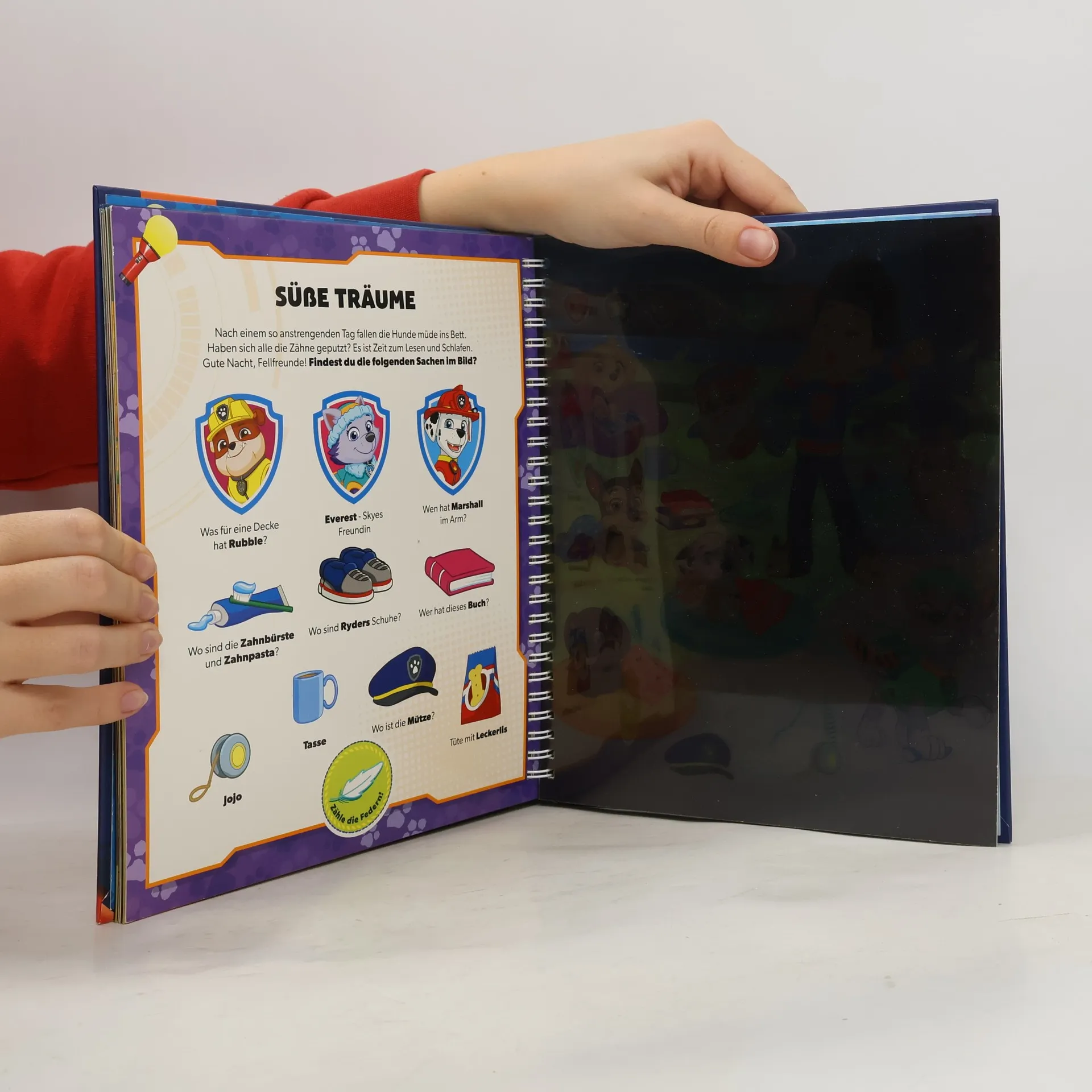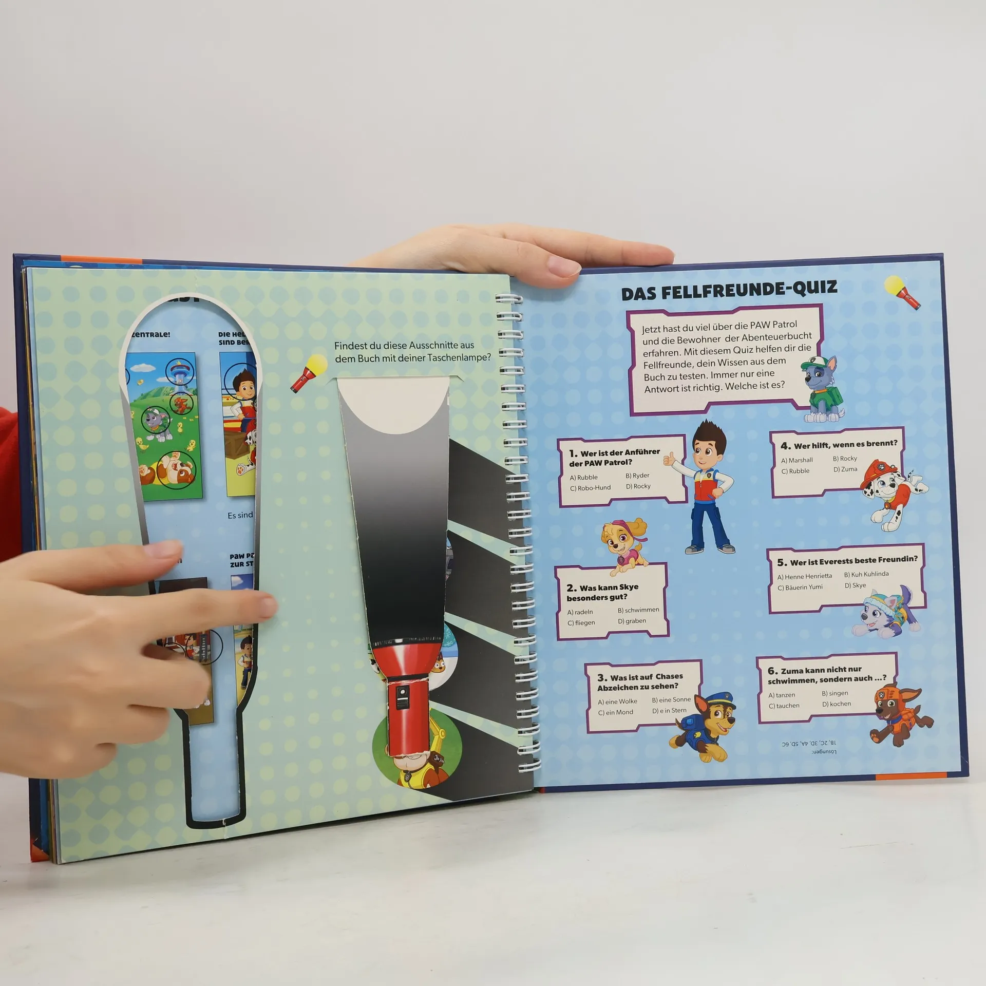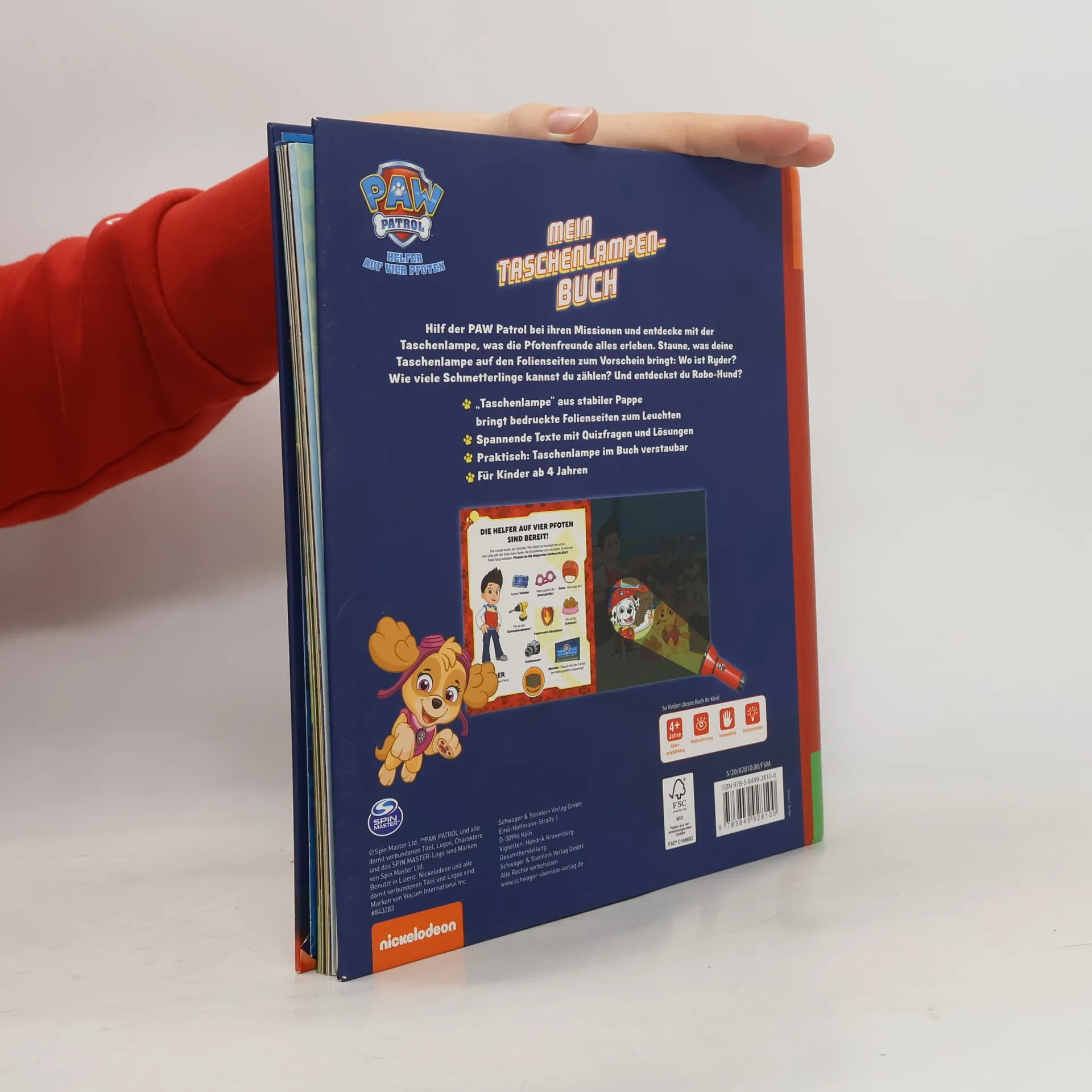 Mit PAW Patrol bunte Folienseiten zum Leuchten bringen und ihre Einsätze miterleben! Ein Muss für alle PAW Patrol-Fans Mitmachbuch zur beliebten Fernsehserie PAW Patrol Mit der stabilen Papp-Taschenlampe die Einsätze der PAW Patrol entdecken Bäuerin Yumi braucht Hilfe auf dem Bauernhof! Und was ist am Strand passiert? Die PAW Patrol ist bereit für ihre nächsten Pfotenmissionen! Begleite Chase und die Fellfreunde auf ihren Abenteuern und entdecke Ryder, Robo-Hund oder das Feuerwehrfahrzeug auf den bunten Folienseiten. Auf jeder Seite sind kleine Texte und viele Suchaufgaben. So macht das Entdecken auf den Folienseiten mit der Taschenlampe aus Pappe noch mehr Spaß! Wo ist der Gänseschwarm? Wie viele Schmetterlinge sind im Bild? Und was hat Everest gefunden? Ein spannendes Quiz am Ende testet das Wissen über die PAW Patrol. Auf den detailreichen, bunten Mitmachseiten gibt es für Kinder ab 4 Jahren viel zu entdecken, das fördert die Wahrnehmung, Feinmotorik und Konzentration! Die stabile Taschenlampe ist ganz einfach für ihren nächsten Einsatz mit der PAW Patrol im Buch verstaubar.