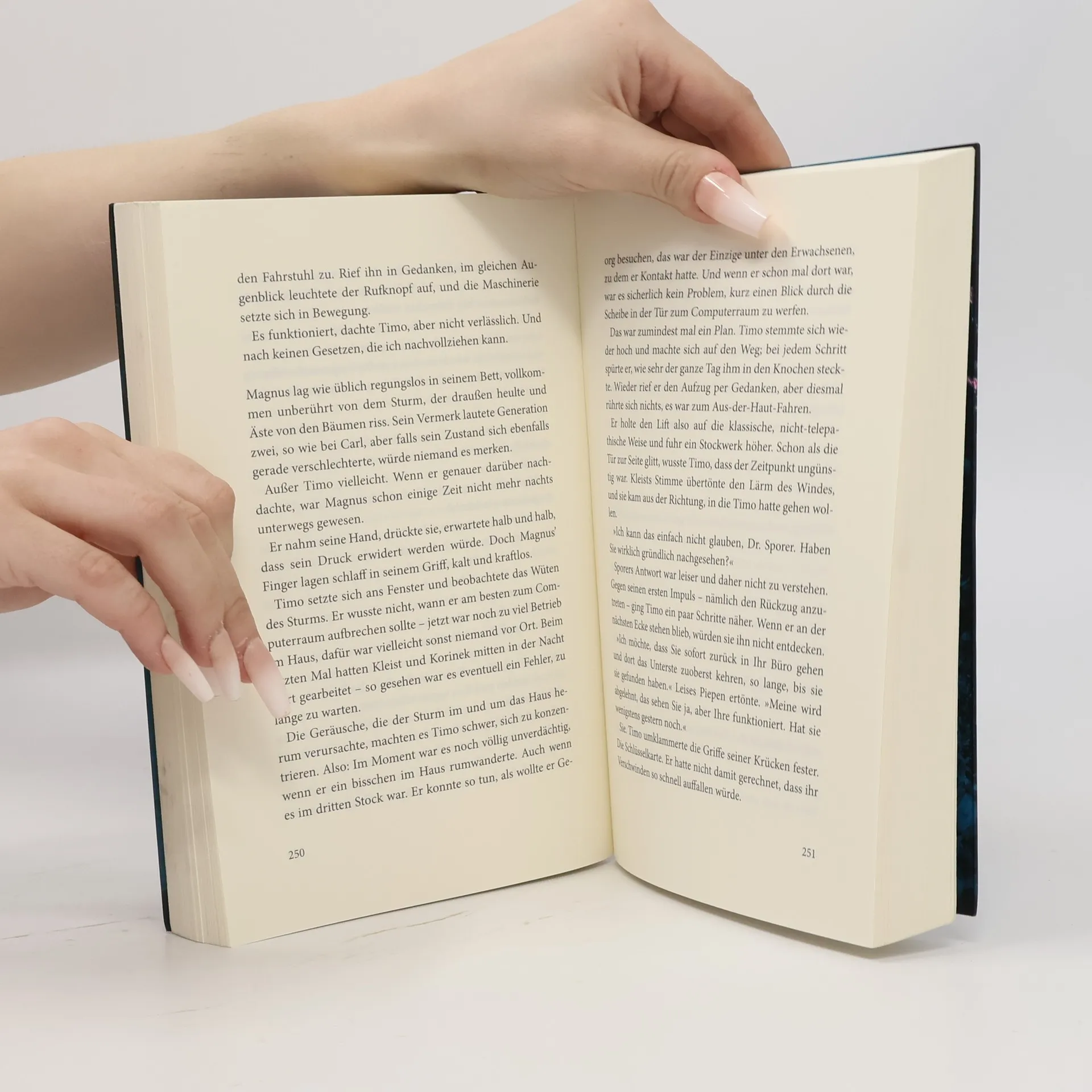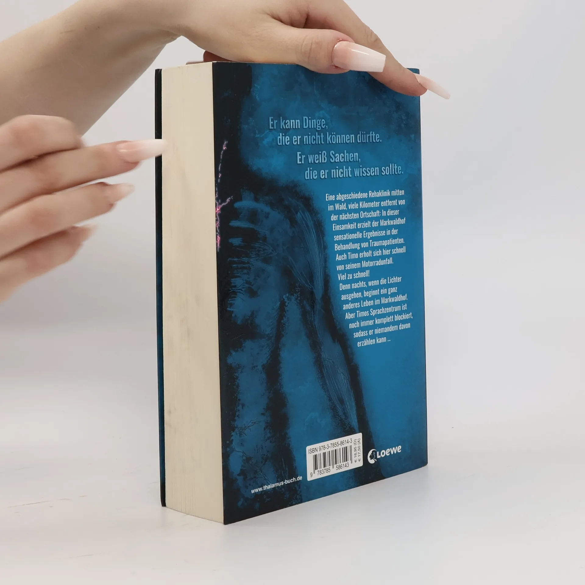 Eine abgelegene Rehaklinik ist Schauplatz des Med-Thrillers von Bestseller-Autorin Ursula Poznanski . Diesmal denkt die ehemalige Medizinjournalistin Chancen und Gefahren der modernen Hirnforschung konsequent weiter und trifft wieder einmal einen Nerv – buchstäblich! Ein schwerer Motorradunfall katapultiert den siebzehnjährigen Timo aus seinem normalen Leben und fesselt ihn für Monate ans Krankenbett. Auf dem Markwaldhof, einem Rehabilitationszentrum, soll er sich von seinen Knochenbrüchen und dem Schädelhirntrauma erholen. Aber schnell stellt Timo fest, dass sich merkwürdige Dinge im Haus abspielen: Der Junge, mit dem er sich das Zimmer teilt, gilt als Wachkomapatient und hoffnungsloser Fall, doch nachts läuft er herum, spricht – und droht Timo damit, ihn zu töten, falls er anderen davon erzählt. Eine Sorge, die unbegründet ist, denn Timos Sprachzentrum ist schwer beeinträchtigt, seine Feinmotorik erlaubt ihm noch nicht niederzuschreiben, was er erlebt. Und allmählich entdeckt er an sich selbst Fähigkeiten, die neu sind. Er kann Dinge, die er nicht können dürfte. Weiß von Sachen, die er nicht wissen sollte …