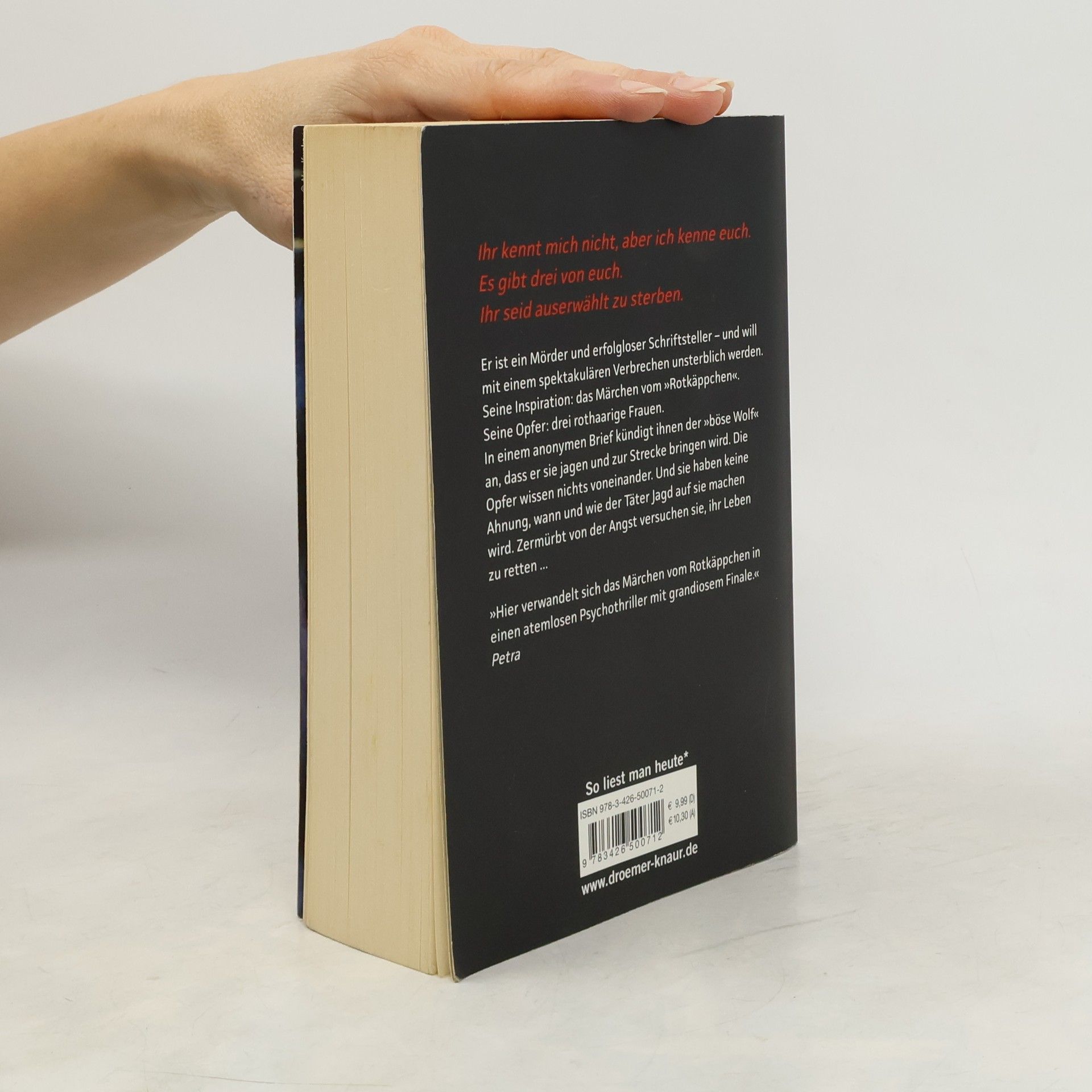 Er ist ein Mörder und erfolgloser Schriftsteller – und will mit einem spektakulären Verbrechen unsterblich werden. Seine Inspiration: das Märchen vom Rotkäppchen. Seine Opfer: drei rothaarige Frauen. In einem anonymen Brief kündigt ihnen der »böse Wolf« an, dass er sie jagen und zur Strecke bringen wird. Die Opfer wissen nichts voneinander. Und sie haben keine Ahnung, wann und wie der Täter Jagd auf sie machen wird. Zermürbt von ihrer Angst versuchen sie, ihr Leben zu retten ...