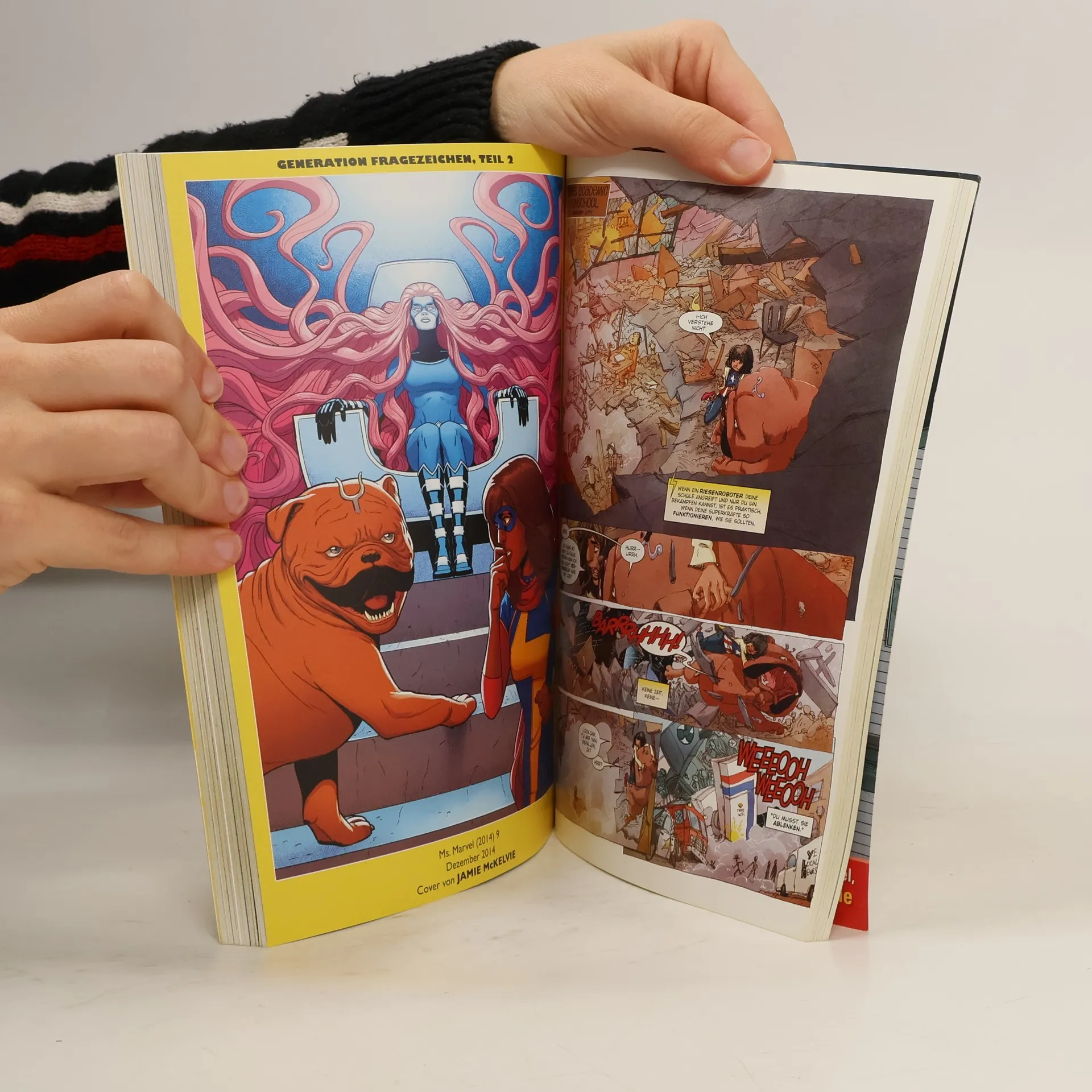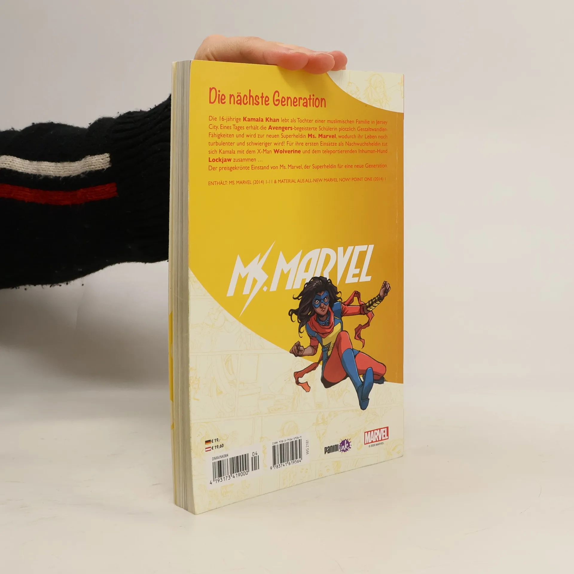 DIE NÄCHSTE GENERATION Die 16-jährige Kamala Khan lebt als Tochter einer muslimischen Familie in Jersey City. Eines Tages erhält die Avengers-begeisterte Schülerin plötzlich Gestaltwandler-Fähigkeiten und wird zur neuen Superheldin Ms. Marvel, wodurch ihr Leben noch turbulenter und schwieriger wird! Für ihre ersten Einsätze als Nachwuchsheldin tut sich Kamala mit dem X-Man Wolverine und dem teleportierenden Inhuman-Hund Lockjaw zusammen … Der preisgekrönte Einstand von Ms. Marvel, der Superheldin für eine neue Generation. ENTHÄLT: MS. MARVEL (2014) 1-11 & MATERIAL AUS ALL-NEW MARVEL NOW! POINT ONE (2014) 1