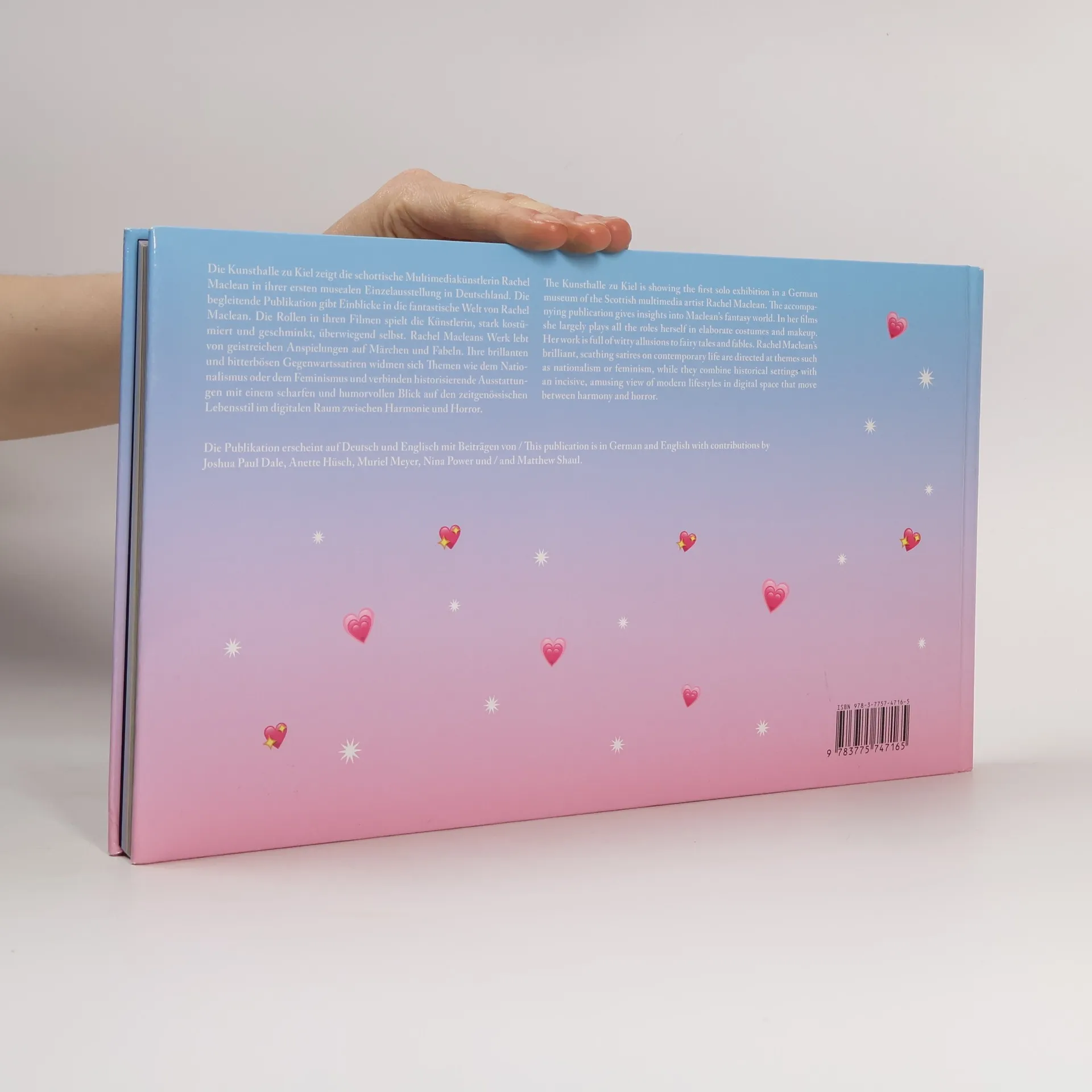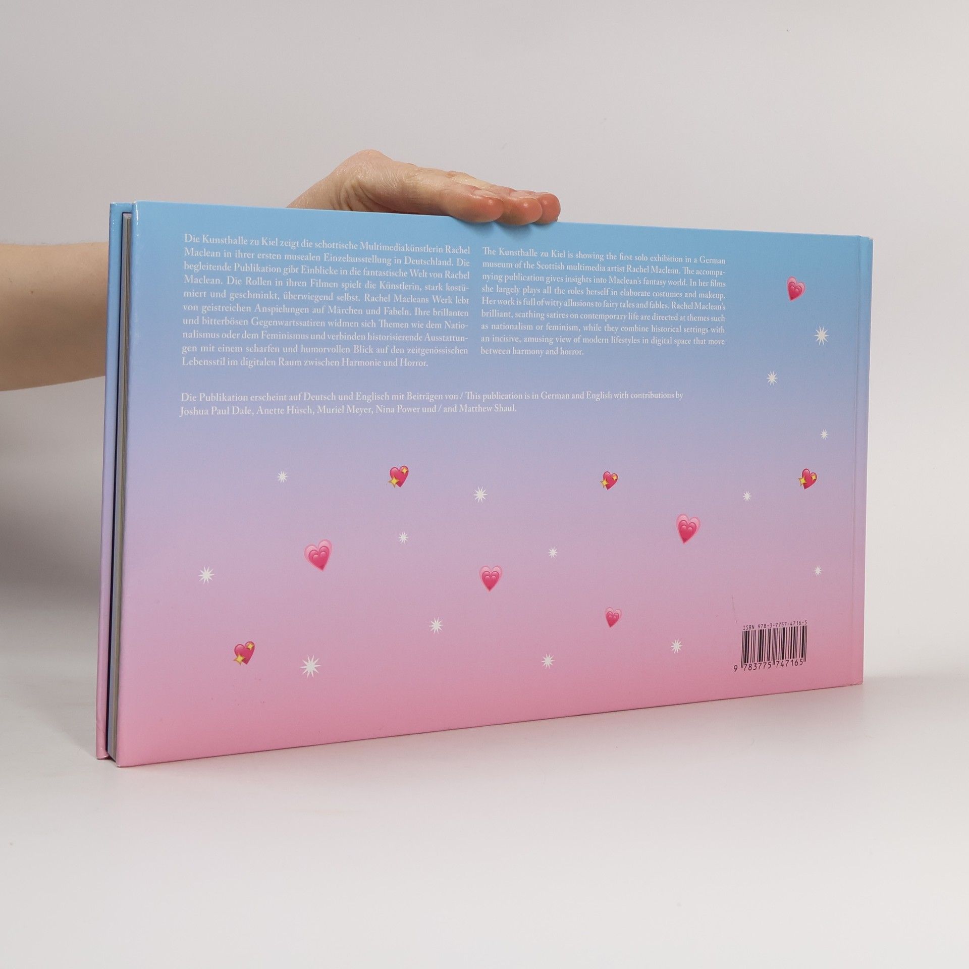 "Multicolored," "jarring," and "always over the top" aptly describe the worlds created by the Scottish multimedia artist Rachal Maclean. Her films are full of oddly exaggerated characters living in fantasy worlds. Wearing elaborate costumes and makeup, the artist plays most of the roles herself. Rachel Maclean's work subsists on ingenious allusions to fairy tales and fables. Her brilliant and scathing contemporary satires are directed at themes such as nationalism or feminism. They combine historical settings with an incisive, amusing view of modern lifestyles in a digital space that shifts back and forth between harmony and horror. Accompanying the brightly colorful materials of her latest artwork are five essays by Anette Hüsch, Matthew Shaul, Nina Power, Joshua Paul Dale, and Muriel Meyer, which present insightful views of Maclean's oeuvre.