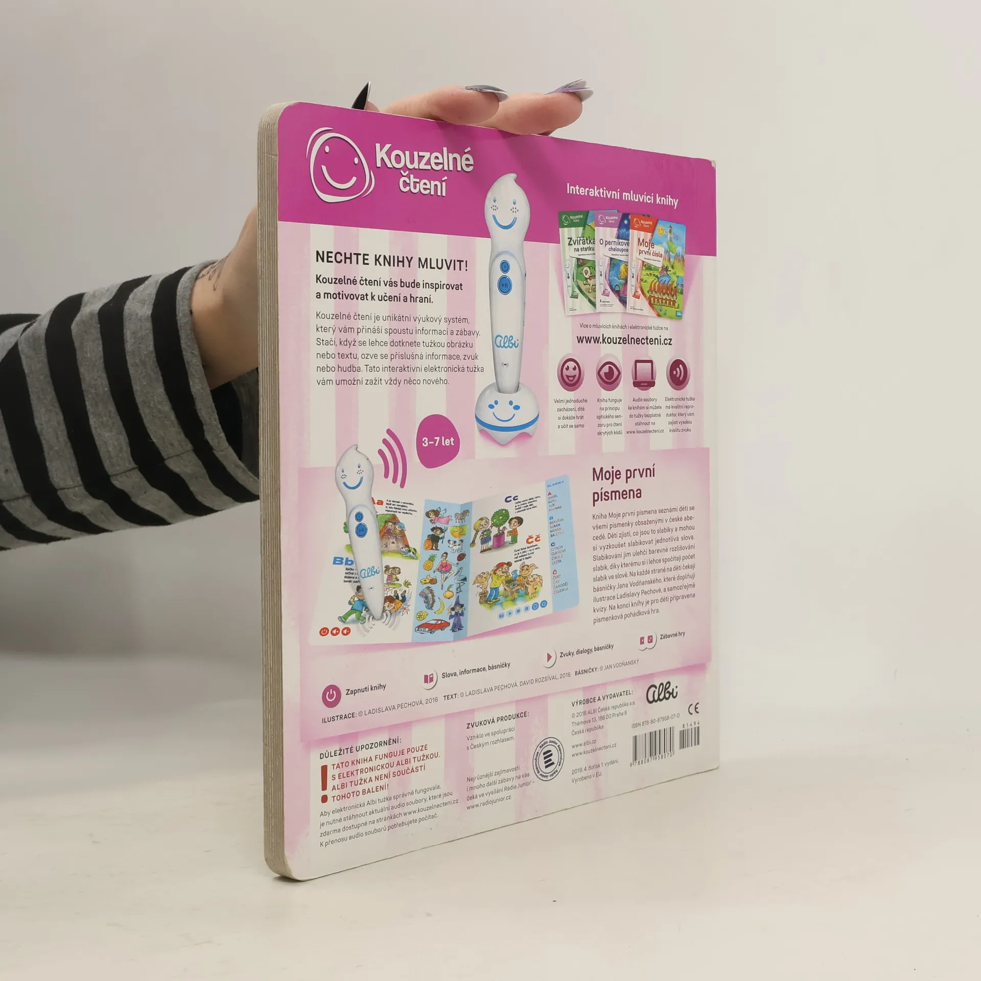 Interaktivní naučná kniha Moje první písmena seznámí děti od 3 let se všemi písmenky české abecedy. Kouzelné čtení tentokrát dětem představí nejen písmena, ale naučí je i slabiky. Slabikování si mohou za pomoci elektronické Albi tužky i vyzkoušet. Jednotlivé slabiky slov jsou barevně rozlišené, pro děti se tím slabikování stane rázem snadnější.