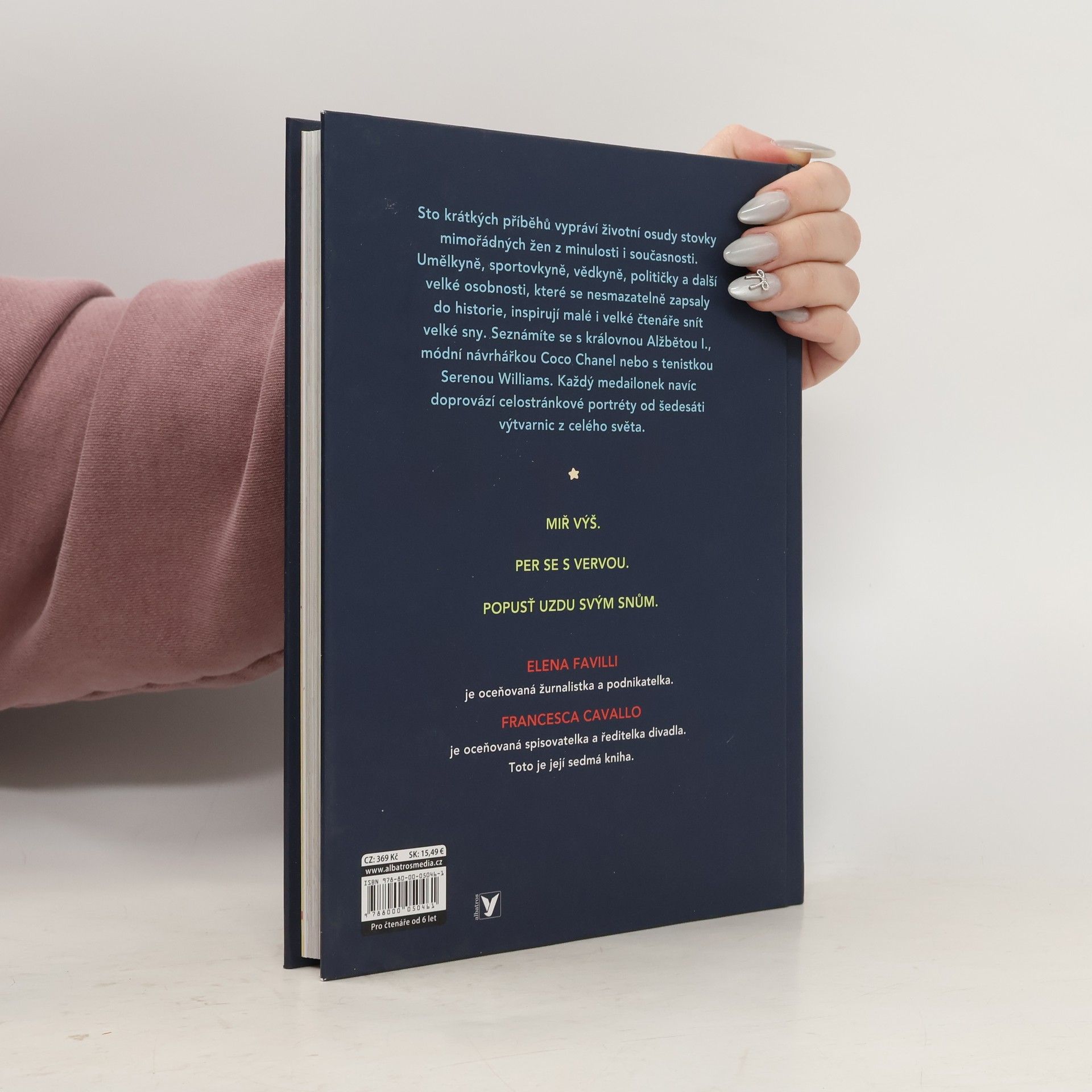 "Sněte, ještě než půjdete spát! Světový bestseller představuje životy inspirativních žen napříč dějinami." Sto krátkých příběhů vypráví životní osudy stovky mimořádných žen z minulosti i současnosti. Umělkyně, sportovkyně, vědkyně, političky a další velké osobnosti, které se nesmazatelně zapsaly do historie, inspirují malé i velké čtenáře snít velké sny. Seznámíte se s královnou Alžbětou I., módní návrhářkou Coco Chanel nebo s tenistkou Serenou Williams. Každý medailonek navíc doprovází celostránkové portréty od šedesáti výtvarnic z celého světa.