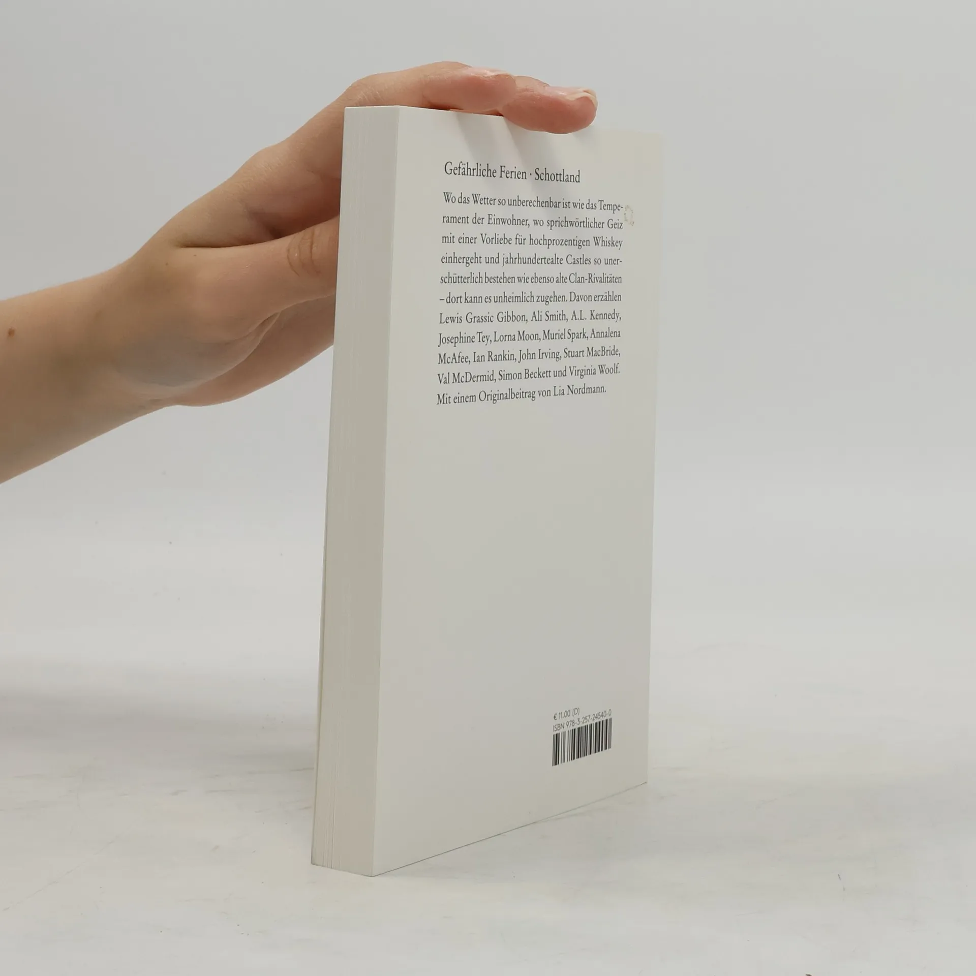 Wo das Wetter so unberechenbar ist wie das Temperament der Einwohner, wo sprichwörtlicher Geiz mit einer Vorliebe für hochprozentigen Whiskey einhergeht, dort kann es unheimlich zugehen. Davon erzählen Ian Rankin, John Irving, Muriel Spark, Annalena McAfee, Stuart MacBride, Val McDermid, Ali Smith, A. L. Kennedy, Simon Beckett und Virginia Woolf. Mit einem Originalbeitrag von Lia Nordmann.