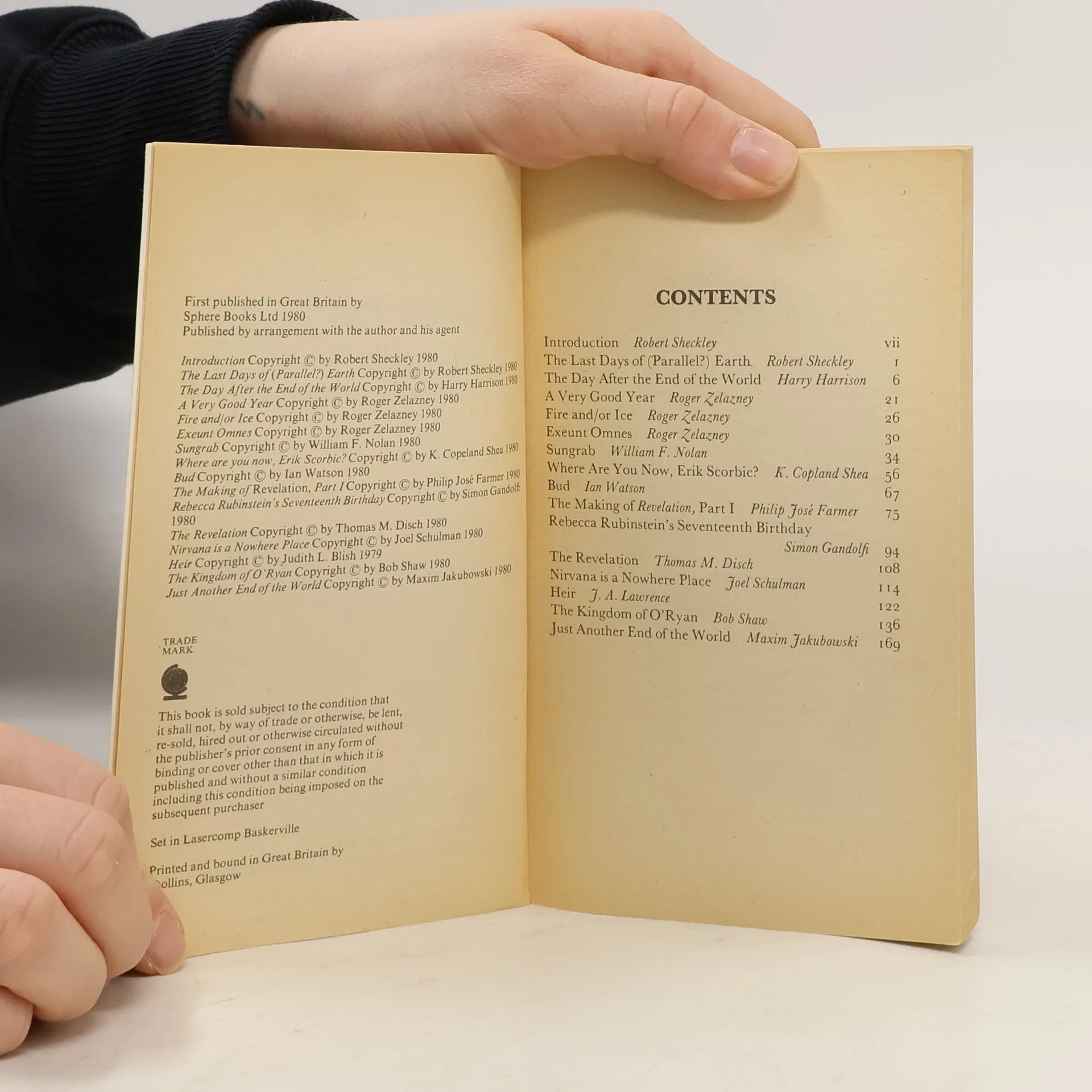 This is it. Over. Don. Through. FINI. Boom. Kaput: The End of the World and how to Enjoy it. Contents The Last Days of (Parallel?) Earth by Robert Sheckley The Day After the End of the World by Harry Harrison A Very Good Year Roger Zelazny Fire And/or Ice Roger Zelazny Exeunt Omnes Roger Zelazny Sungrab William F. Nolan Where are you now, Erik Scorbic? K. Copeland Shea Bud Ian Watson The Making of Revelation, Part I Philip Jose' Farmer Rebecca Rubinstein's Seventeenth Birthday Simon Gandolfi The Revelation Thomas M. Disch Nirvana is a Nowhere Place Joel Schulman Heir J. A. Lawrence The Kingom of O'Ryan Bob Shaw Just Another End of the World Maxim Jakubowski