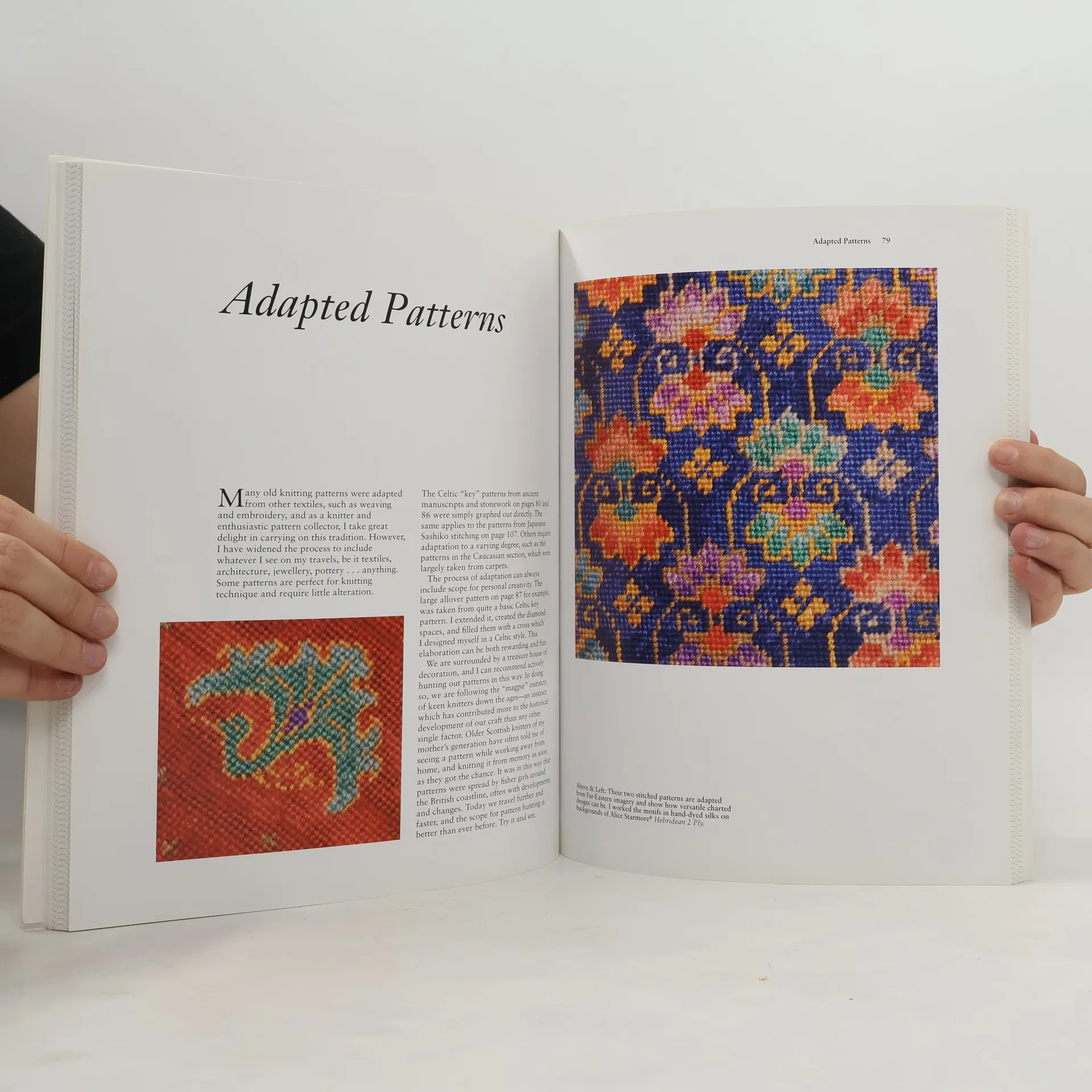 Features traditional and original patterns that can be used to create knitted sweaters, along with projects for patterned sweaters and her advice for determining a design's color scheme.
