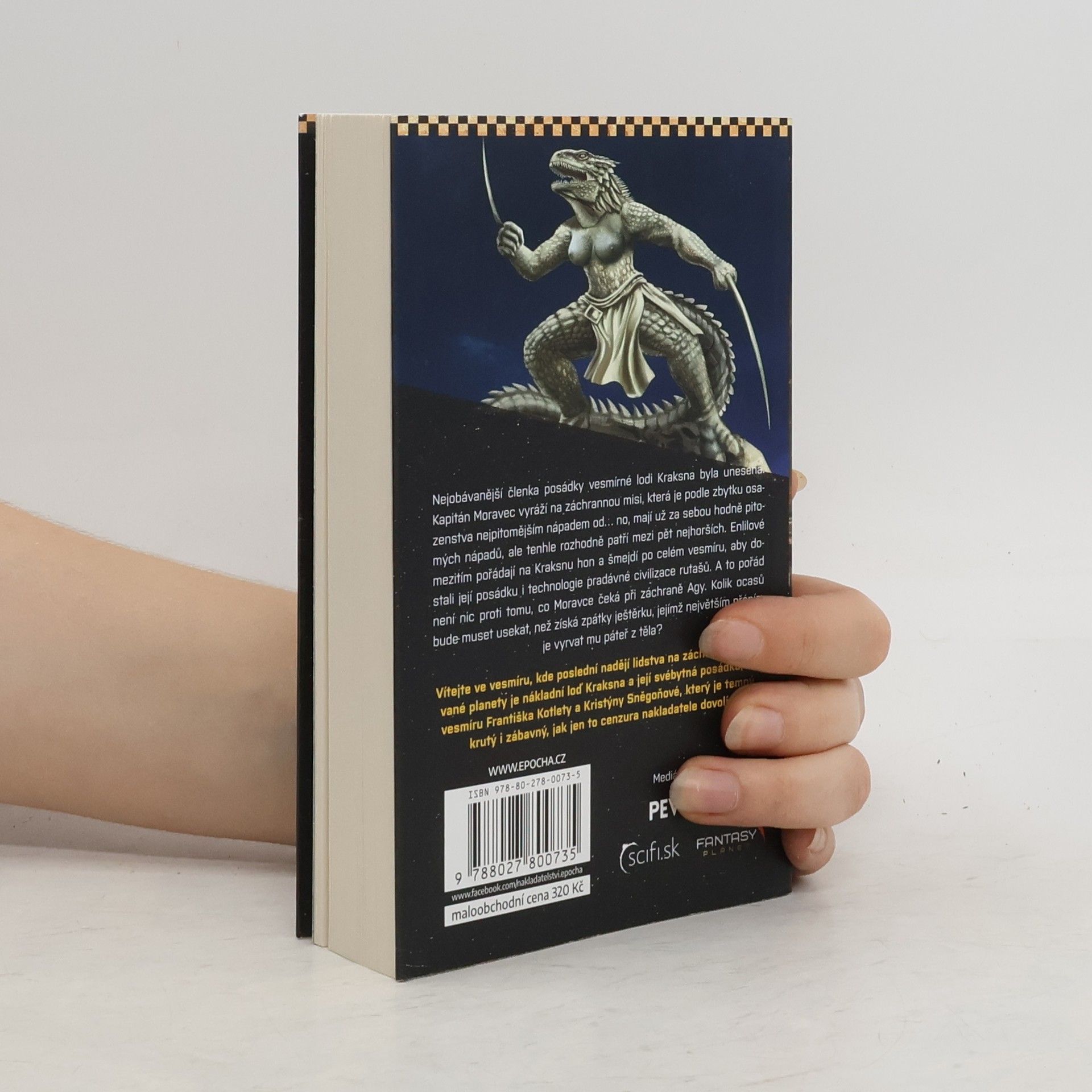 Nejobávanější členka vesmírné lodi Kraksna byla unesena. Kapitán Moravec vyráží na záchrannou misi, která je podle zbytku posádky nejpitomějším nápadem od … no, posádka Kraksny má za sebou hodně pitomých nápadů, ale tenhle rozhodně patří mezi pět největších. Enlilové mezitím začnou pořádat na Kraksnu hon a šmejdit po celém vesmíru, aby dostali její posádku i technologii pradávné civilizace rutašů. Což pořád nic není proti tomu, co Moravce čeká při záchraně Agy. Kolik ocasů bude muset přesekat, než získá zpátky ještěrku, která netouží po ničem jiném, než mu vyrvat páteř z těla? Vítejte ve vesmíru, kde poslední nadějí lidstva na záchranu okupované planety je nákladní loď Kraksna a její svébytná posádka, vesmíru Františka Kotlety a Kristýny Sněgoňové, který je temný, krutý i zábavný, jak jen to cenzura nakladatele dovolí.