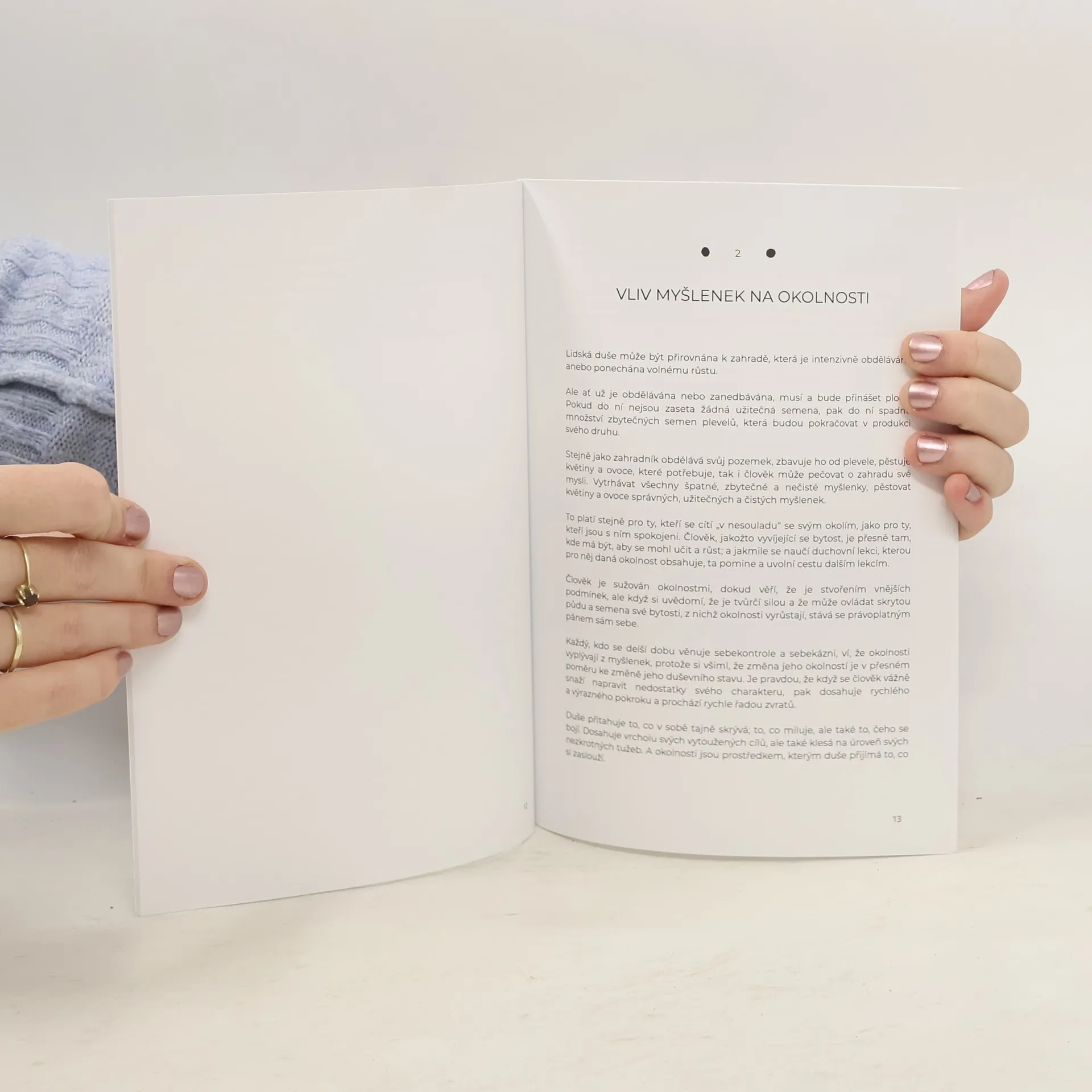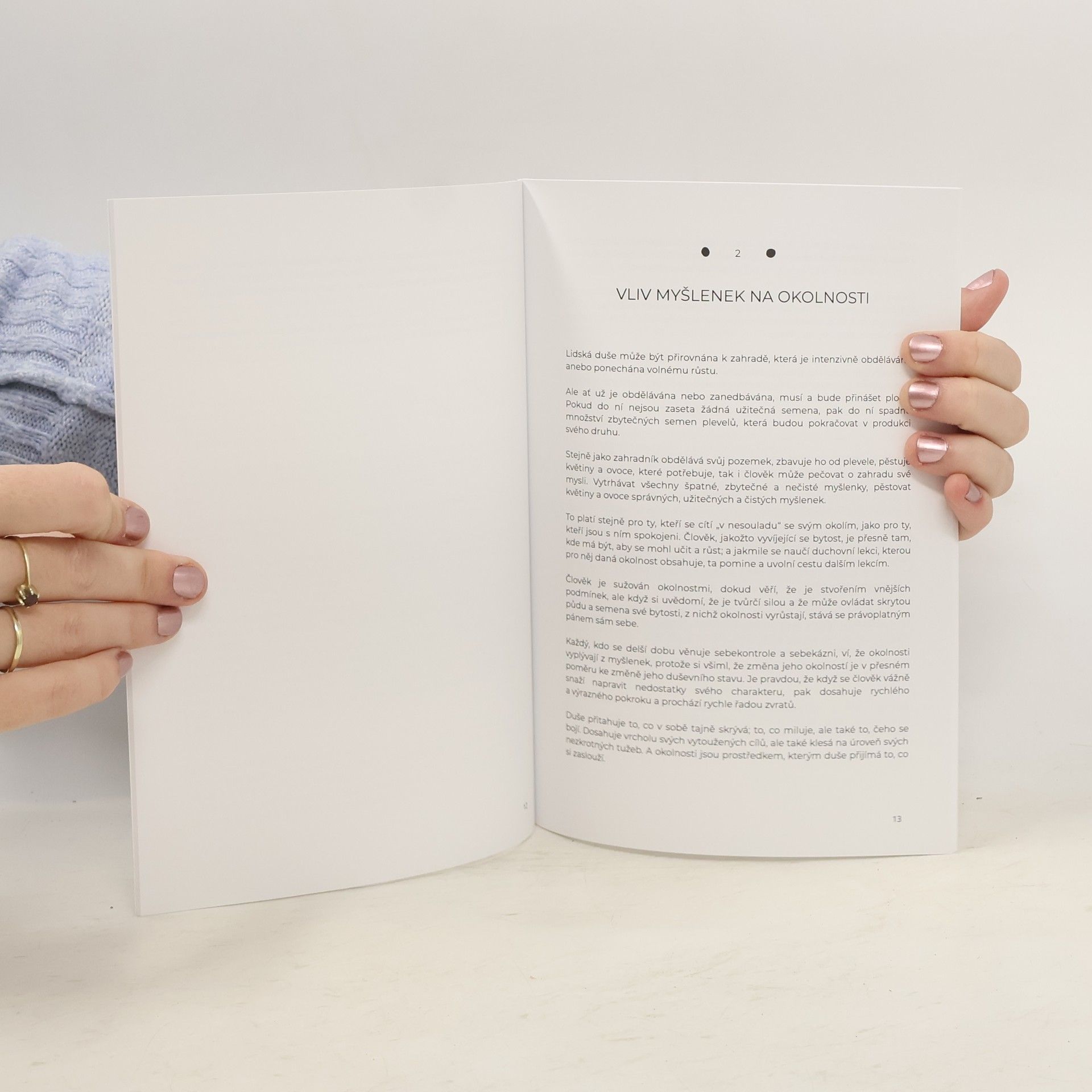 Zamysleli jste se někdy nad tím, na co myslíte? Přečtěte si tuto větu ještě jednou a dobře se nad ní zamyslete. To není slovní hříčka. Lidé obvykle vůbec nepřemýšlejí o tom, na co myslí, a málokdo rozumí skutečnosti, že dobré myšlenky nesou dobré ovoce, a že špatné myšlenky nesou špatné ovoce. Většina z nás přijímá zákon „jak zaseješ, tak sklidíš“ v různých životních situacích, ale vůbec si neuvědomujeme, že stejný zákon funguje naprosto stejně, pokud jde o naše myšlení. Čím více budete myslet na zármutek a křivdu, která se vám stala, tím více bolesti a bezpráví budete muset podstoupit. A naopak, čím více myslíte na štěstí, tím více radosti v životě obdržíte. Tato knížka pro vás bude velkým přínosem, ať už jste se někdy věnovali „správnému smýšlení“ nebo ne. Porozumíte, jak síla myšlenky ovlivňuje váš život, a uvědomíte si, proč se v životě nacházíte právě tam, kde jste. Přijmete-li filozofii Jamese Allena, pochopíte, že váš osud neurčuje vaše prostředí, váš partner/partnerka nebo šéf, stát, ekonomika nebo štěstí, ale vaše myšlenky; pochopíte, že svůj osud ovládá každý sám, pokud ovládá své myšlenky. A to už stojí za to se nad tím zamyslet, nebo ne?