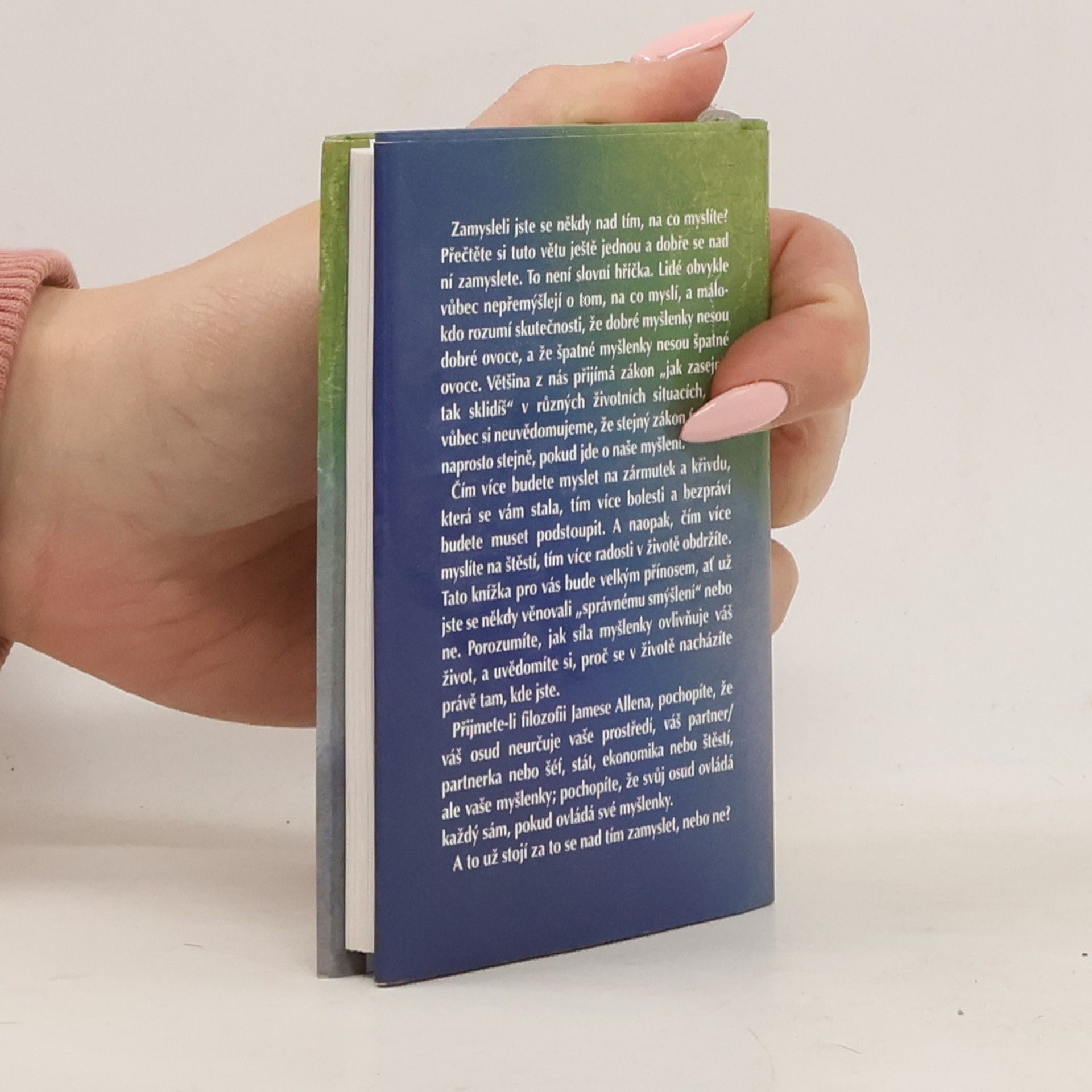 Zamysleli jste se někdy nad tím, na co myslíte? Přečtěte si tuto větu ještě jednou a dobře se nad ní zamyslete. To není slovní hříčka. Lidé obvykle vůbec nepřemýšlejí o tom, na co myslí, a málokdo rozumí skutečnosti, že dobré myšlenky nesou dobré ovoce, a že špatné myšlenky nesou špatné ovoce. Většina z nás přijímá zákon „jak zaseješ, tak sklidíš“ v různých životních situacích, ale vůbec si neuvědomujeme, že stejný zákon funguje naprosto stejně, pokud jde o naše myšlení. Čím více budete myslet na zármutek a křivdu, která se vám stala, tím více bolesti a bezpráví budete muset podstoupit. A naopak, čím více myslíte na štěstí, tím více radosti v životě obdržíte. Tato knížka pro vás bude velkým přínosem, ať už jste se někdy věnovali „správnému smýšlení“ nebo ne. Porozumíte, jak síla myšlenky ovlivňuje váš život, a uvědomíte si, proč se v životě nacházíte právě tam, kde jste. Přijmete-li filozofii Jamese Allena, pochopíte, že váš osud neurčuje vaše prostředí, váš partner/partnerka nebo šéf, stát, ekonomika nebo štěstí, ale vaše myšlenky; pochopíte, že svůj osud ovládá každý sám, pokud ovládá své myšlenky. A to už stojí za to se nad tím zamyslet, nebo ne?