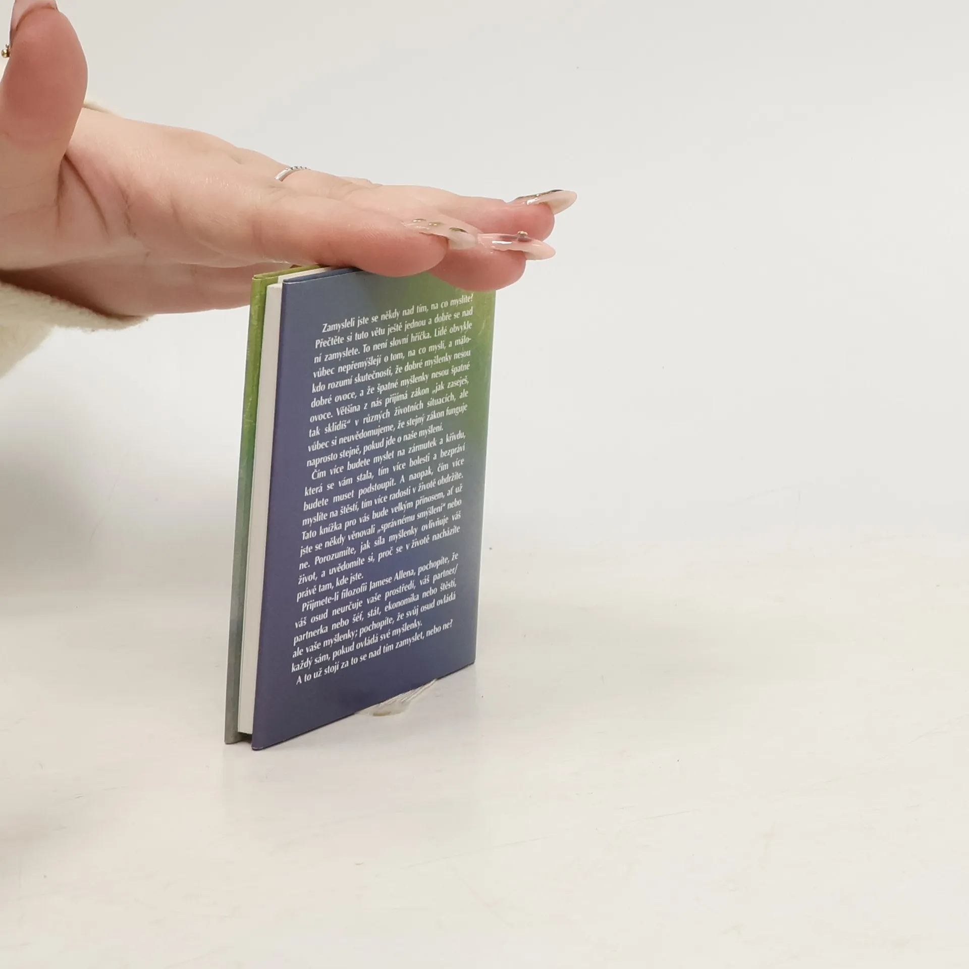 Zamysleli jste se někdy nad tím, na co myslíte? Přečtěte si tuto větu ještě jednou a dobře se nad ní zamyslete. To není slovní hříčka. Lidé obvykle vůbec nepřemýšlejí o tom, na co myslí, a málokdo rozumí skutečnosti, že dobré myšlenky nesou dobré ovoce, a že špatné myšlenky nesou špatné ovoce. Většina z nás přijímá zákon „jak zaseješ, tak sklidíš“ v různých životních situacích, ale vůbec si neuvědomujeme, že stejný zákon funguje naprosto stejně, pokud jde o naše myšlení. Čím více budete myslet na zármutek a křivdu, která se vám stala, tím více bolesti a bezpráví budete muset podstoupit. A naopak, čím více myslíte na štěstí, tím více radosti v životě obdržíte. Tato knížka pro vás bude velkým přínosem, ať už jste se někdy věnovali „správnému smýšlení“ nebo ne. Porozumíte, jak síla myšlenky ovlivňuje váš život, a uvědomíte si, proč se v životě nacházíte právě tam, kde jste. Přijmete-li filozofii Jamese Allena, pochopíte, že váš osud neurčuje vaše prostředí, váš partner/partnerka nebo šéf, stát, ekonomika nebo štěstí, ale vaše myšlenky; pochopíte, že svůj osud ovládá každý sám, pokud ovládá své myšlenky. A to už stojí za to se nad tím zamyslet, nebo ne?