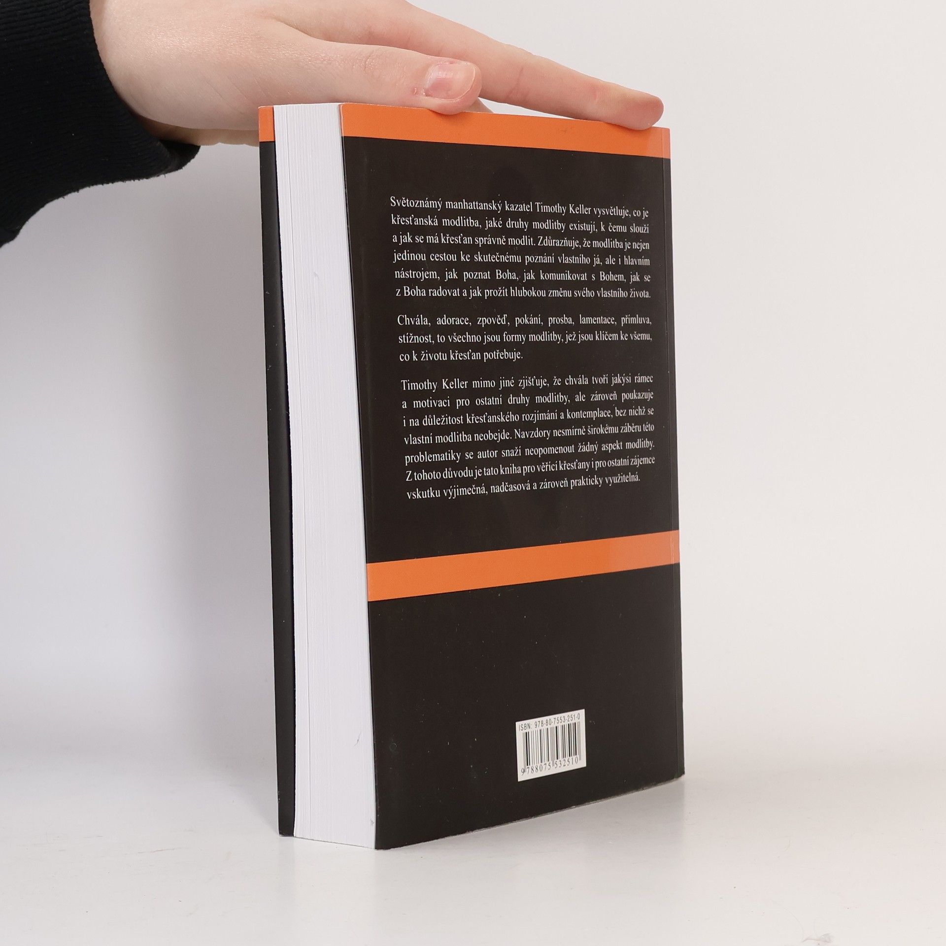Zkušenost posvátné úcty a důvěrného vztahu s Bohem Světoznámý manhattanský kazatel Timothy Keller vysvětluje, co je křesťanská modlitba, jaké druhy modlitby existují, k čemu slouží a jak se má křesťan správně modlit. Zdůrazňuje, že modlitba je nejen jedinou cestou ke skutečnému poznání vlastního já, ale i hlavním nástrojem, jak poznat Boha, jak komunikovat s Bohem, jak se z Boha radovat a jak prožít hlubokou změnu svého vlastního života. Chvála, adorace, zpověď, pokání, prosba, lamentace, přímluva, stížnost, to všechno jsou formy modlitby, jež jsou klíčem ke všemu, co k životu křesťan potřebuje. Timothy Keller mimo jiné zjišťuje, že chvála tvoří jakýsi rámec a motivaci pro ostatní druhy modlitby, ale zároveň poukazuje i na důležitost křesťanského rozjímání a kontemplace, bez nichž se vlastní modlitba neobejde. Navzdory nesmírně širokému záběru této problematiky se autor snaží neopomenout žádný aspekt modlitby. Z tohoto důvodu je tato kniha pro věřící křesťany i pro ostatní zájemce vskutku výjimečná, nadčasová a zároveň prakticky využitelná.