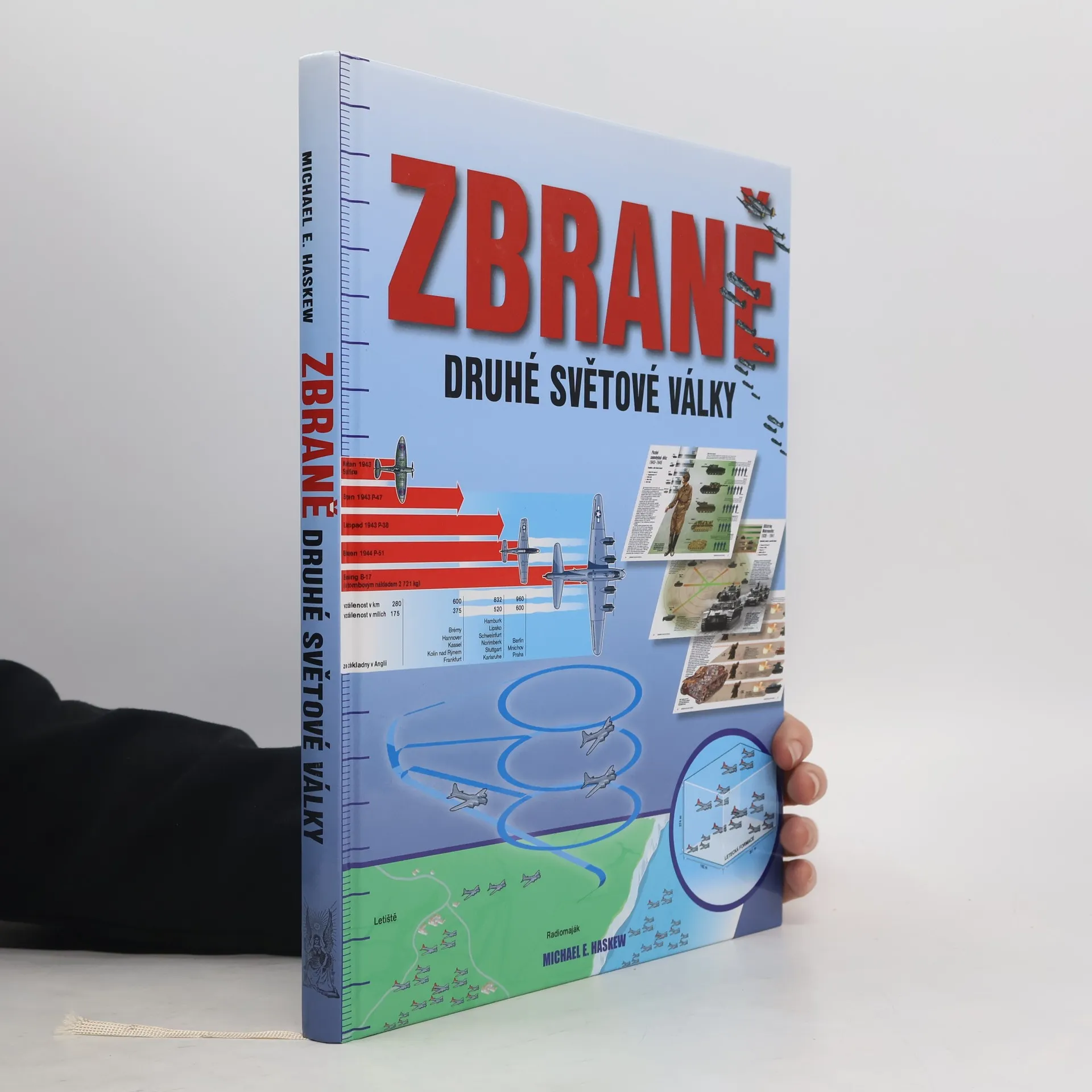 Michael E. Haskew je autorem mnoha knih s válečnou tematikou a redaktorem uznávaných periodik věnujících se druhé světové válce. Kniha Zbraně druhé světové války obsahuje přes 300 různých zbraňových systémů, které jsou rozděleny do pěti kapitol: vzdušné síly, obrněná bojová vozidla, dělostřelectvo a rakety, námořní síly a ruční zbraně. Na jednotlivých dvoustranách jsou pozoruhodným způsobem srovnávány podobné typy zbraní používané v bitvách a vojenských operacích, jako například stíhací letadla během bitvy o Británii, strategické bombardéry z konce války, tanky v bitvě u Kurska, protitankové zbraně během operace v Normandii, nacistické odvetné zbraně, vojenská plavidla během bitvy u ústí Rio de La Plata, letadlové lodě během bitvy u Midway, ruční zbraně během bojů o Okinawu, samopaly v bitvě u Stalingradu či útočné pušky z konce války. Barevné diagramy slouží k porovnání různých klíčových vlastností (například maximální rychlosti, efektivního dosahu, průraznosti pancíře, kadence střelby, ráže zbraní, kapacity zásobníků či nákladu bomb).
