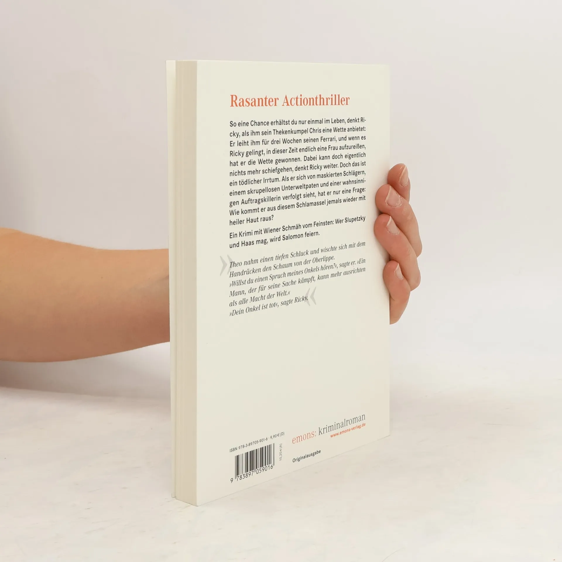 So eine Chance erhälst du nur einmal im Leben, denkt Rcky, alsihm sein Thekenkumpel Chris eine Wette anbietet: Er leiht ihm für drei Wochen seinen Ferrari, und wenn es Ricky gelingt, in dieser Zeit endlich gelingt, in dieser Zeit eine Frau aufzureißen, hat er die Wette gewonnen. Dabei kann doch eigentlich nichts mehr schiefgehen, denkt Ricky weiter. Doch das ist ein tödlicher Irrtum. Als er sich von maskierten Schlägern, einem skrupellosen Unterweltpaten und einer wahnsinnigen Auftragskillerin verfolgt sieht, hat er nur eine Frage: Wie kommt er aus dem Schlamassel jemals wieder mit heiler Haut raus? Ein Krimi mit Wiener Schmäh vom Feinsten: Wer Slupetzky und Hass mag, wird Salomon lieben.