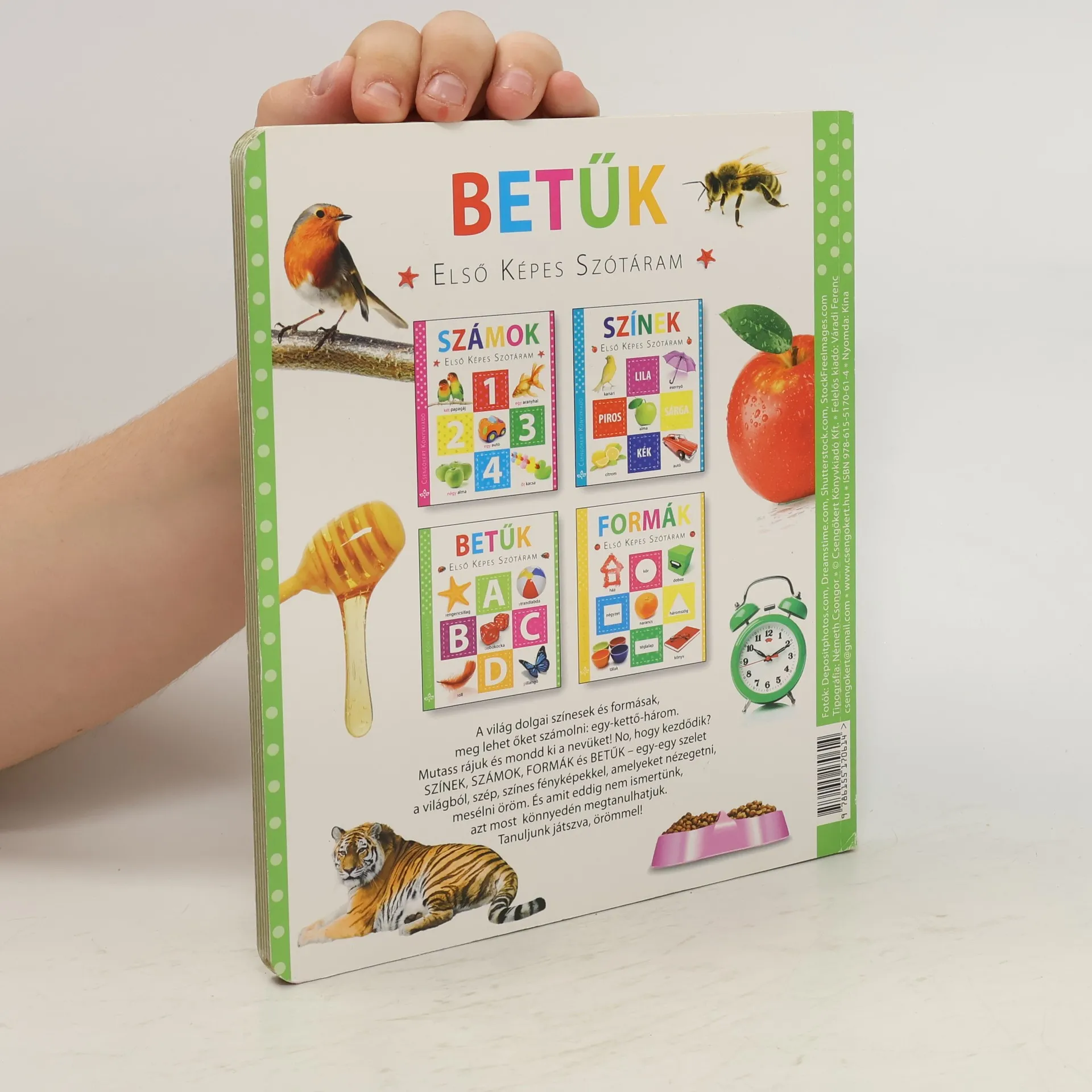 A világ dolgai színesek és formásak, meg lehet őket számolni: egy-kettő-három. Mutass rájuk és mondd ki a nevüket! No, hogy kezdődik? SZÍNEK, SZÁMOK, FORMÁK és BETŰK – egy-egy szelet a világból, szép, színes fényképekkel, amelyeket nézegetni, mesélni öröm. És amit eddig nem ismertünk, azt most könnyedén megtanulhatjuk. Tanuljunk játszva, örömmel!