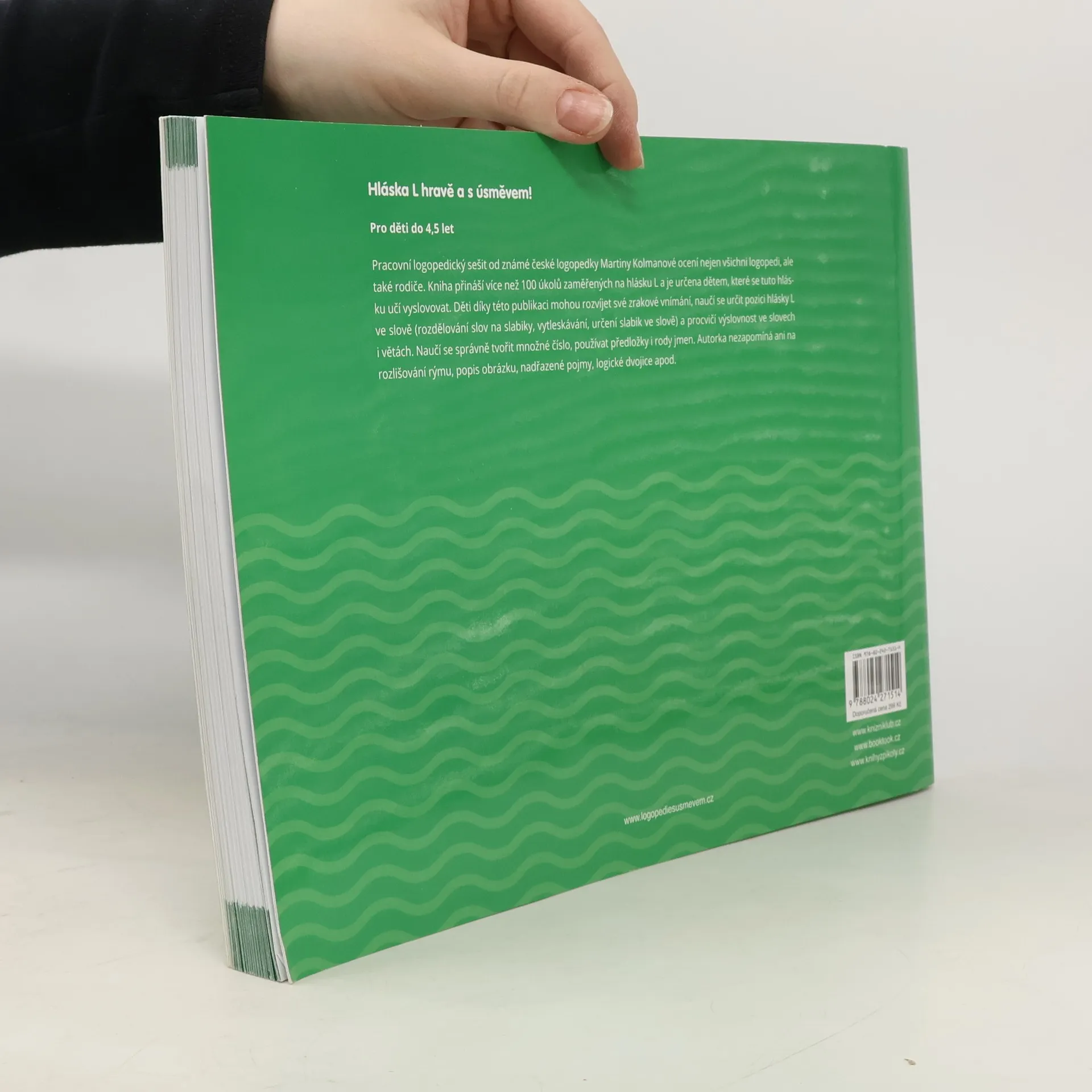 Pracovní logopedický sešit od známé české logopedky Martiny Kolmanové ocení nejen všichni logopedi, ale také rodiče. Kniha přináší více než 100 úkolů zaměřených na hlásku L a je určena dětem, které se tuto hlásku učí vyslovovat. Děti díky této publikaci mohou rozvíjet své zrakové vnímání, naučí se určit pozici hlásky L ve slově (rozdělování slov na slabiky, vytleskávání, určení slabik ve slově) a procvičí výslovnost ve slovech i větách. Naučí se správně tvořit množné číslo, používat předložky i rody jmen. Autorka nezapomíná ani na rozlišování rýmu, popis obrázku, nadřazené pojmy, logické dvojice apod.