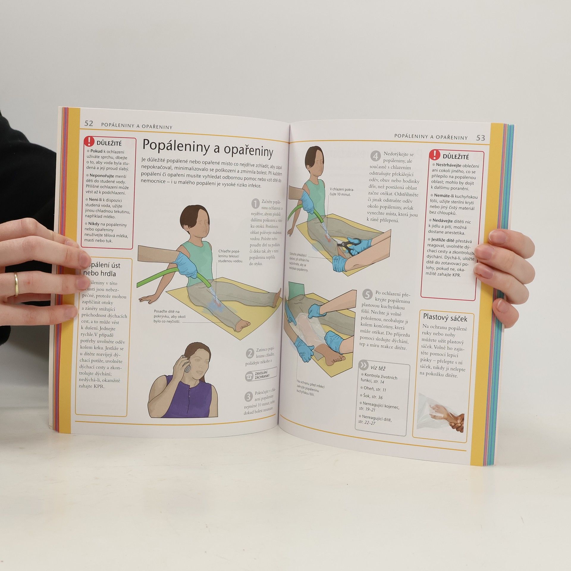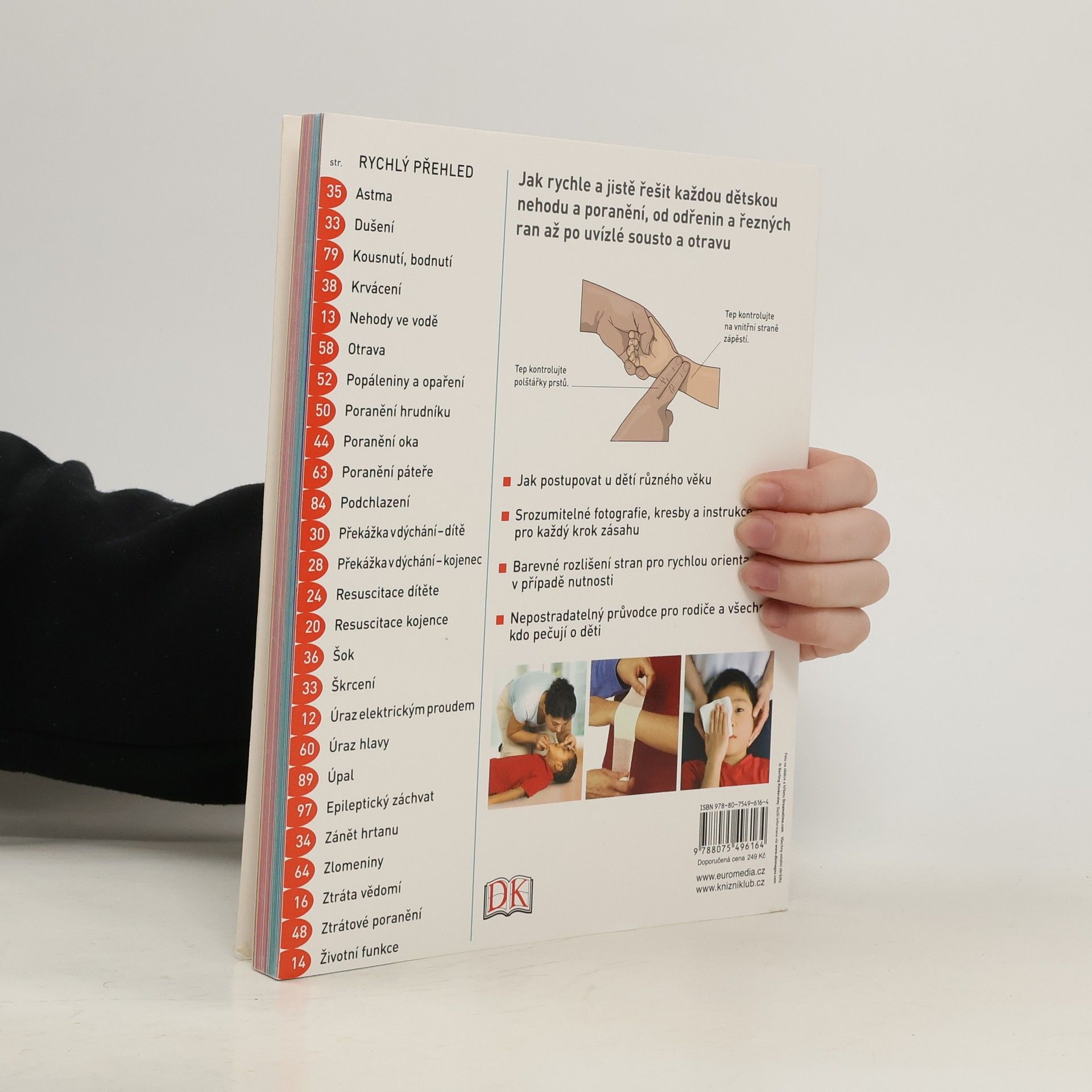 Drobná poranění a lehké nemoci jsou součástí dětství, vážnější úrazy a choroby jsou naštěstí jen vzácné. Ať ale dojde k jakékoliv nehodě, je důležité poskytnout tu nejlepší možnou první pomoc. To může nejen zachránit život, ale pravděpodobně to také zmírní případné následky a přispěje k lepšímu průběhu zotavení. Publikace přináší nejnovější zásady poskytování první pomoci v případech ohrožení života, stejně jako rady, jak se vypořádat s méně závažnými zraněními a nemocemi. Názorné fotografie a ilustrace krok za krokem přibližují každou fázi péče, takže si snadno poradíte se vším, od pořezání a odřenin až k dušení či otravě dítěte. Stránky jsou navíc barevně označené, takže v případě potřeby rychle najdete, jak řešit právě ten problém, kterému zrovna čelíte.
