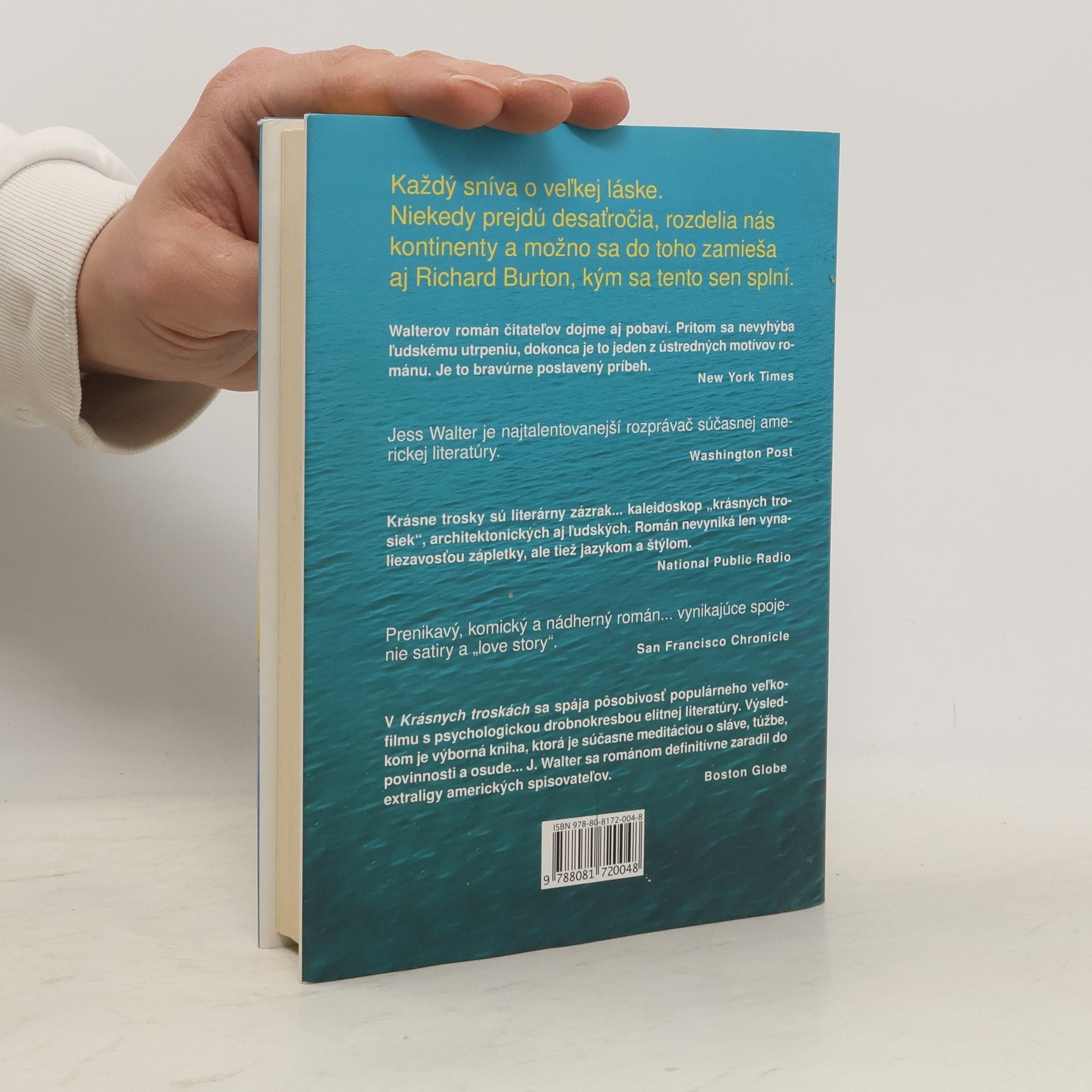 Rok 1962. V rybárskej dedinke na pobreží Ligúrskeho mora žije mladý Talian Pasquale so svojou matkou a hašterivou tetou. Dedičstvo po otcovi, chátrajúci hotel a azúrové oči, ho vedú k snu o turistickej destinácii pre Američanov. Jedného dňa do zátoky dorazí loď s americkou herečkou, ktorá sa cíti na pokraji smrti. Pasquale, očarený jej krásou, sa snaží zabezpečiť jej pohodlie a dokonca cestuje do Ríma, aby presvedčil muža, ktorý ju opustil, aby sa o ňu postaral. S herečkou prichádza do Porto Vergogna nový život a večne pijúci Richard Burton. O päťdesiat rokov neskôr sa v Hollywoode objaví starý Talian, ktorý pátra po tajomnej žene. Jess Walter majstrovsky prepletá osudy nezabudnuteľných postáv: romantického Pasqualea, sklamanej herečky Dee Moray, filmového producenta bojujúceho so starobou, jeho mladú asistentku, vojnového veterána píšuceho neexistujúci román a Richarda Burtona, ktorý opúšťa svoje filmové lásky. Ich cesty za snami ich obrali o ilúzie, až na konci zostali len „krásne trosky“. Walter patrí medzi popredných amerických spisovateľov, jeho dielo bolo preložené do 28 jazykov a získalo mnohé ocenenia vrátane Pulitzerovej ceny.