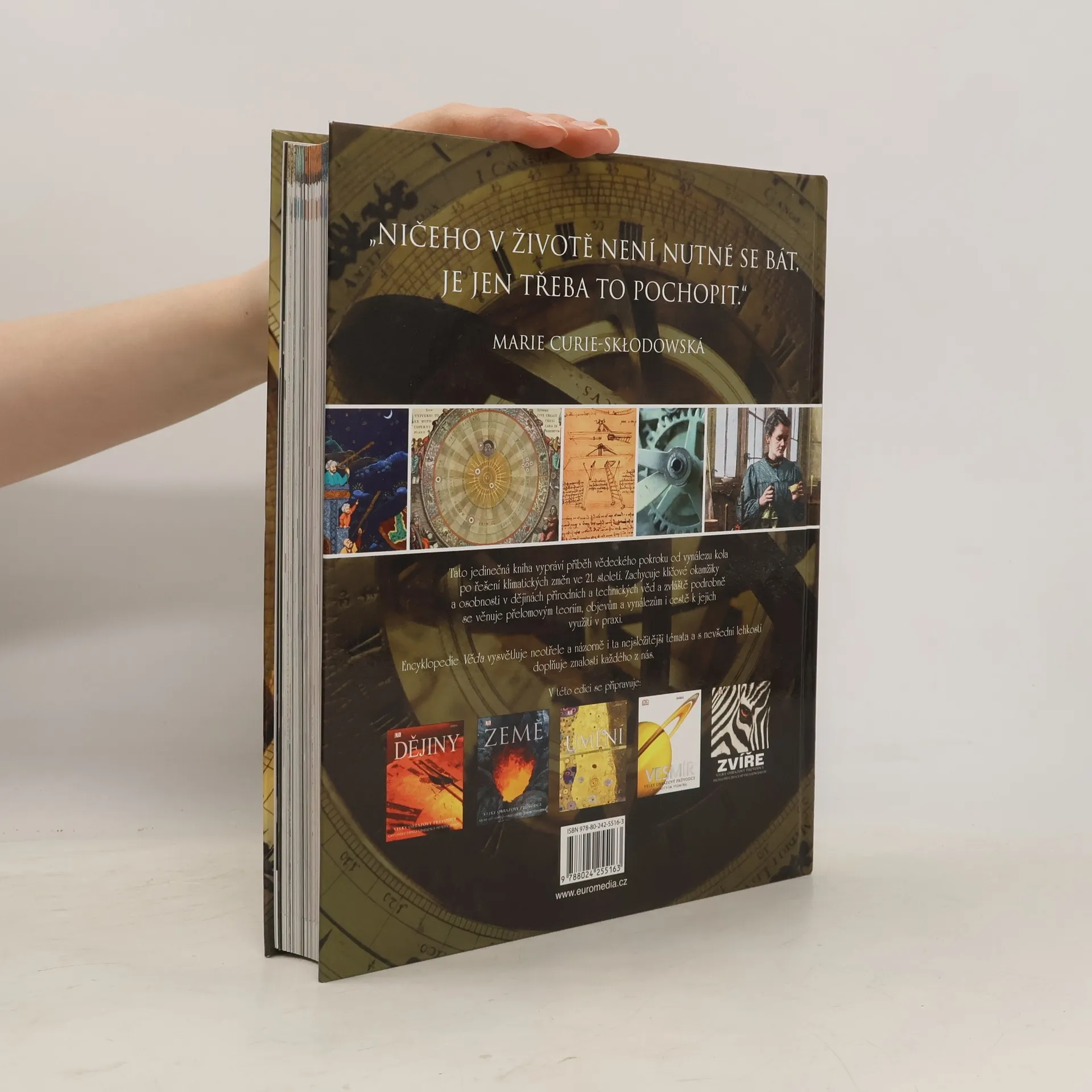Tato jedinečná kniha vypráví příběh vědeckého pokroku od vynálezu kola až po řešení klimatických změn ve 21. století. Zachycuje všechny klíčové okamžiky nových objevů a ukazuje, jak lidé a jejich myšlenky a vynálezy měnili náš svět. Encyklopedie Věda, vybavená nádhernými fotografiemi a názornými ilustracemi, představuje i ta nejsložitější témata jednoduchým a srozumitelným způsobem, zpřístupňujícím tak lidské vědění čtenářům všech věkových kategorií.