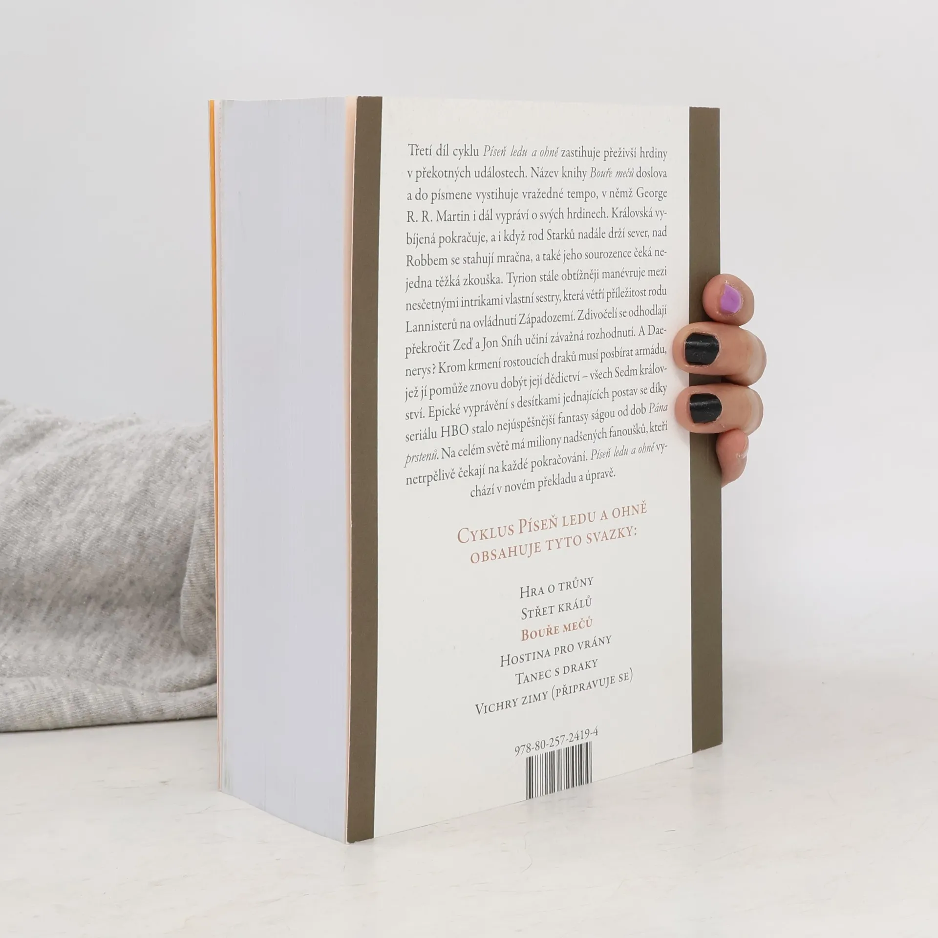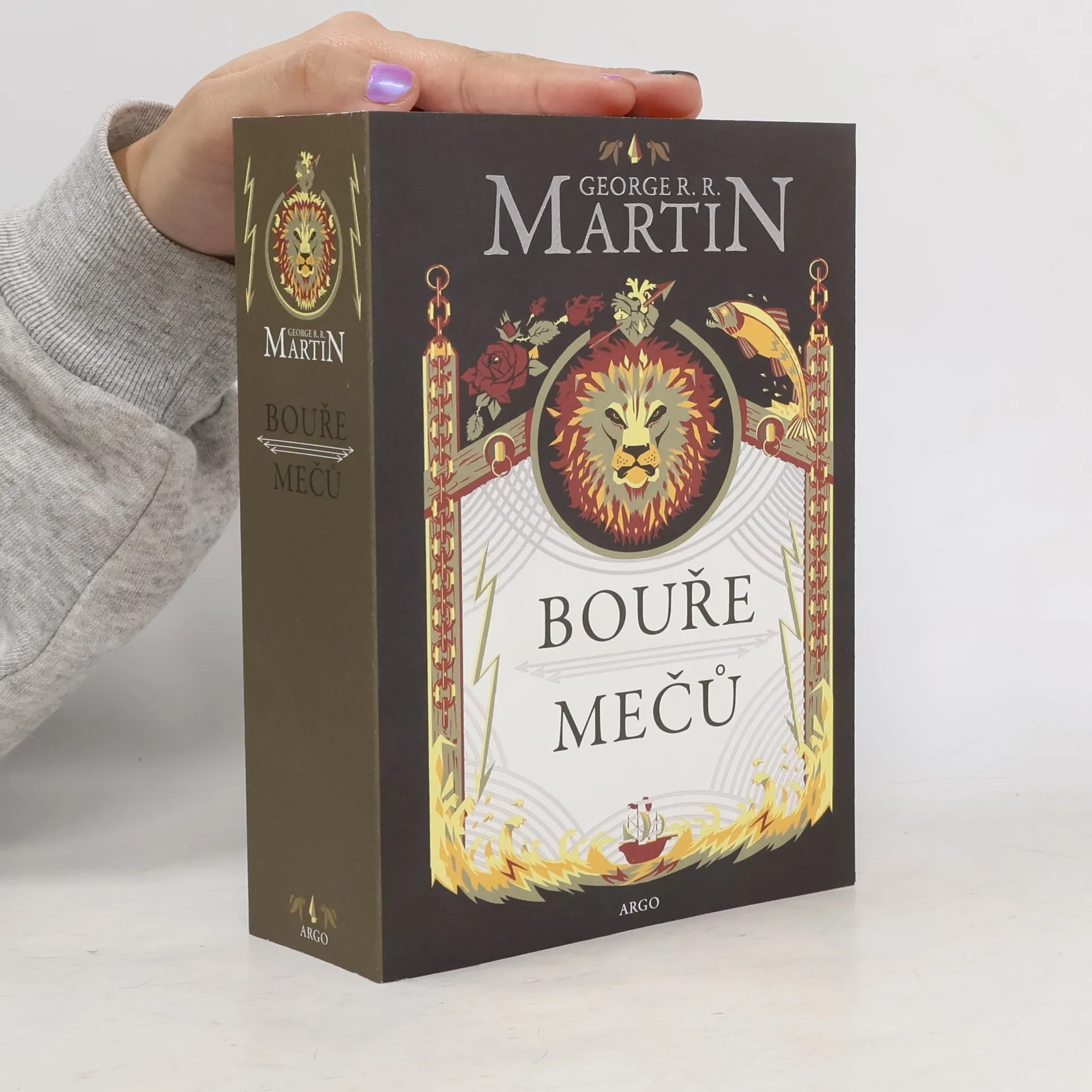Třetí díl cyklu Píseň ledu a ohně zastihuje přeživší hrdiny v překotných událostech. Název knihy Bouře mečů doslova a do písmene vystihuje vražedné tempo, v němž George R. R. Martin pokračuje ve svém vyprávění. Královská vybíjená pokračuje, a i když rod Starků nadále drží sever, nad Robbem se stahují mračna, a také jeho sourozence čeká nejedna těžká zkouška. Tyrion stále obtížněji manévruje mezi intrikami vlastní sestry, která větří příležitost rodu Lannisterů na ovládnutí Západozemí. Zdivočelí se odhodlají překročit Zeď a Jon Sníh učiní závažná rozhodnutí. A Daenerys? Krom krmení rostoucích draků musí posbírat armádu, jež jí pomůže znovu dobýt její dědictví – všech Sedm království. Epické vyprávění s desítkami jednajících postav se díky seriálu HBO stalo nejúspěšnější fantasy ságou od dob Pána prstenů. Na celém světě má miliony nadšených fanoušků, kteří netrpělivě čekají na každé pokračování. Píseň ledu a ohně vychází v novém překladu a úpravě.