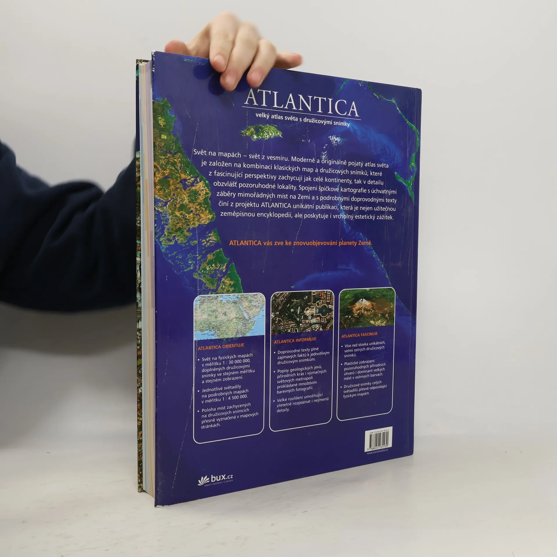 ATLANTICA vás zve ke znovuobjevování planety Země. Moderně a originálně pojatý atlas světa je založen na kombinaci klasických map a družicových snímků, které zachycují z fascinující perspektivy jak celé kontinenty, tak v detailu obzvlášť pozoruhodné lokality. Spojení špičkové kartografie s úchvatnými záběry mimořádných míst na Zemi a s podrobnými doprovodnými texty činí z projektu ATLANTICA unikátní publikaci, která je nejen vynikající zeměpisnou příručku, ale zároveň poskytuje i vrcholný estetický zážitek.