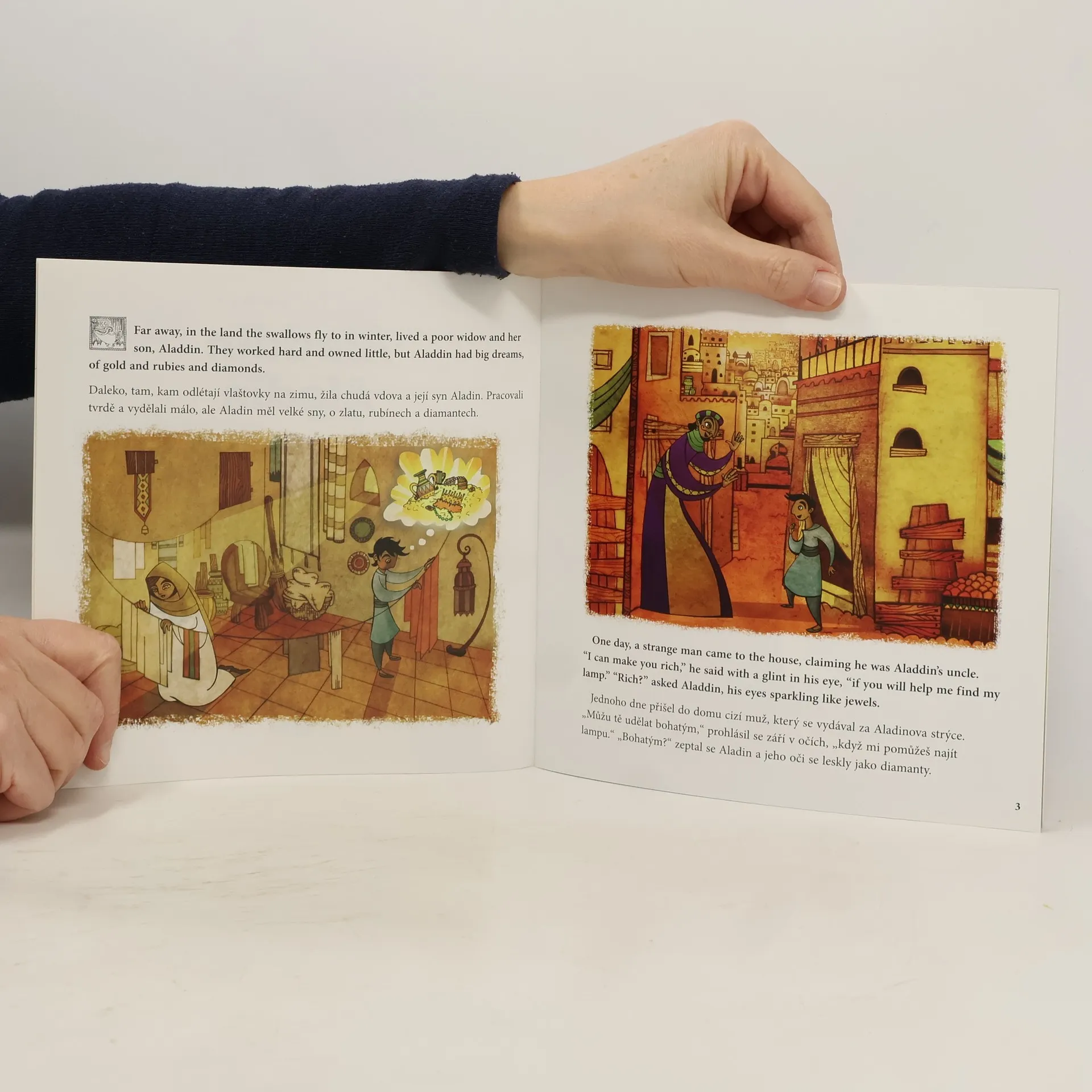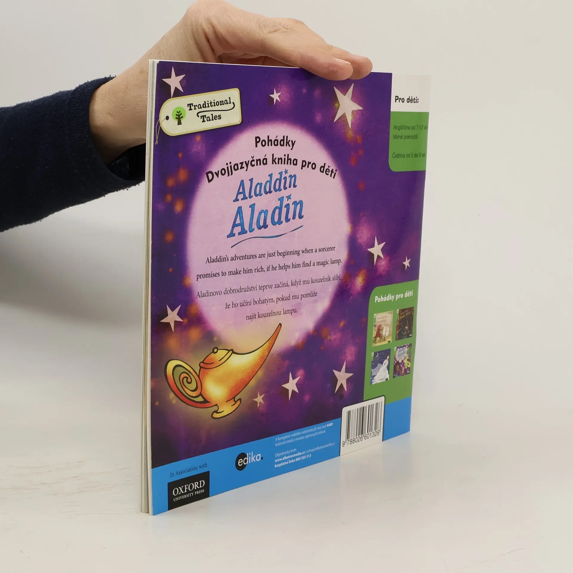 Aladin byl jedním z příběhů tisíce a jedné noci, ze souboru lidových pověstí z Blízkého východu shromážděného v průběhu mnoha staletí. Jako v každé správné pohádce i v naší vítězí dobro nad zlem. Napínavý příběh mohou číst děti samy, s rodiči anebo poslouchat ve formě mp3 namluvené rodilými herci, uložené na webu Albatros Media. Vydavatelství Edika připravilo ve spolupráci s Oxford University Press dvojjazyčné verze patnácti klasických pohádek. V angličtině jsou určeny pro čtenáře ve věku od 7 do 12 let.