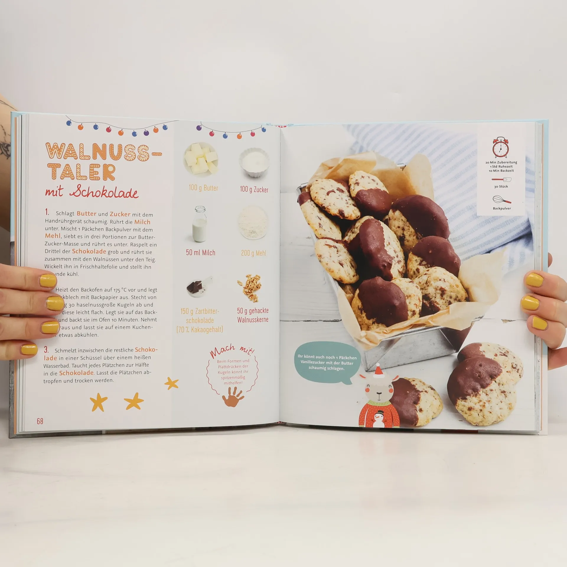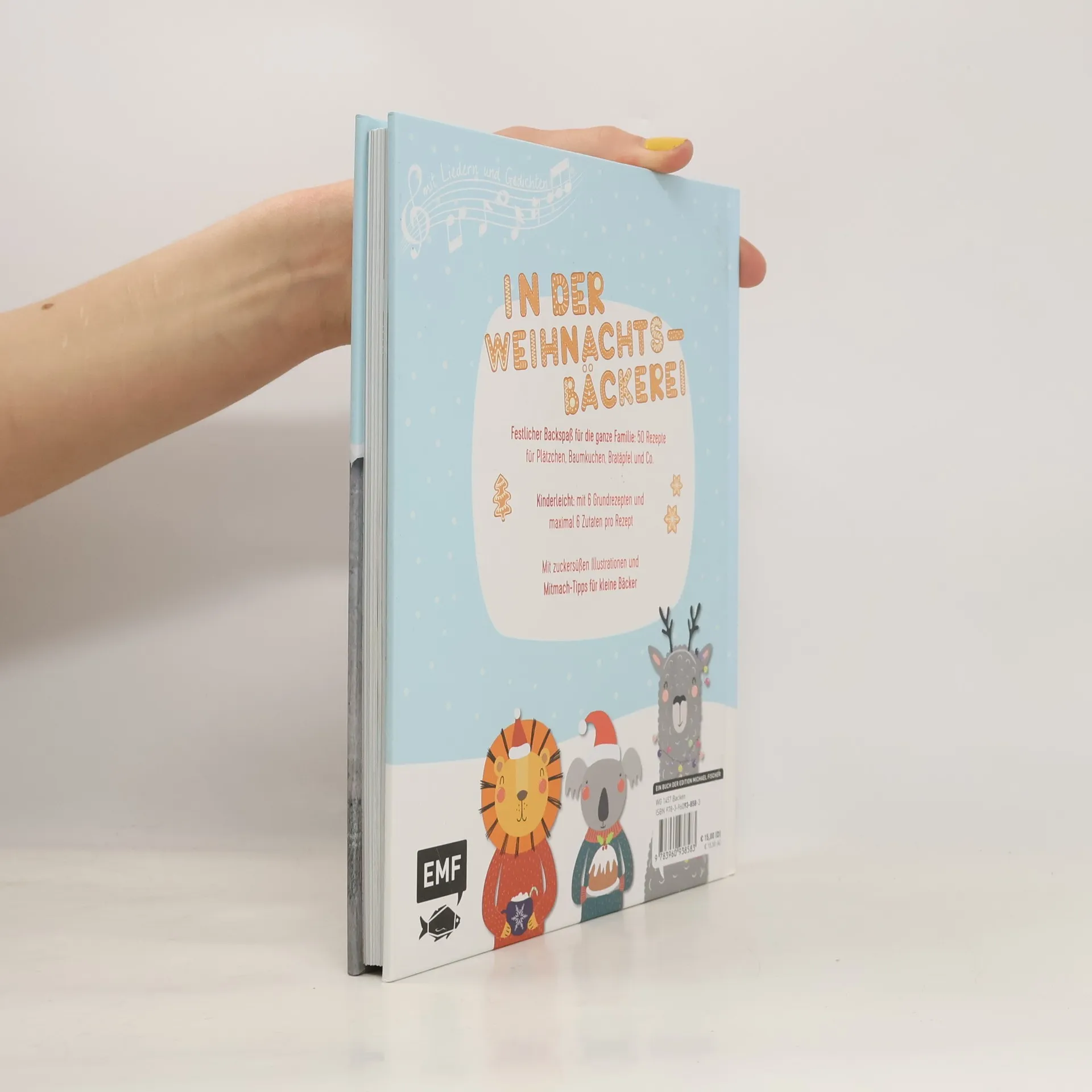 Bei diesem Weihnachtsbackbuch können schon die Kleinen prima mithelfen! Der Titel präsentiert 50 kinderleichte Rezepte für Plätzchen, Lebkuchen, Kuchen und Crumbles, die nur wenige Zutaten benötigen. Jedes Rezept zeigt eine bebilderte Liste mit maximal sechs Zutaten neben einer gut verständlichen Schrittanleitung. Symbole zeigen die Zubereitungszeit und die Menge der zu erwartenden Plätzchen, das "Mithelf-Icon" gibt an, wann die Kinder selbst kreativ werden können. Im Grundlagenteil finden sich neben allgemeinen Backtipps sechs einfache Grundrezepte für diverse Teigarten, danach folgen die ansprechend bebilderten Rezepte für Vanillekipferl, Bärentatzen, Blondies, Makronen, Ingwercookies, Madeleines, Walnusstarte, Zimtschnecken oder Anisplätzchen. Das können größere Kinder garantiert schon ganz alleine! Ein paar Weihnachtslieder und -gedichte lassen die Wartezeit überbrücken, während das Gebäck im Backofen Weihnachtsduft verbreitet