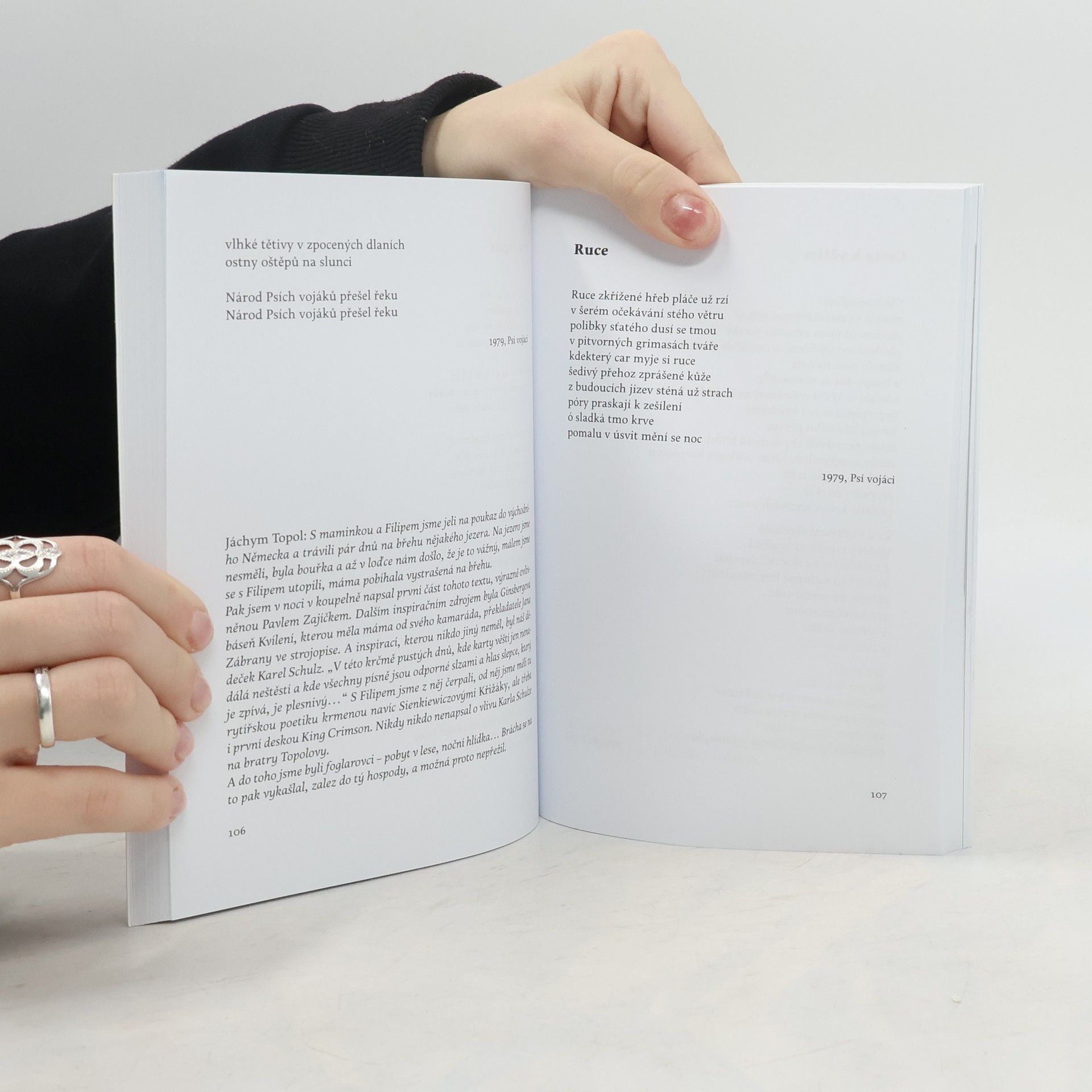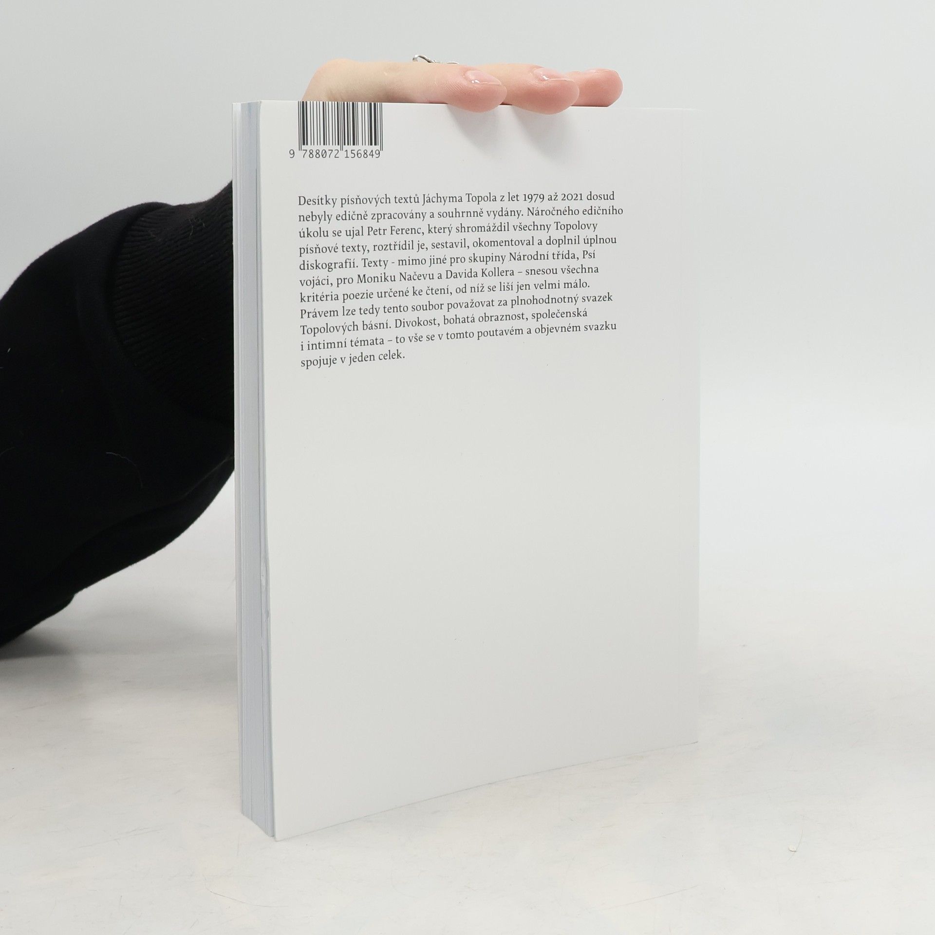 Písňové texty a zhudebněné básně 1979 - 2021. Desítky písňových textů Jáchyma Topola z let 1979 až 2021 dosud nebyly edičně zpracovány a souhrnně vydány. Náročného edičního úkolu se ujal Petr Ferenc, který shromáždil všechny Topolovy písňové texty, roztřídil je, sestavil, okomentoval a doplnil úplnou diskografií. Topolovy písňové texty - mimo jiné pro skupiny Národní třída, Psí vojáci, pro Moniku Načevu a Davida Kollera - snesou všechna kritéria poezie určené ke čtení, od níž se liší jen velmi málo. Právem lze tedy tento svazek považovat za plnohodnotný svazek Topolových básní. Divokost, bohatá obraznost, společenská i intimní témata – to vše se spojuje v tomto velmi poutavém a objevném svazku v jeden celek. Text doprovází množství dobových fotografií.