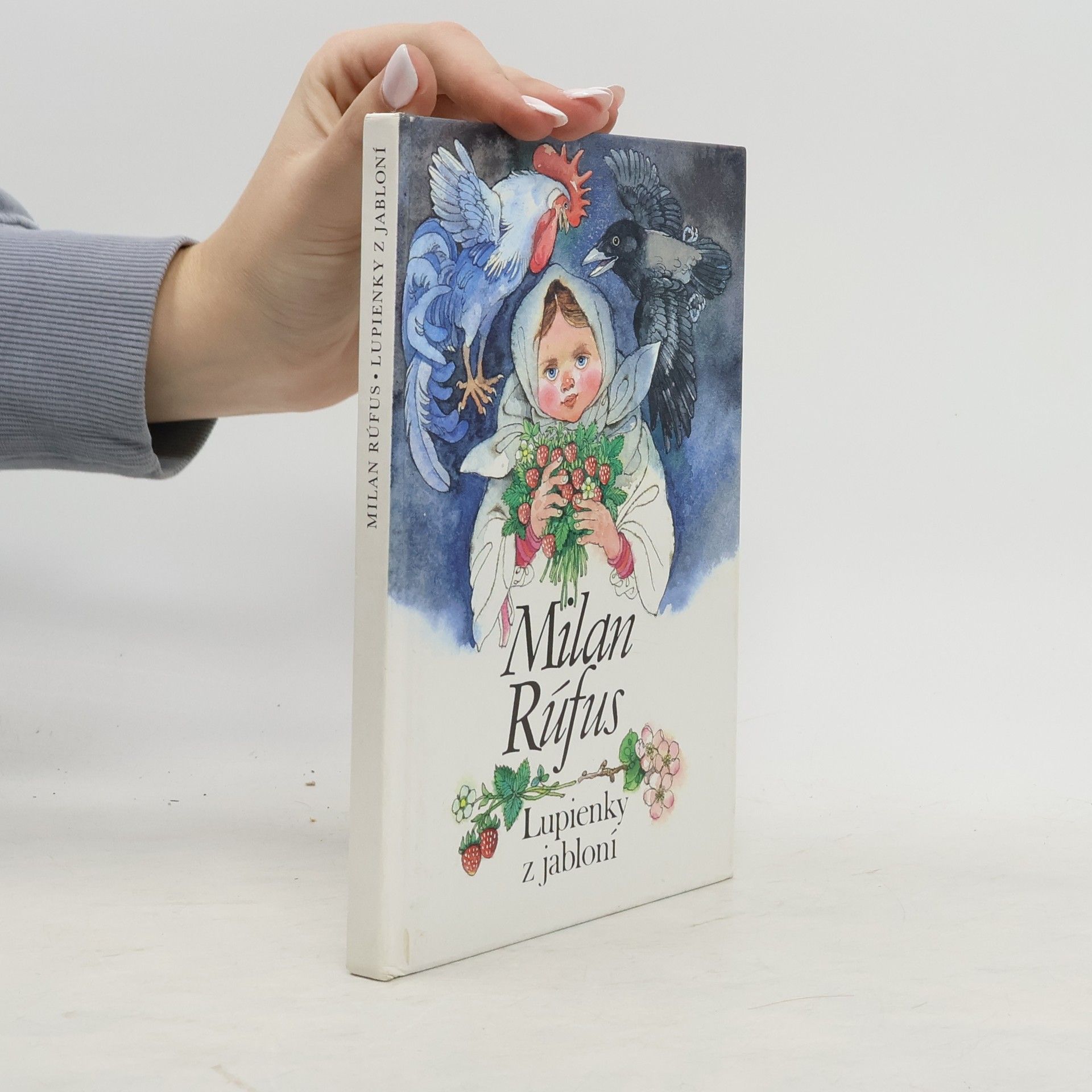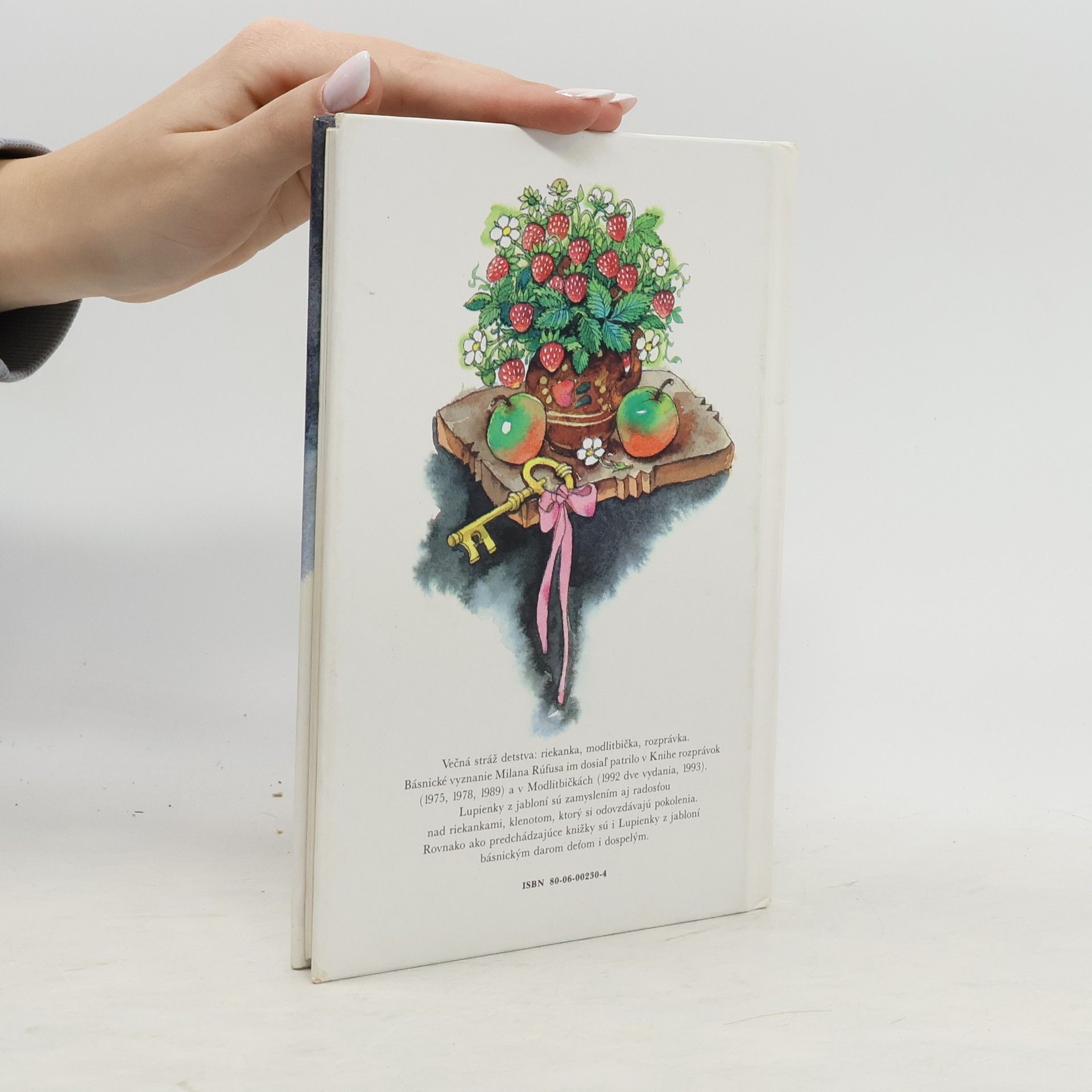 "Večná stráž detstva: riekanka, modlitbička, rozprávka. Básnické vyznanie Milana Rúfusa im dosiaľ patrilo v Knihe rozprávok (1975, 1978, 1989) a v Modlitbičkách (1992 dve vydania, 1993). Lupienky z jabloní sú zamyslením aj radosťou nad riekankami, klenotom, ktorý si odovzdávajú pokolenia. Rovnako ako predchádzajúce knižky sú i Lupienky z jabloní básnickým darom deťom i dospelým." (Text na zadnej strane knihy)