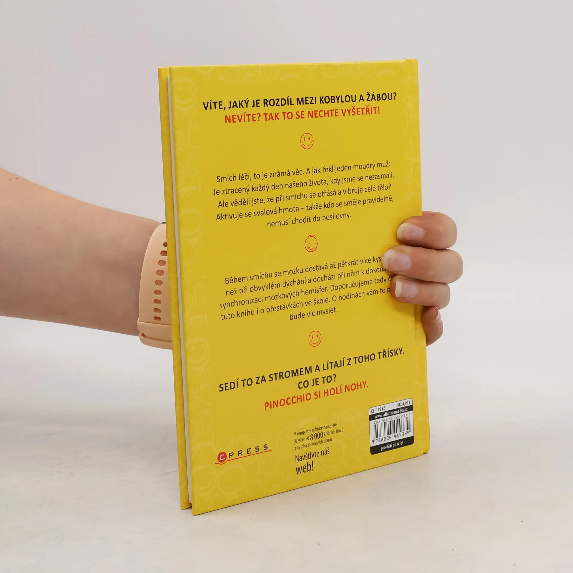 Víte, jaký je rozdíl mezi kobylou a žábou? Nevíte? Tak to se nechte vyšetřit! Smích léčí, to je známá věc. A jak řekl jeden moudrý muž: Je ztracený každý den našeho života, kdy jsme se nezasmáli. Ale věděli jste, že při smíchu se otřásá a vibruje celé tělo? Aktivuje se svalová hmota – takže kdo se směje pravidelně, nemusí chodit do posilovny. Během smíchu se mozku dostává až 5 x více kyslíku než při obvyklém dýchání a dochází při něm k dokonalé synchronizaci mozkových hemisfér. Doporučujeme tedy číst tuto knihu i o přestávkách ve škole. O hodinách vám to pak bude víc myslet.