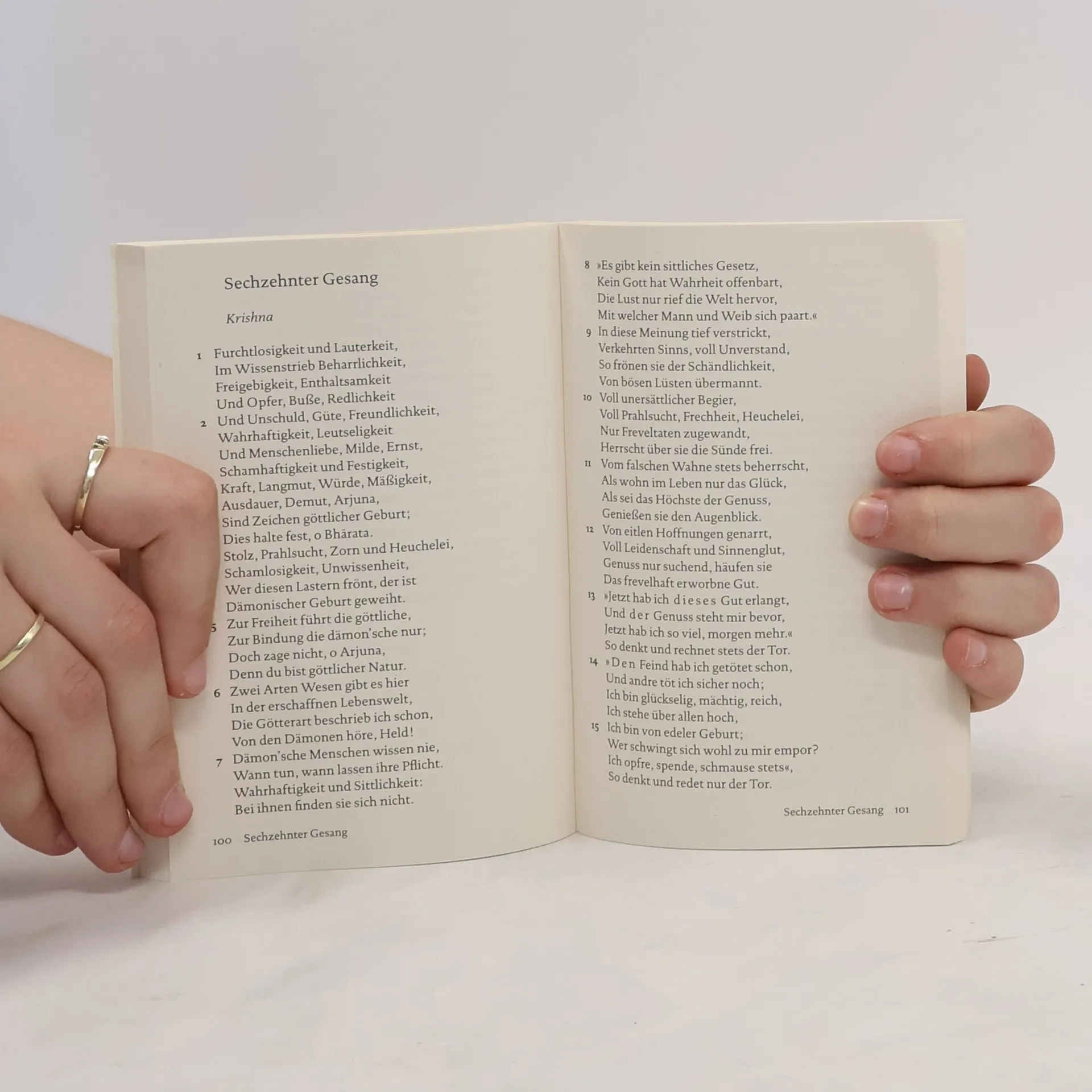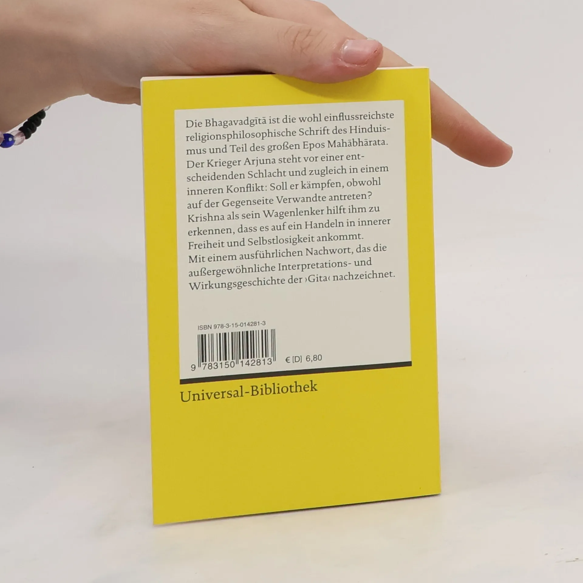 Die Bhagavadgita ist die zentrale Schrift des Hinduismus und ein spiritueller Begleiter für Menschen weltweit. Kurz vor einer Schlacht gibt der Gott Krishna dem Krieger Arjuna Antworten auf die großen Fragen des Wie verhalten wir uns richtig? Wie kann es gelingen, ein gutes und glückliches Leben zu führen?"Die Bhagavadgita ist das schönste, ja vielleicht das einzige wahrhaft philosophische Gedicht, das alle uns bekannten Literaturen aufzuweisen haben." – Wilhelm von Humboldt