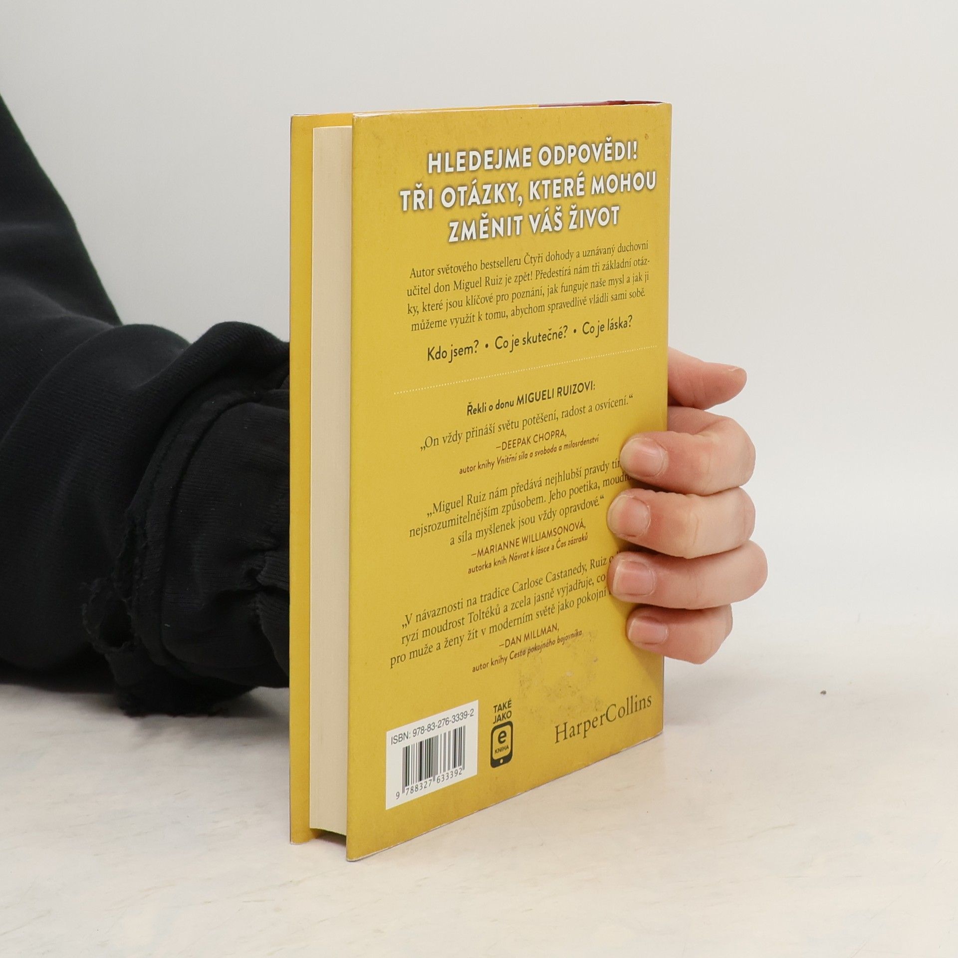 Hledejme odpovědi. Tři otázky, které mohou změnit váš život. • Kdo jsem? • Co je skutečné? • Co je láska? Autor světového bestselleru Čtyři dohody a uznávaný duchovní učitel don Miguel Ruiz nám předkládá tři základní otázky, které jsou klíčové pro poznání, jak funguje naše mysl a jak ji můžeme využít k tomu, abychom spravedlivě vládli sami sobě. Prostřednictvím těchto jednoduchých, ale nanejvýš důležitých otázek Miguel Ruiz postupně odkrývá nejrůznější klamy a sebeklamy, jimiž jako jednotlivci i jako lidstvo podléháme a jež jsou permanentním ( a podle všeho zbytečným) zdrojem naší duševní a tělesné nepohody či dokonce až utrpění.