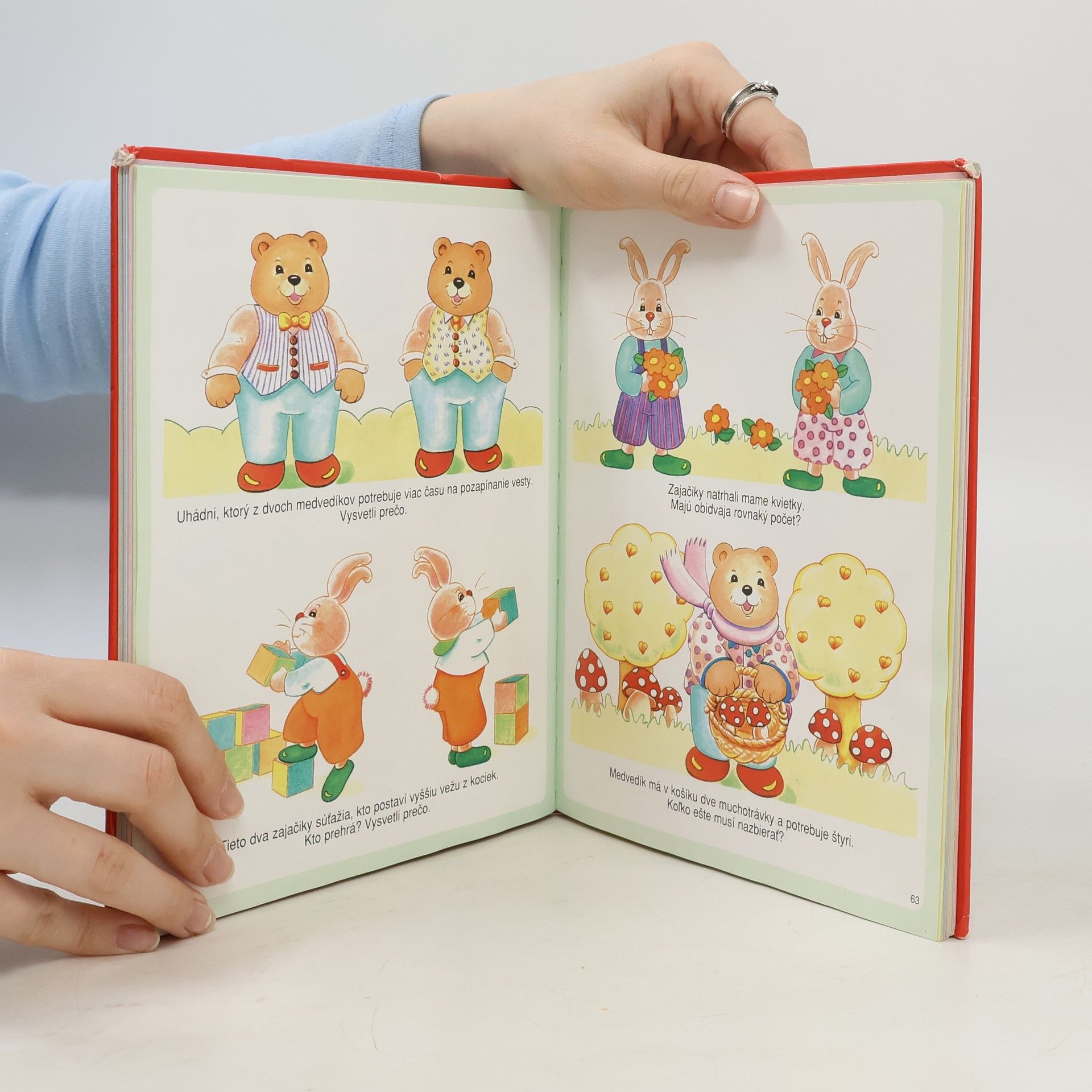 Táto príťažlivá kniha s výchovným zameraním je určená deťom od 3 do 6 rokov. Učí ich hravým spôsobom rozoznávať farby, čísla a niektoré hlásky aj písmená. S pomocou dospelých si deti vyskúšajú svoj postreh pri úlohách, kde napríklad zisťujú spoločné i odlišné znaky vecí a podľa toho ich zoraďujú do skupín. Prostredníctvom tejto knihy môžu rodičia rozvíjať schopnosti svojich detí a tešiť sa z ich pokrokov.