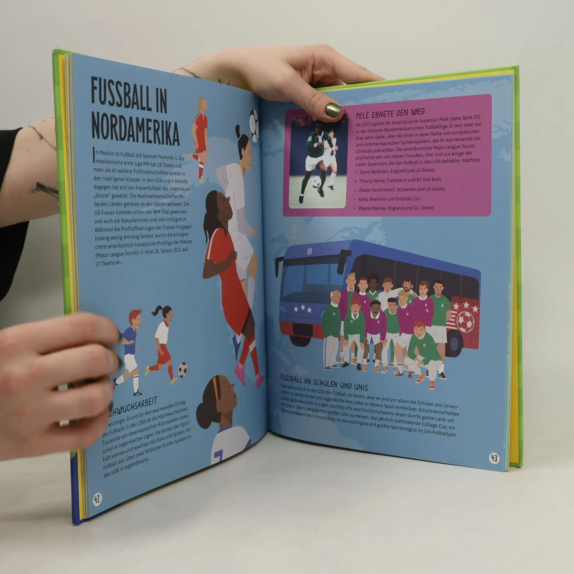 Eine spannende Reise rund um die Welt des Fußballs Wo fand schon überall eine Fußball-WM statt? Welche internationalen Fußballstars kommen aus Südamerika? Aus welchem Land stammt das erfolgreichste Frauenfußballteam des afrikanischen Kontinents? Entdecke die ganze Vielfalt der Fußballwelt und erfahre alles über nationale und internationale Wettbewerbe, erkunde die tollsten Stadien rund um den Globus und triff die besten Spielerinnen und Spieler der Welt. Eine spannende und witzige Reise rund um das rollende Leder über alle Kontinente! "Das Runde muss ins Eckige" ´lautet eine bekannte Fußballweisheit. Mit diesem Buch ist es tatsächlich gelungen, die ganze bunte und vielfältige Welt des Fußballs zwischen zwei rechteckigen Buchdeckeln unterzubringen. Die Reise führt quer über alle Kontinente zu fußballbegeisterten Menschen und begnadeten Spielerinnen und Spielern wie Megan Rapinoe, Lionel Messi oder Robert Lewandowski, aber auch zu wahren Legenden wie Pelé, Birgit Prinz oder Roger Milla. Nationale Ligen und kontinentale Pokale werden ebenso vorgestellt, wie Weltmeisterschaften und Weltstars. Fußballfans besuchen mit diesem Buch die tollsten Stadien der Welt, erkunden die Geschichte des runden Leders und lernen Varianten wie Motoball, Beachsoccer oder E-Rolli-Fußball kennen. Die Welt ist ein großes buntes Fußballfest und dieses Buch ist der passende Reiseführer dazu.