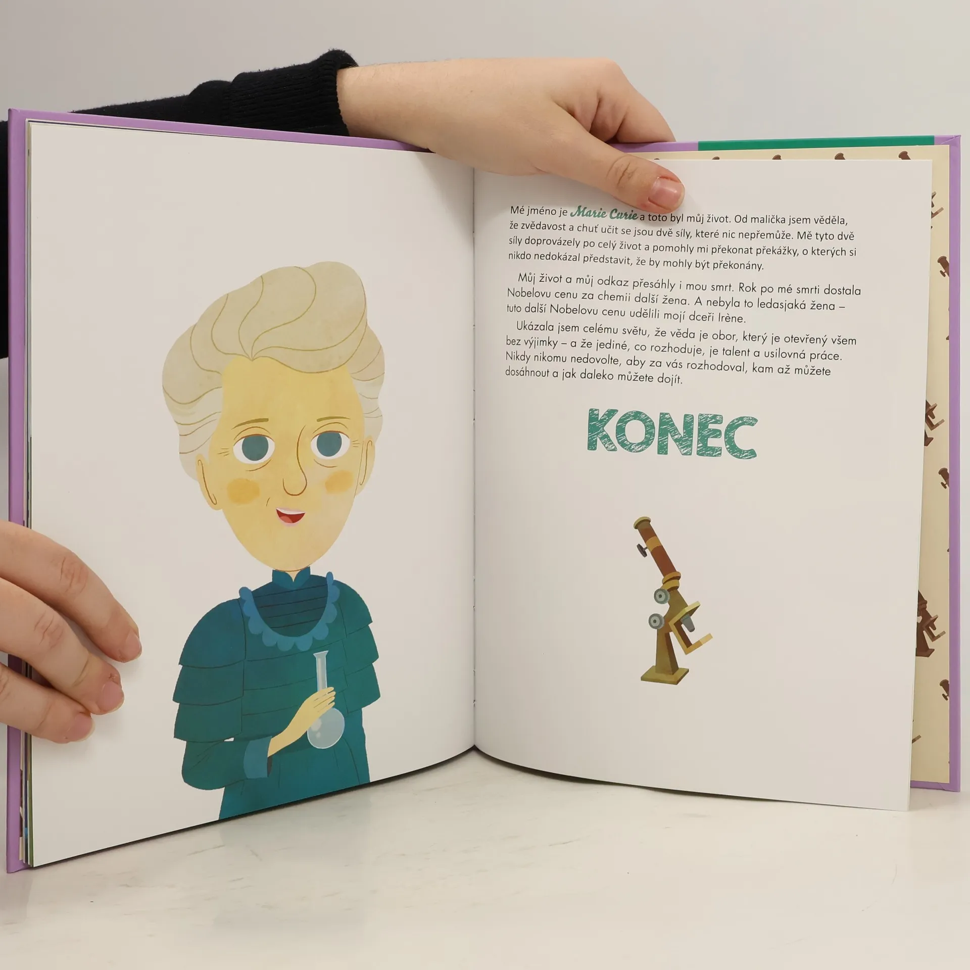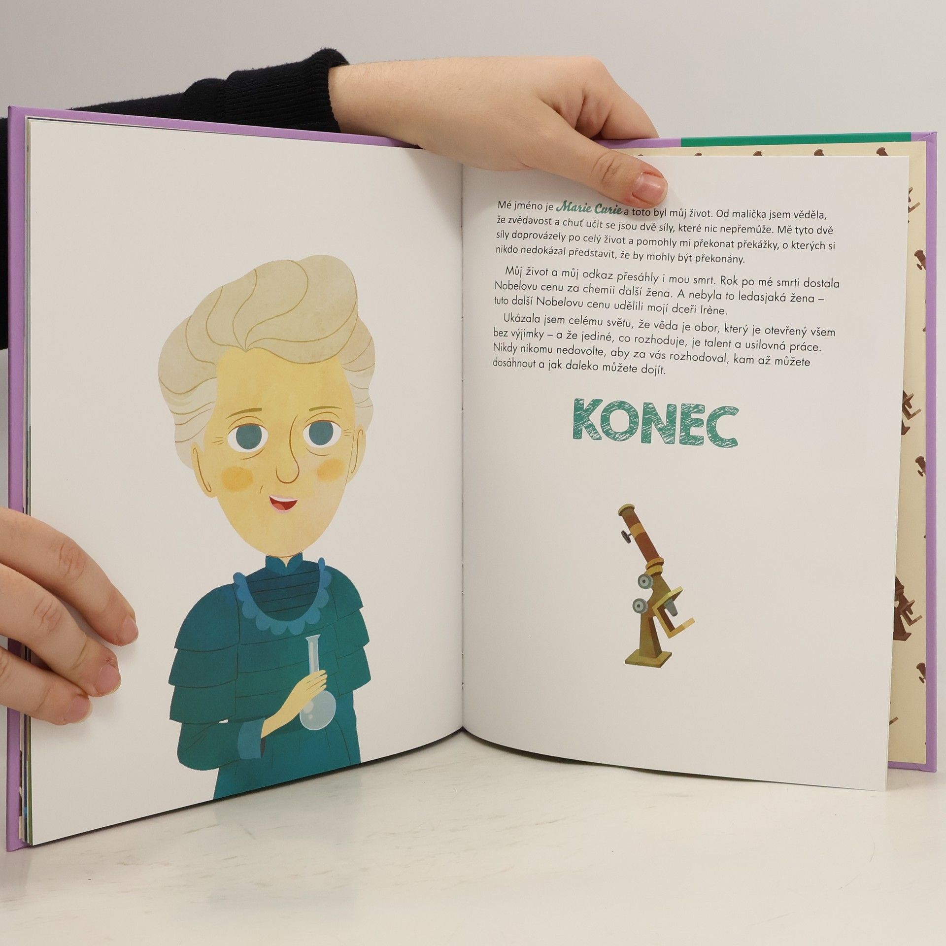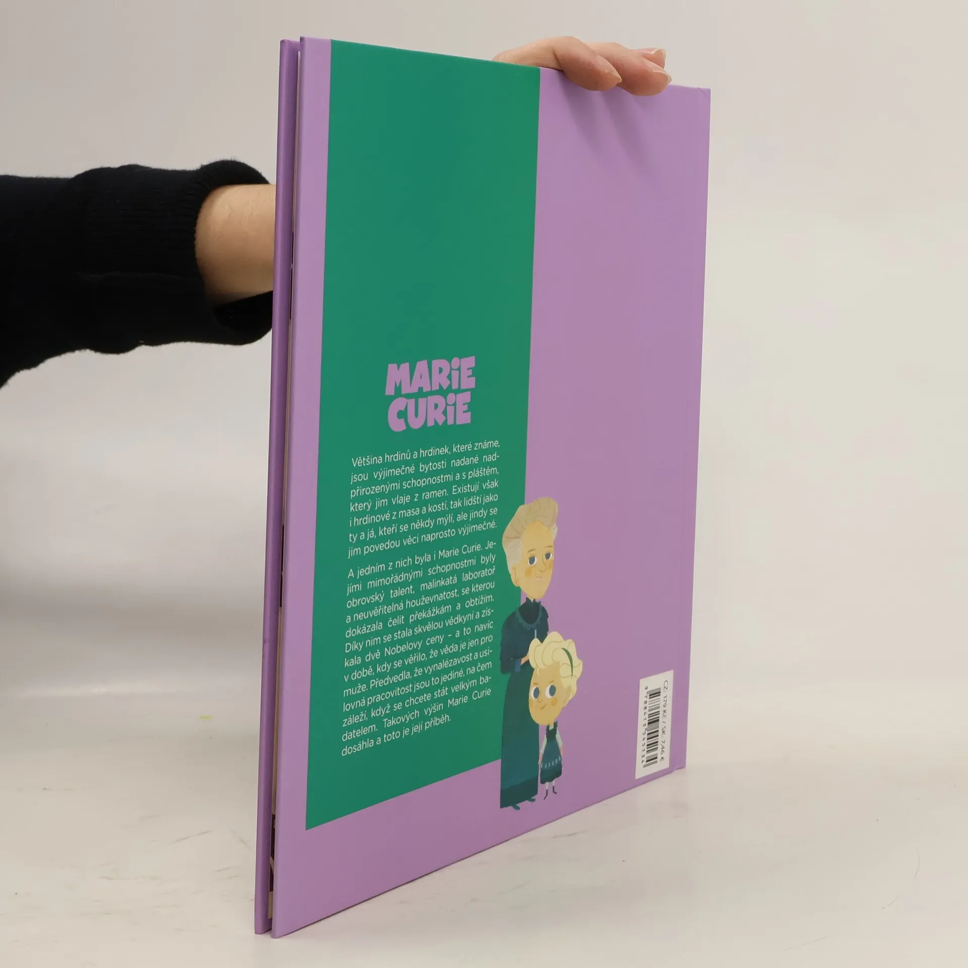 Většina hrdinů, které známe, jsou výjimečné bytosti nadané nadpřirozenými schopnostmi, s pláštěm, který jim vlaje z ramen. Existují však i hrdinové z masa a kostí, tak skuteční jako ty a já, kteří se někdy mýlí, ale jindy se jim povedou věci naprosto výjimečné. A taková byla i Marie Curie. Její mimořádnou schopností byl obrovský talent a také neuvěřitelná houževnatost, se kterou dokázala čelit překážkám a obtížím. Díky nim se stala skvělou vědkyní a získala dvě Nobelovy ceny – navíc v době, kdy byla věda jen pro muže. Marie Curie prokázala, že vynalézavost a usilovná pracovitost jsou to jediné, na čem záleží, když se chcete stát úspěšnou vědkyní. Takových výšin Marie Curie dosáhla a toto je její příběh.